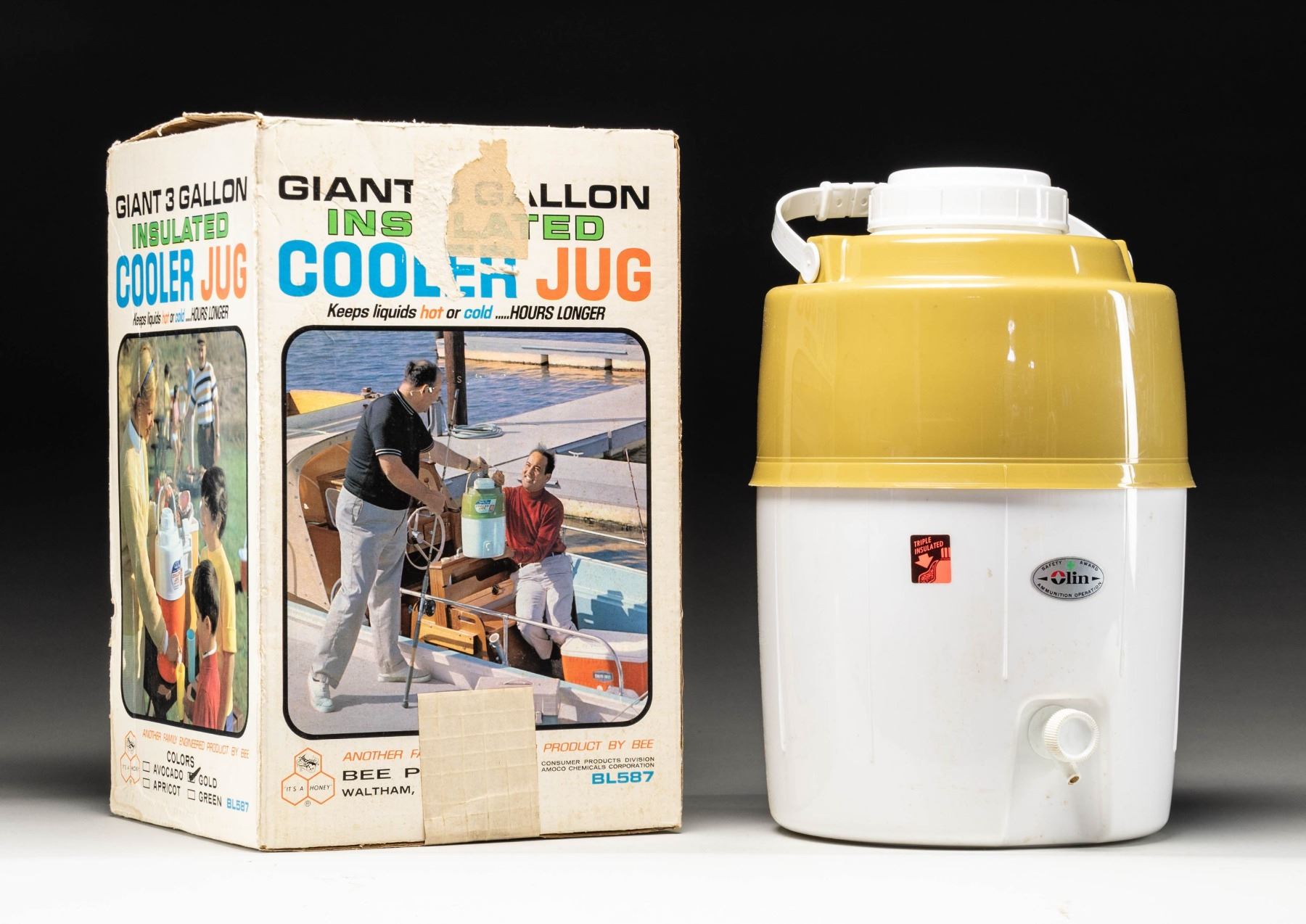 Gold & white colored cooler mfg. by Olin Corp w/ box. CONDITION: box in fair condition with wear & tears. Jug shows stains. PROVENANCE: Norman Olliff Estate. (02-25719/MD). NON-GUN. $25-50.