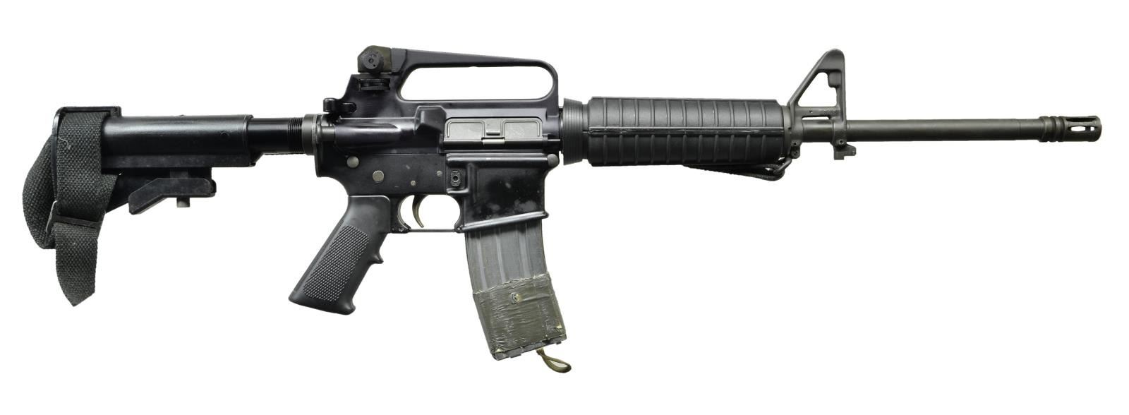 Cal. .223. S#H0894.  Bbl.16"  An Olympic Arms M4'ish variant of the Black Rifle. Barrel terminated w/ A2 flash hider. Traditional gas block / front sight / bayonet lug sports correct bayonet lug & protected post front sight. 6" A2 carbine handguards, retained w/ tapered delta ring. Carry handle upper receiver w/ brass deflector & round forward assist. A2 rear peep sight, adjustable for windage & elevation. Left side controls. 3 position plastic shoulder stock. SP1 cut bolt carrier. Currently sporting black nylon sling. MAGS: 1 Parsons 30rd. aluminum.  CONDITION: Dark black finish on lower receiver w/ a little lighter anodized finish on upper receiver. Receivers & furniture wear a few light spots but no obvious scratches or signs of heavy use. Magazine has a home made duct tape & paracord pull device. Bright bore w/ sharp rifling. Fire control mechanism appears to function correctly when cycled by hand. (22-4115/JZ). MODERN. $600-900.