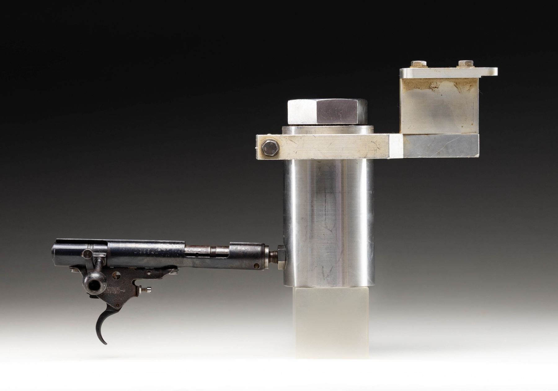 .22 LR PRESSURE TESTING UNIT. Cal. .22 LR. S# D35541. Bbl. N/A. .22 LR pressure test unit for a Winchester Model 320 .22 LR bolt action rifle. Left side of the receiver is marked with the Winchester trademark logo above "OMARK AUSTRALIA LTD./ AUSTRALIA", with the S# marked on the right. Right side of the trigger assembly housing is marked "OVERTRAVEL/ ADJUSTMENT". Receiver and bolt handle assembly exhibit a blue finish, with the bolt body being polished in-the-white. Receiver is fitted with a steel adapter (stamped with a partially visible encircled "WP" proof), which affixes it the the heavy stainless steel pressure test unit. Pressure test unit features a threaded port on the left side of the body, with a mounting bracket assembly present at the top. CONDITION: receiver retains the majority of its original finish, showing scattered spots of light to mild surface oxidation, light pitting, as well as some oxidative finish loss. Bolt handle shows areas of wear and light pitting that are fading to gray patina, with the bolt body exhibiting areas of light pitting, oxidative etching, and age related discoloration. Proper manual mechanics. Pressure test unit shows scattered marks, dings, and impressions from handling and storage, but otherwise remains sound. PROVENANCE: From the PMRB Collection. (25-5893/MLW). MODERN. $100-200.