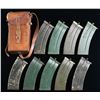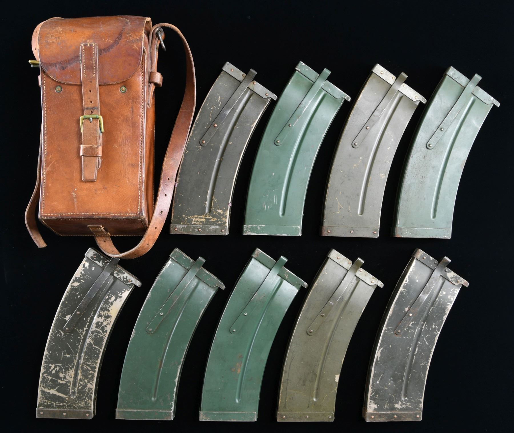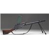 SAMPLE (KEEPER) MACHINE GUN. Cal: 8mm. S#. 1443. Bbl: 19". The Madsen Model 1950 was designed in 1950 w/ lineage going back to the very early 1900s. The first Madsen LMG model was designed in 1901. Since it was the first real Light Machine Gun, there was plenty of demand and it was sold to over 30 different countries in several different caliber configurations. The most common calibers encountered today are 30-06 or 8mm Mauser. It has a very unique operating system that is similar to the Martini Henry. The bolt only travels a little over an inch rearward, yet it will still accommodate a 3" long cartridge. The design is conducive to modularity, using a quick change barrel and a magazine without feed lips that could be used w/ numerous cartridges. It has a heavy finned bbl. that resides inside a slotted, ventilated barrel shroud. The shroud is terminated w/ an external thread for use w/ a muzzle brake that can double as a rate increaser w/ the use of an insert. Rear of the front sight is a folding bipod. Front sling swivel located about half-way between barrel shroud & receiver. The rear sling swivel is located below the front of the shoulder stock. Currently sporting brown leather sling. Carry handle on bbl shroud in front of rear sight. Sights consist of protected front blade, and elevation adjustable tangent rear sight marked from 200 meters to 1900 meters. All exposed metal surfaces have dark black enamel finish. Wooden rear butt stock w/ socket on bottom for a monopod. Ejection port dust cover beneath action open automatically upon charging or firing. Markings include The Portuguese Contract Crest on left side of receiver. Many markings matching numbers & filled w/ white for an attractive contrast, making them easy to read. MAGS: 10 steel 30 rd. UNATTACHED ACCESSORIES: Leather mag. pouch for 4 mags. CONDITION: Finish is complete & consistent w/ some thinning & drag lines usually associated w/ vertical rack storage & primarily on barrel shroud. Wood furniture has period typical impressions and remains structurally solid. Bore is quite bright w/ strong rifling. Fire control mechanism appears to function correctly when cycled by hand. PRE-86 DEALER SAMPLE (KEEPER). NATIONAL FIREARMS ACT MG REQUIRING BATF TRANSFER BEFORE TAKING POSSESSION. YOU MUST BE A CURRENT NFA/SOT DEALER IN ORDER TO TAKE POSESSION OF THIS FIREARM. PROVENANCE: From the Lifelong Collection of Brian Linde. (03-1835/JZ). CLASS 3. MODERN. $7,000-11,000.
