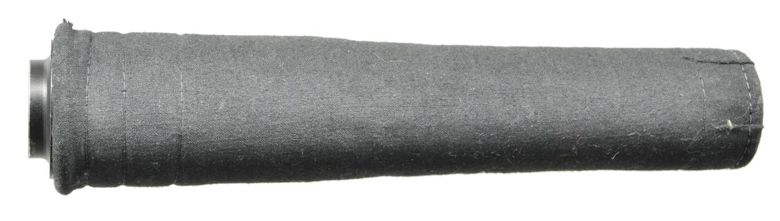 Cal. 9mm. S# S2-2002228. A classic M10/M11 sound suppressor from Military Armament Corporation. These early suppressors consisted of primarily a ported bbl. system & utilized fairly common materials such as screen door material combined w/ a massive amount of volume to achieve the lowest decibel rating possible. It wasn't uncommon for them to utilize flexible wipe material in the muzzle end to enhance performance. They had an overall length of approx. 11.5" starting w/ a 4" expansion chamber w/ an OD of almost 2.25". The main tube was approx. 1.75" in diameter. Marked w/ the early snake logo complete w/ factory neoprene heat cover. CONDITION: tube exterior still retains the 2 tone factory black finish. While coverage is consistent & complete, the muzzle end has a few wear marks where an improper wrench was utilized at some point. Original wipe material is oversized & quite hard, which is common w/ these early suppressors today. NATIONAL FIREARMS ACT SUPPRESSOR REQUIRING BATF TRANSFER BEFORE TAKING POSSESSION. FULLY TRANSFERABLE. (03-1548/JZ). MODERN CLASS III. $200-400.