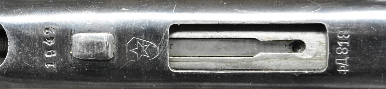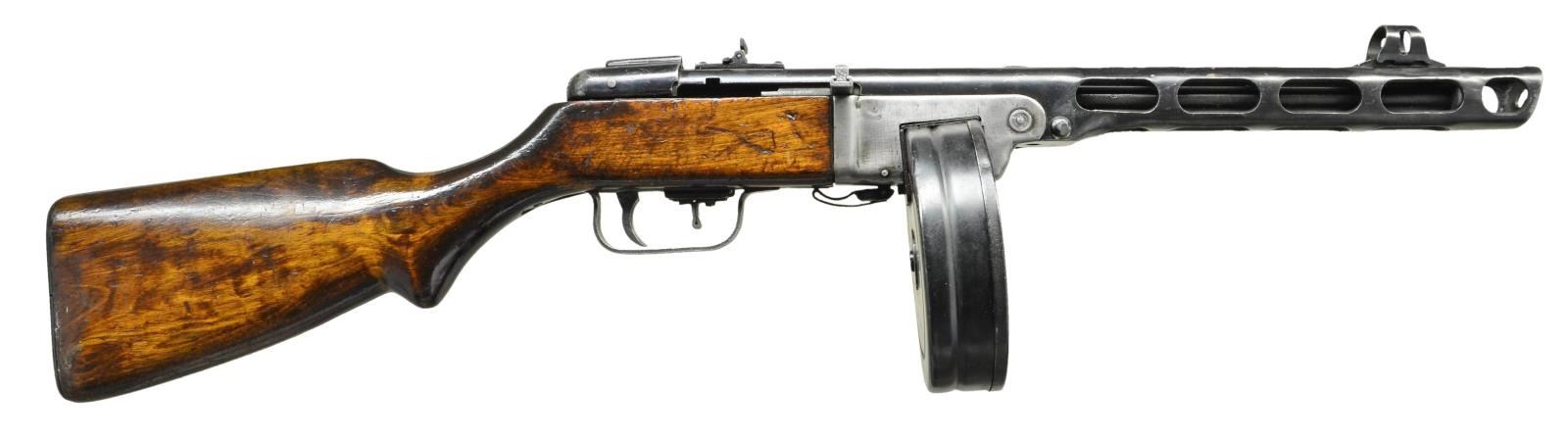 Cal. 7.62x25. S# 818. Bbl. 10.5". Manufactured in 1942. An original Russian PPSh-41 designed and developed in 1941. These were manufactured and utilized for the Russian military through the 1950s, and a primary Soviet military arm until being replaced with the AK-47 family. Chambered in the intermediate 7.62x25mm round and a longer barrel than the standard submachine gun, it proved to be useful at longer distances and it was extremely durable. Though it was built very rugged and proved to be a strong and reliable system on the battlefield, it was easy to duplicate and could be built by most industrial plants with ease. It was an open-bolt design which aided reliability though its rapid rate of fire, over 900 rpm, led to regular overheating. It utilized what would become an iconic slotted barrel shroud and heavy wooden stock, & unique top ejection port. Sights consisted of a hooded front post and duel rear notch marked "10" & "20". Blued finish on exposed metal surfaces aside from magazine well which retains a natural finish. It was fed from a curved 35 rd. stick magazine as well as a 71 rd. drum. Right side reciprocating charging handle. Left side sling attachment points. Wooden stock w/ metal buttplate & compartment for cleaning kit.  MAGS: 71 rd. drum. CONDITION: blued finish still enjoys the majority of coverage with expected thinning and scratches on an 80 year old military firearm. Stock bears numerous scratches and impressions while still retaining good finish. Trap door is still fully functional. Action is smooth. Bore is bright with sharp rifling. Fire control mechanism appears to function correctly when cycled by hand. NATIONAL FIREARMS ACT MG REQUIRING BATF TRANSFER BEFORE TAKING POSSESSION. FULLY TRANSFERABLE. (03-1565/JZ). CLASS 3, CURIO. $18,000-24,000.
