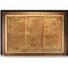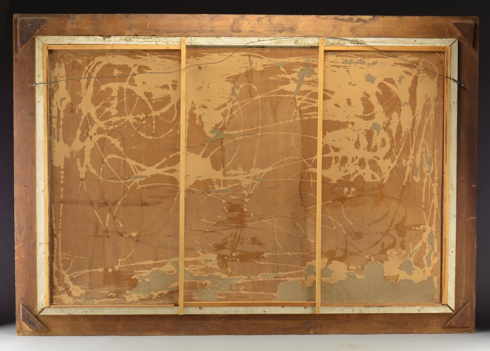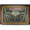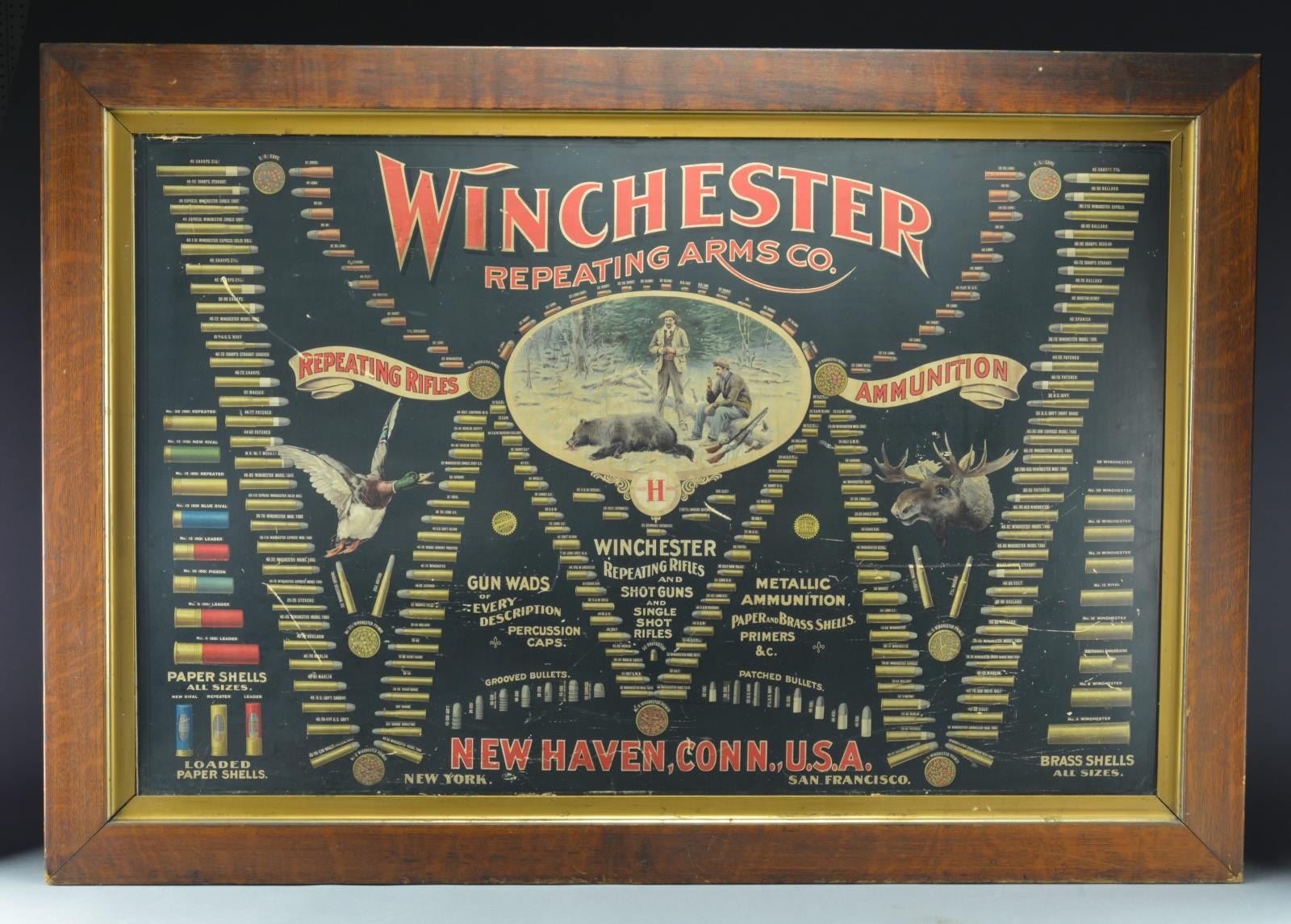 LITHOGRAPH. Litho version of the ca. 1897-1898 cartridge board as given to stocking dealers for display. Image size 31 1/2" X 49 3/8". Set against a dark green background are images of the entire line of Winchester centerfire metallic Cartridges in a "W" formation & at the center is an A.B. Frost bear hunting vignette as first used on the 1895 Winchester calendar. Above the upper edge of the "W" are displayed Winchester handgun & rimfire rds. w/ shot shells around the right & left borders & bullets along the bottom. A flying mallard is tucked into the left side of the "W" w/ a bull moose on the right. Red lettering highlights the Winchester Repeating Arms logo & address. Overall size is 39 3/4" X 57 3/4" over the original 3" oak frame & gold colored inner molding. CONDITION: good overall. Image shows light fading w/ scuffs, marks & sm. tears around border. Frame corners show slight loosening. Frame has a mellow aged appearance showing handling marks. (02-16671/DS). $2,000-3,000.