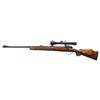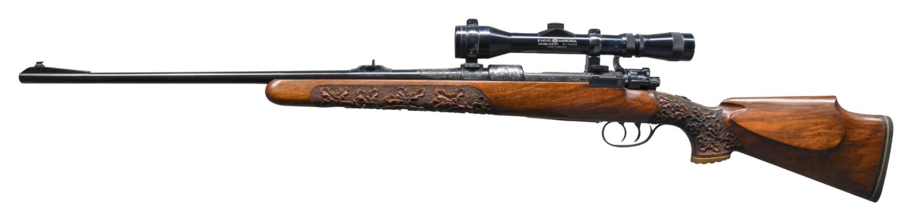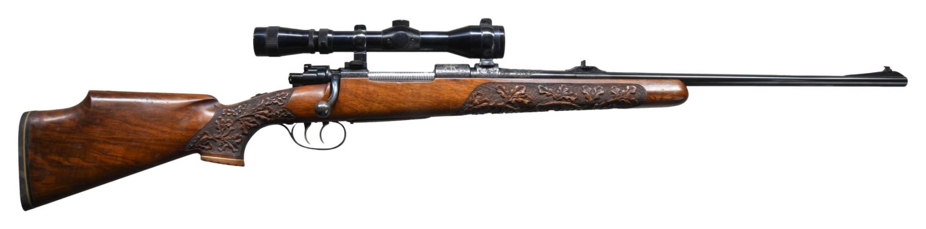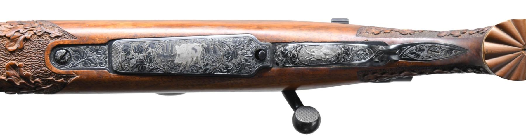 RIFLE. Cal. 30-06. S# 33990 (found on front receiver ring and bottom of bolt handle). Bbl. 24" tapered rnd. of Chrome Vanadium Steel with oval Belgian proof marks. Ramp mounted bead front sight with island mounted fixed U-notch rear sight. B. Nickel MARBURG/L 2 1/2 - 6x40mm E/ D gloss finished scope with post reticule on QD mounts. Scope retains it's original leather covers. Front scope base is bbl. band mounted. Rifle has spectacular Germanic style hand engraving. Front receiver ring features a silver inlaid bugling bull elk on the right side. Left side has silver inlaid buck and doe antelope. Silver inlays continue to the floorplate which features a wild boar and the trigger guard with a mountain goat. Balance of receiver, floorplate, trigger guard, breech end of bbl. and rear sight base have foliate scroll hand engraving with punch dot backgrounds and silver wire borders. Bolt knob has floral pattern hand engraving with a flattened and hand checkered underside. Bolt body and extractor have fine hand jeweling. Custom features include double set triggers and custom top tang sliding safety in addition to a low swing bolt safety. Monte Carlo cheekpiece walnut stock with fluted bakelite grip cap and white line spacer. Forearm and wrist have generous coverage of exquisite deep relief oak leaf hand carving with stippled backgrounds. LOP: 14 1/8" over a Pachmayr thin black rifle pad marked "LANDSBERG/ ROD & GUN CLUB/ GERMANY". A beautiful example of German craftsmanship on a fine rifle custom likely custom made for a serviceman stationed in Germany in the Post-WWII era. Inside of barrel channel has pencil marked name "Colonel Latch OLH 33990". CONDITION: fine, retaining over 98% fine custom blue. The stock finish shows a few small handling marks and spots of finish loss with mildew spotting. Hand engraving and carving are in fine condition retaining great detail. When the trigger set is pulled with either or both safety engaged the trigger produces a click but will not fire until the safeties are disengaged. The set trigger appears to be out of proper adjustment. Very good bright bore. Scope has bright optics. (25-4540/DS). CURIO. $3,500-5,000.