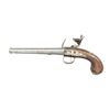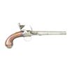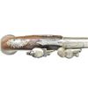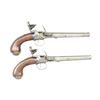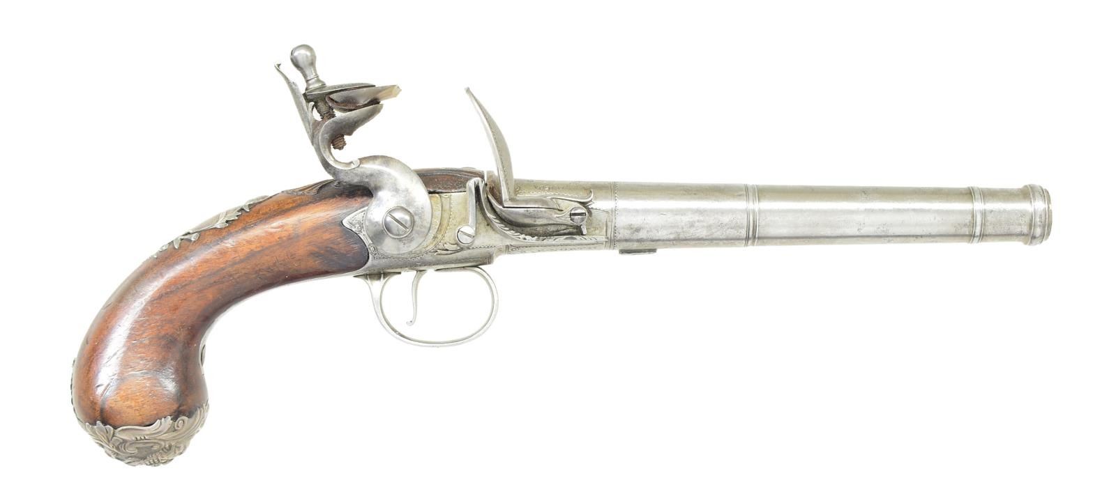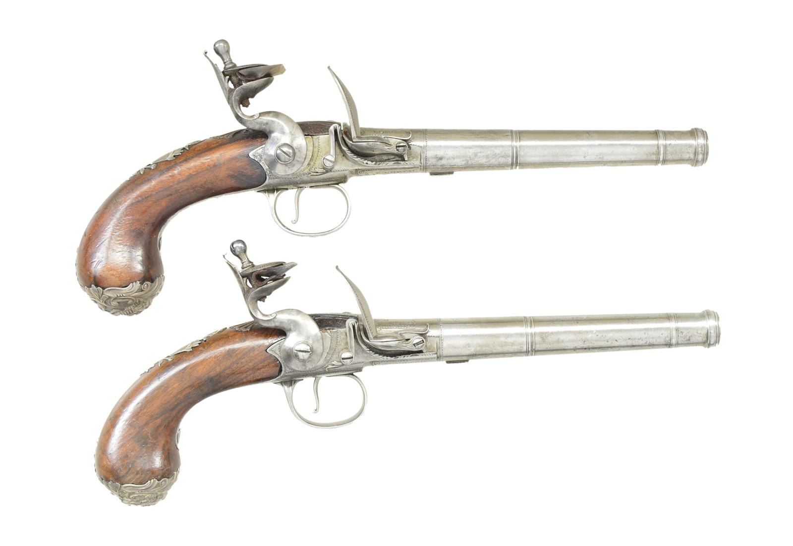 FLINTLOCK PISTOLS. Cal. 54. NSN. Bbls. 5 1/2" w/ smoothbore cannonade muzzles & faceted transitions. Bottom of bbls. are marked “E. NORTH” w/ London definitive black powder proofs & view marks. Breech ends are marked “ROYAL EXCHANGE LONDON”. Breech of bbls. top tangs & trigger guards have highlights of engravings. Boxlock actions w/ plain triggers. Walnut round butt stocks having clam shell relief carving around top tangs. Silver fittings consist of ornate butt caps along w/ wrist plates & side plates having patriotic themes. CONDITION: pistols retain good in the white finish showing scattered spots of light pitting & corrosion. Stocks show light wear & marks w/ small chips around actions. Butt cap on one pistol has an appealing gray tarnish, the other shows some marks & wear. Sound locks. Good bores showing some very light pitting. (01-23081/DS). ANTIQUE. $2,000-3,000.