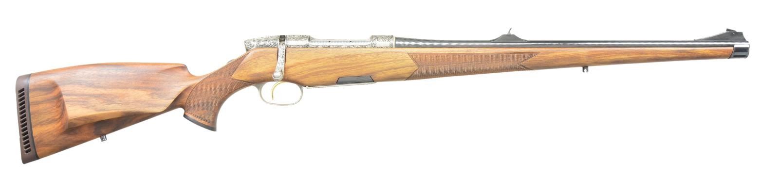 Cal. 270 Win. S# 209829. Bbl. 20" hammer forged w/ ramped elevation adjustable front sight plus rear base having express style jib locked windage adjustable rear. Barrel is Mannox coated for durability and resistance to corrosion; makings consist of proofs, caliber and distributor (Gun South Inc. of Trussville, AL). Mfg. March 1989 (1980-1996) with coin finished receiver, butterknife bolt handle, magazine base and floorplate having scroll engraving plus deep relief Roe deer scene on left rear of receiver (1 buck & 2 does). Company promoted features of 7.7 pounds, sub MOA performance and 1 in 8.6 inches barrel twist rate. Consignor states this ornate rifle was part of the Prince Faisal Collection; no further info as to which one or which country of reign. Finely checkered (2 line borders) full length (Stutzen) left handed European walnut stock with matte finish having Bavarian style double flame cheekpiece, sling studs, factory brown ventilated recoil pad, LH palm swell (Bundsweir pistol grip), wrap around forend checkering, slant cut forend cap and rosewood grip cap having Steyr logo inlay. Receiver is factory drilled and tapped for scope mounts w/ plug screws in place. Safety is rotating wheel in line behind bolt shroud that has integral cocking indicator. Very fine single stage gold plated trigger pull that also operates in single set mode for an even lighter pull; LOP is Steyr standard at 13 7/8". Smooth operating bolt having rear locking lugs is jeweled with Sako style extractor. Trigger guard assembly has spring plunger magazine ejector feature and indexed screws. MAGS: 1 steel single column 3 round w/ continuation of action engraving to include vignette of buck head and shoulders. CONDITION: all aspects near excellent including bore; new unfired appearance. (23-446). MODERN. $7,000-9,000.