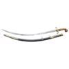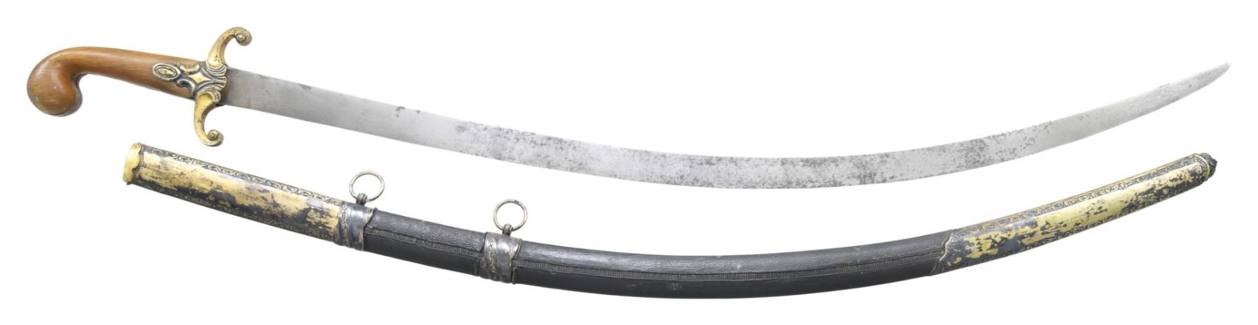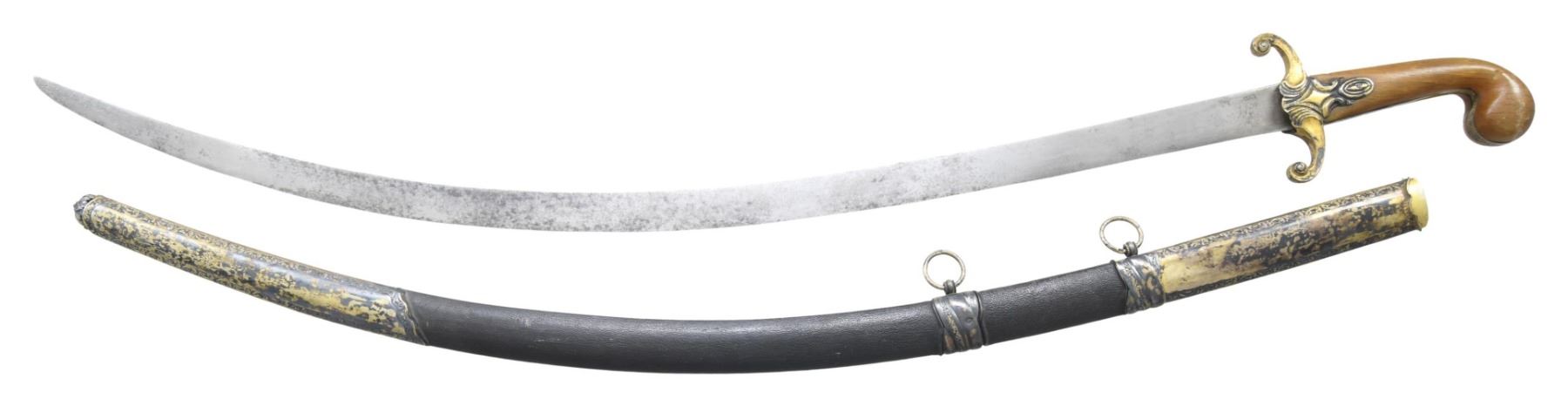 A fine example of an Ottoman Shamshir likely of the Tanzimat era from 1839 to 1876. The overall length is 38 1/4" and the blade length is about 30 1/2". Plain swept blade with a simple wooden shamshir grip and pommel. The gilded down turned guard is typical of Ottoman swords of the Tanzimat period. Hide covered wooden scabbard with gilded silver mounts showing fine decoration. The nautical style knot suspension loops identify this as a naval sword. A fine representative sword from the era of imperial fragmentation. CONDITION: blade has minor staining and a gray patina. Hilt shows light wear. Scabbard is actual quite nice and displays well. (02-24425/BF). $500-800.