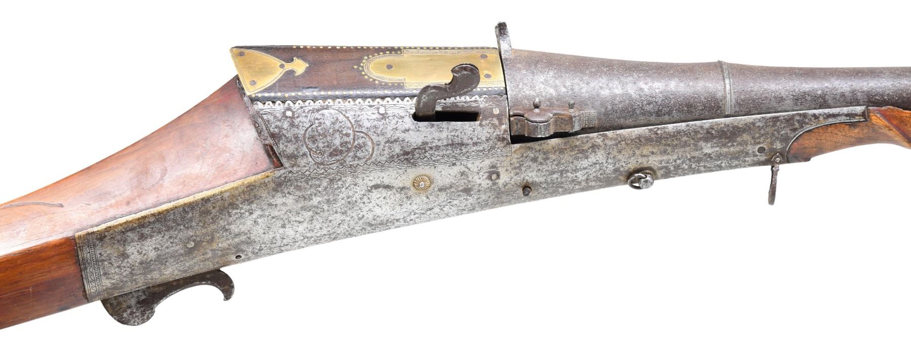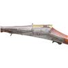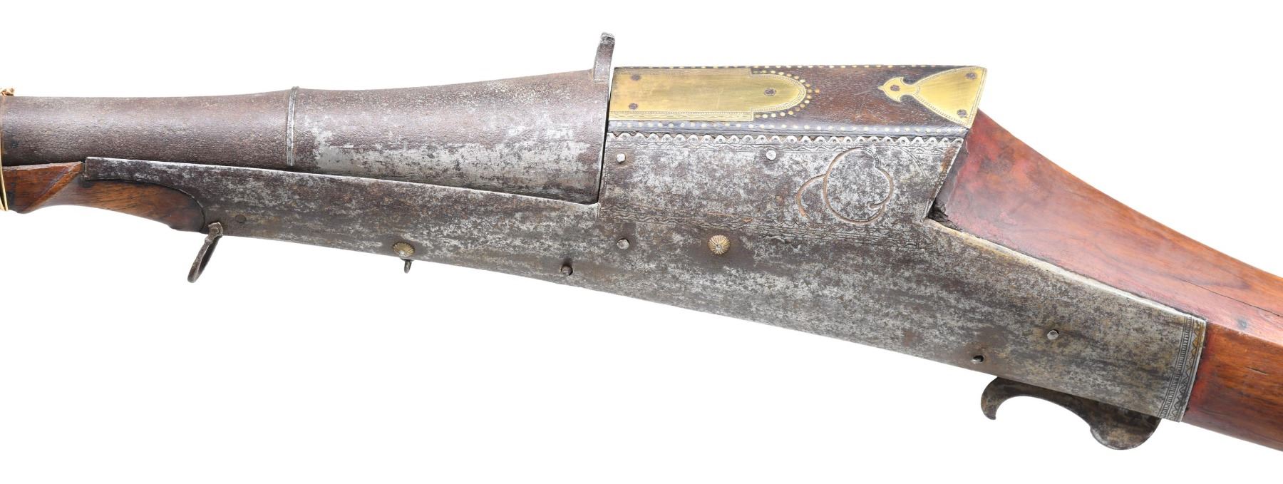 Cal. 60. NSN. Barrel 48" with faceted cannonade muzzle. Enlarged breech section approx. 3" in diameter with sliding touch hole cover & tall notch rear sight. Hardwood stock has 4 sections of newly wrapped brass wire bands, iron plates on sides with brass plates on top. Lever operated trigger. Swept curved butt section. CONDITION: barrel shows dark brown patina with pitting. Action areas of gray patina appearance with light engraving. Brass shows light patina. Wood shows marks throughout; forearm has 23" split along bottom held by brass wire. Pitted dark bore. (01-26198/MD). ANTIQUE. $500-800.