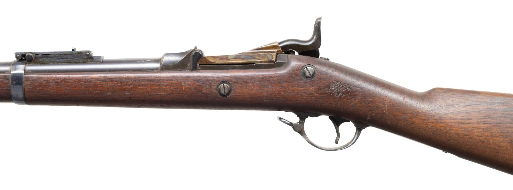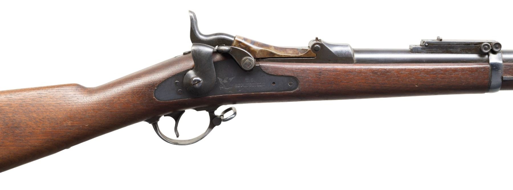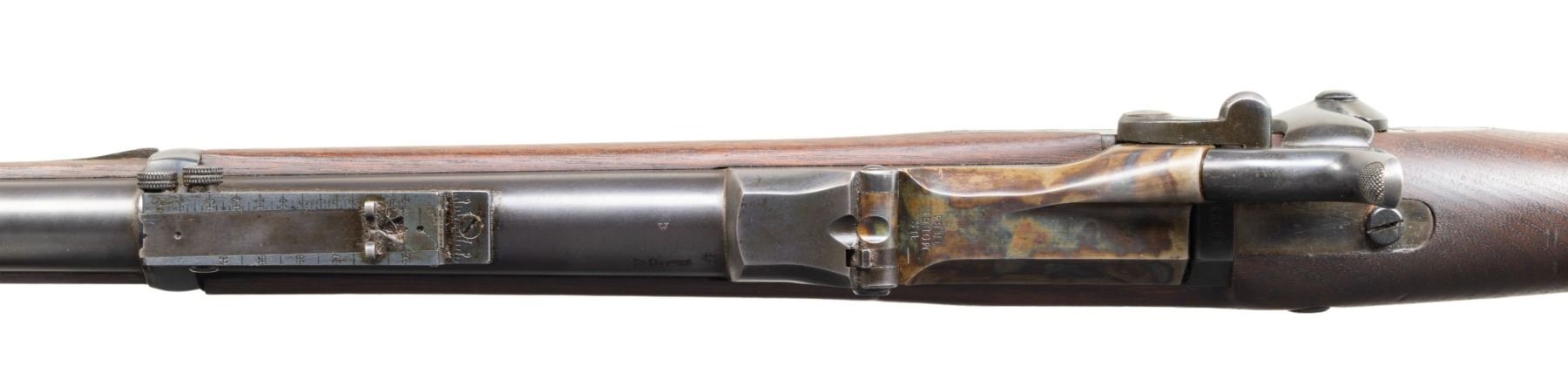 Cal. 45-70. S# 460290. Over 200,000 of these last trapdoor Springfields were made, most saw hard long use, few survived as fine as this example. Standard configuration 36" barrel, Buffington long range rear sight. Trap door breech marked "U.S. / MODEL / 1884". Lock with eagle & "US / SPRINGFIELD". CONDITION: excellent overall, rifle retains 95%+ blue and case colored finish. Stock is sound with raised grain & crisp 1889 dated inspection cartouche. Mechanically crisp, bright shiny rifled bore. PROVENANCE: Estate Collection of John "Jack" Dhooghe. (01-28244/JS). ANTIQUE. $1,000-2,000.