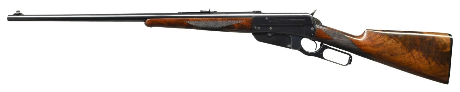 ACTION RIFLE. Cal. 405 WCF. S#, 55090. Bbl. 24" round. Ramp mounted Lyman bead front sight with flat top elevator adjustable sporting rear sight. Blue finish. Ebony tipped forearm and straight grip stock of fancy black walnut have style H factory checkering and original hard rubber buttplate. Top tang channel of stock has “1371” assembly number. Lower tang is not marked. Serial number indicates 1907 mfg. CONDITION: fine. Metal retains over 95% original blue showing light edge wear with spots of flaking on lever. Very good original wood finish and checkering showing a few small marks. Very good bright bore retains strong rifling. (22-5814/DS). CURIO. $6,000-10,000.