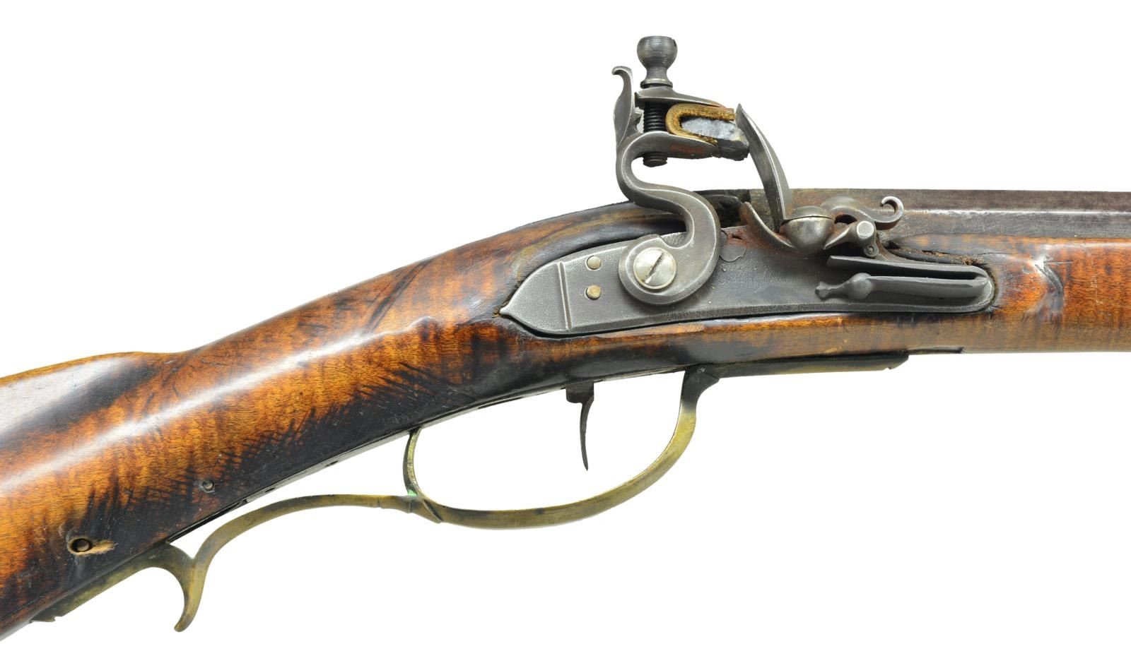 Cal. 44 smooth bore. NSN. Bbl. 37" full oct. Bbl. signed "P. Newbeker" on top flat. Overall length 52". 4 Piece engraved brass patchbox w/ one piercing. Unmarked flintlock, appears to be original flint. Curly maple stock. Engraved brass sideplate w/ some incised carving on each side above the rear ramrod entrance ferrule. Very little information exists on this maker. CONDITION: wrist area shows signs of having originally been checkered but the checkering has nearly all been worn off. Buttplate & toeplate have been damaged at the toe to cover a sm. triangle of missing wood. Gun originally had set triggers, but back trigger is missing, trigger guard has been incorrectly replaced & does not fill the original trigger guard cavity. 13x1/4" Sliver of wood along the bbl. is missing on right hand side & 10x1/4" sliver of wood missing on left. There is a 4" section under the forend where ramrod hole broke through wood, patchbox door release needs adjusting. PROVENANCE: Collection of Dr. John Persing. (01-19547/RG). ANTIQUE. $2,000-3,500.