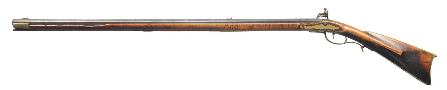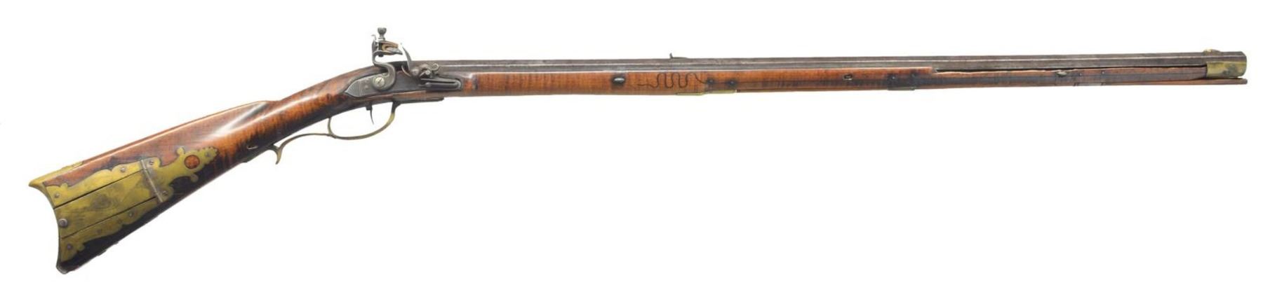 Cal. 44 smooth bore. NSN. Bbl. 37" full oct. Bbl. signed "P. Newbeker" on top flat. Overall length 52". 4 Piece engraved brass patchbox w/ one piercing. Unmarked flintlock, appears to be original flint. Curly maple stock. Engraved brass sideplate w/ some incised carving on each side above the rear ramrod entrance ferrule. Very little information exists on this maker. CONDITION: wrist area shows signs of having originally been checkered but the checkering has nearly all been worn off. Buttplate & toeplate have been damaged at the toe to cover a sm. triangle of missing wood. Gun originally had set triggers, but back trigger is missing, trigger guard has been incorrectly replaced & does not fill the original trigger guard cavity. 13x1/4" Sliver of wood along the bbl. is missing on right hand side & 10x1/4" sliver of wood missing on left. There is a 4" section under the forend where ramrod hole broke through wood, patchbox door release needs adjusting. PROVENANCE: Collection of Dr. John Persing. (01-19547/RG). ANTIQUE. $1,500-2,000.