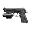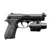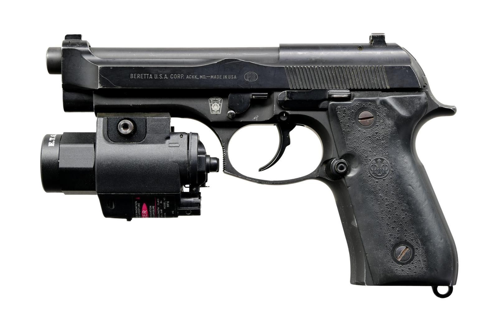 PISTOL. Cal. 40 S&W. S# BER134920. Bbl. 5". Three dot sights. USA-made Beretta 96D Brigadier DAO pistol. Right side of the pistol has a Pennsylvania State Police shield marking. Pistol has no manual safety. Matte black finish slide. Parkerized frame with ETP XP6E flashlight and red laser combo. Laser is working, but the flashlight does not appear to be working. Black pebbled rubber grips with the Beretta logo. MAGS: none present. CONDITION: grips show worn pebbling, dings, and handling wear. Metal retains 85% of its parkerizing and black enamel, with scattered flaking, edge, and handling wear. Very good+ bore. (24-1394/MJC). MODERN. $250-350.