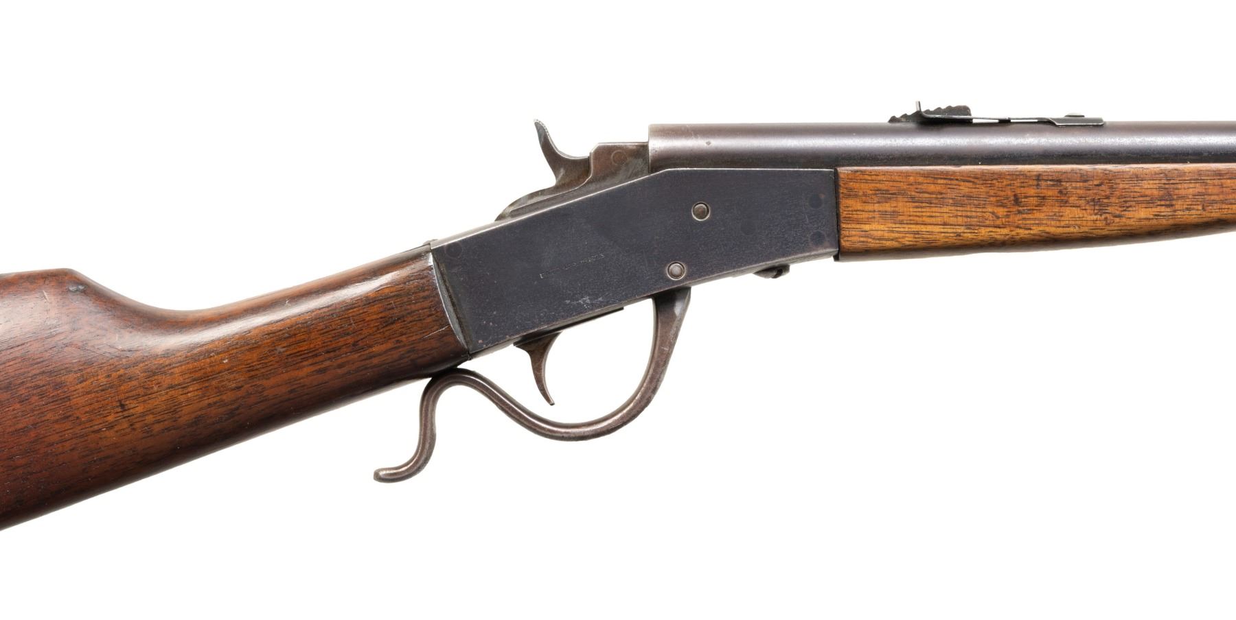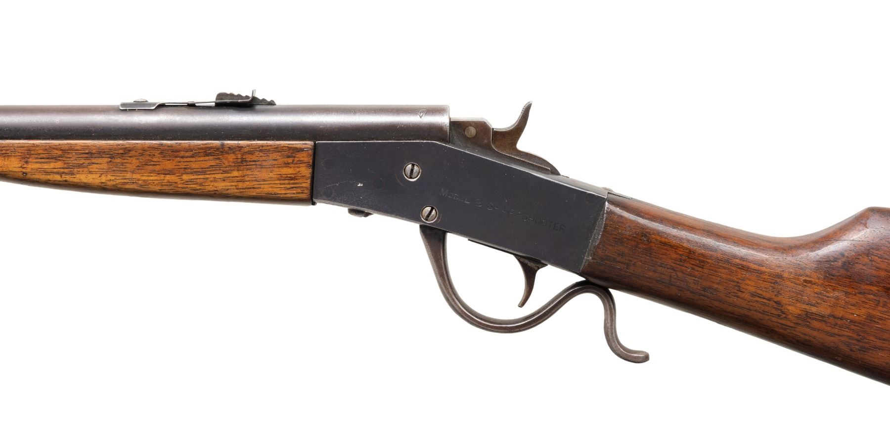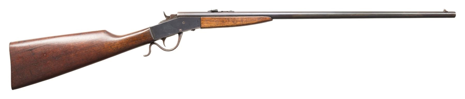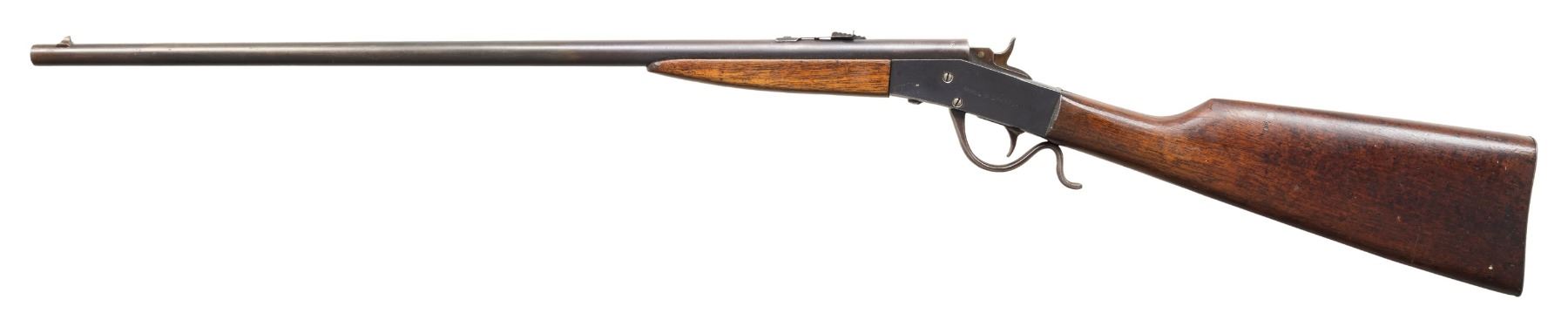 CAL. 22 LR. S# 7190. Bbl. 24". Sporting sights. Walnut stock set. CONDITION: fair blue overall showing peppery oxidation. Fair wood finish with large cracks & scattered dings. Fair worn rifling with pitting & ring bulge 3.5" from muzzle. PROVENANCE: Estate of Groves Herrick. (25-5757/MD). CURIO. $200-300.
