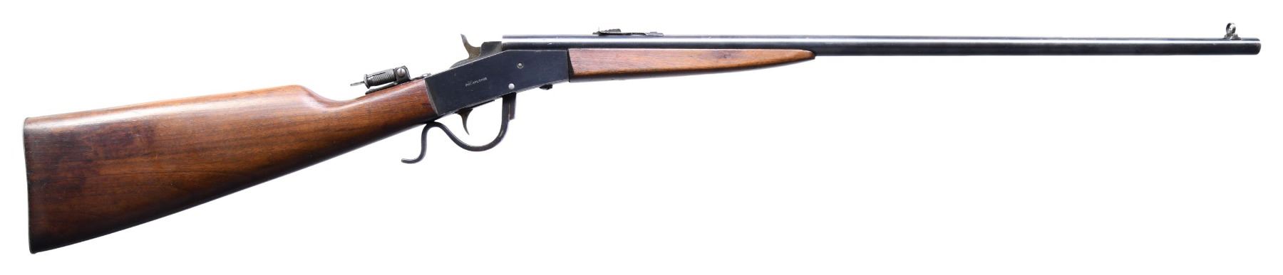 Cal. 22 LR. S# 1967. Round 24" barrel. Combination front sight, elevator rear sight & folding aperture tang sight. Falling block action. Walnut stock set with steel buttplate. CONDITION: good blue mixing with scattered spots of brown patina, wear around muzzle & scattered light scratches. Worn blue in carry areas of action. Very good wood finish with small dents & marks. Buttplate shows fair blue mixed with oxidation. Bore shows strong rifling & light pitting around muzzle. (25-679/MD). CURIO. $350-500.