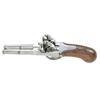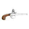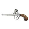 BOXLOCK FLINTLOCK PISTOLS. Fine pair of dbl. bbl. flintlock pistols. BOTH: Cal. 45. NSN. 10" Overall. Bbls. 3 1/2" screw on 2 stage rnd. w/ flared cannon muzzles, engraved iron mountings. Each pistol marked “LONDON” on right side & “GALAS” opposite. Bulbous bag grips w/ moldings. CONDITION: very good to fine overall, iron is overall polished to a gray/bright patina. Mechanically functional w/ clean rifled bores. PROVENANCE: From the Collection of John "Tim" Breth Jr. (01-17788; 01-17790/JS). ANTIQUE. $1,500-2,000.