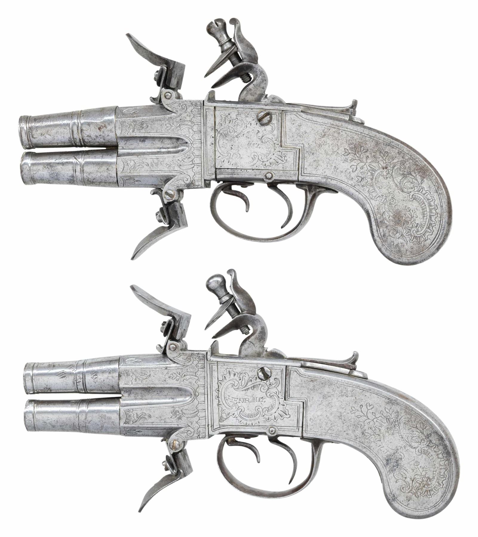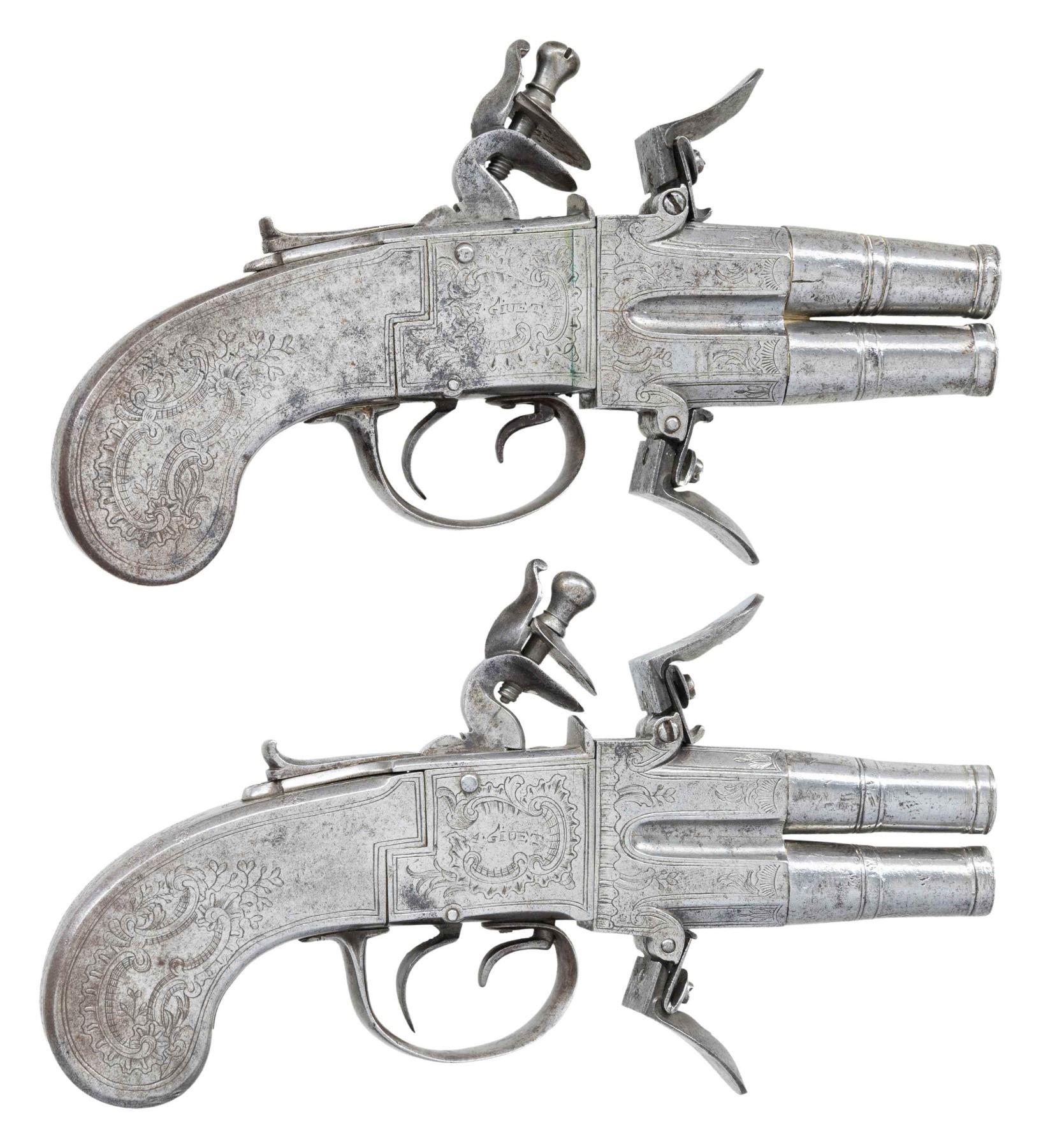 PISTOLS BY HENRAUX OF GIVET. Cal. 40 (Both). S# NSN (Both). These pistols have 1-5/8" turn off cannon barrels which are not numbered or proofed. O/U breeches rotate with release levers in front of trigger guards. Frizzens have external springs. Boxlock actions with serpentine cocks have sliding safetys on top tangs that engage at half cock and do not lock frizzens. All metal flat sided stocks have rounded bag grips. Breeches, actions and grips are nicely engraved with well cut foliage and vines within line borders. Left sides of actions are engraved "HENRAUX." "a GIVET" is on right sides. (Listed as working Ca. 1740-60. These pistols are probably later; made around 1790.) UNATTACHED ACCESSORIES: listing of these pistols at Little John's Auction Service with handwritten notation of $6,000 sales price. CONDITION: good as cleaned. All metal surfaces present a shiny silver over light pin prick pitting. Engraving shows some loses with maker's name barely visible on one pistol. Otherwise, pistols appear mechanically good with a crack in one barrel. Barrels are seized in position. (01-26954/MGM). ANTIQUE. $ 3,000-4,000.