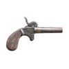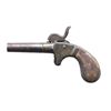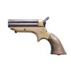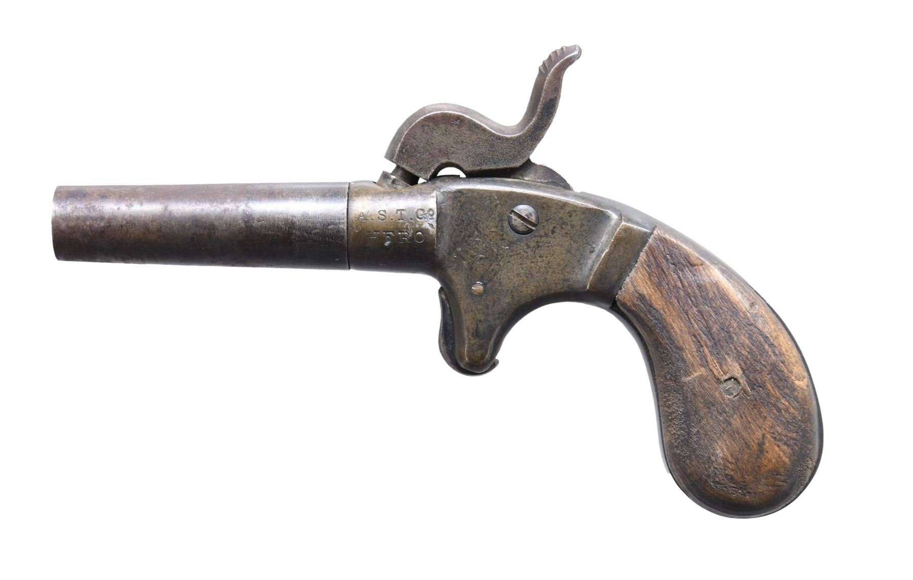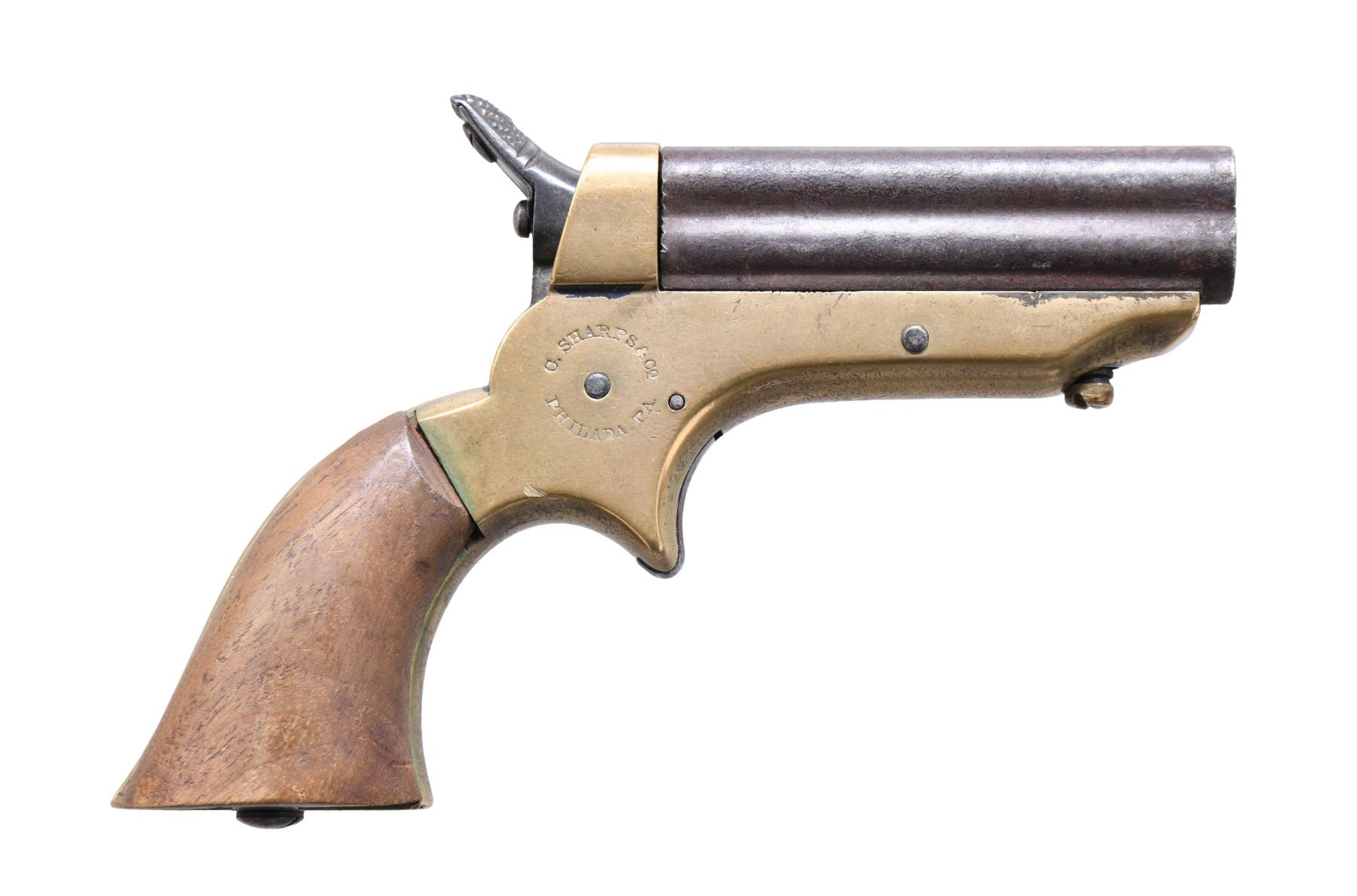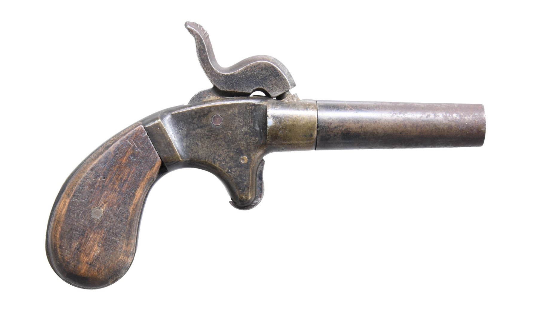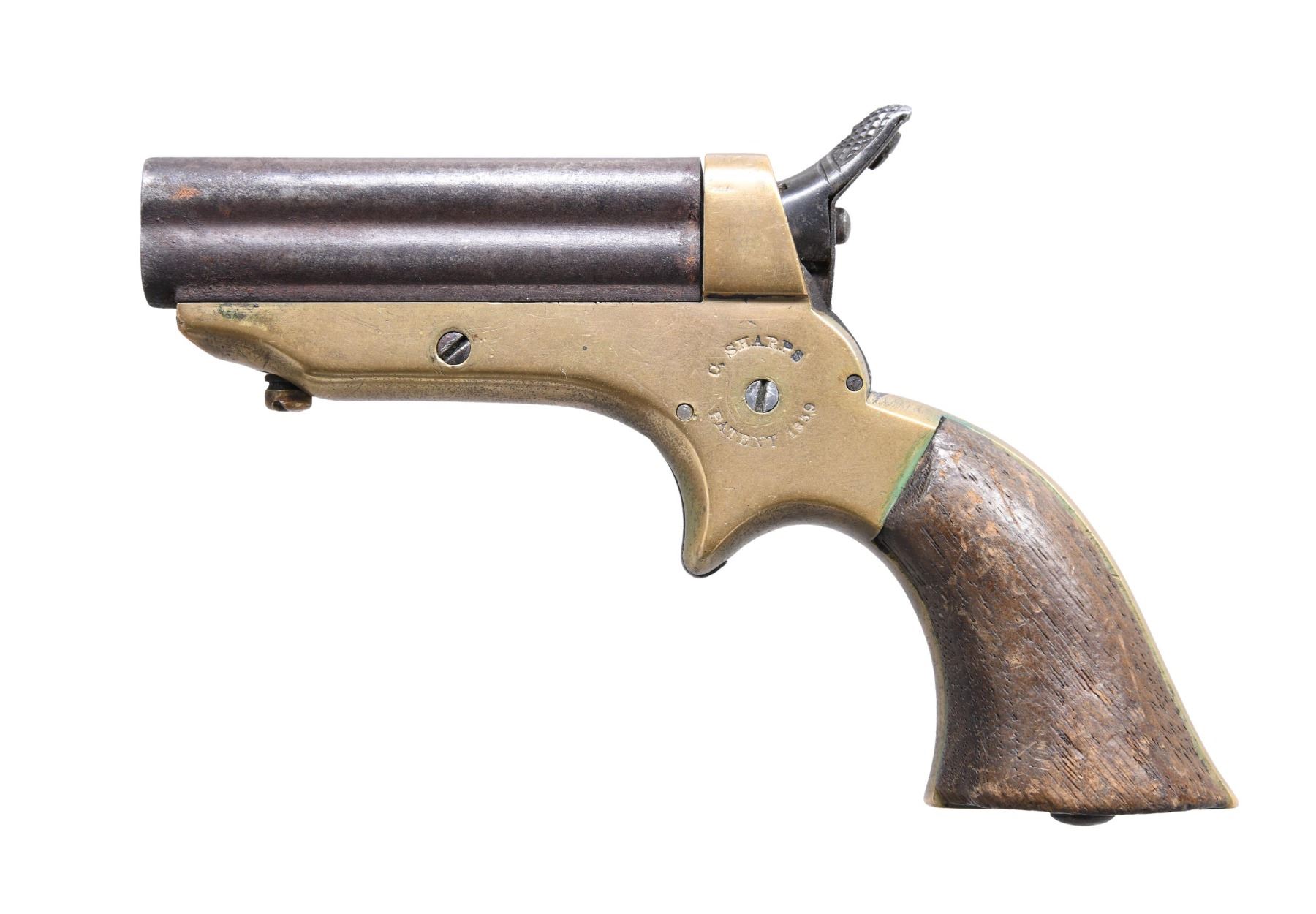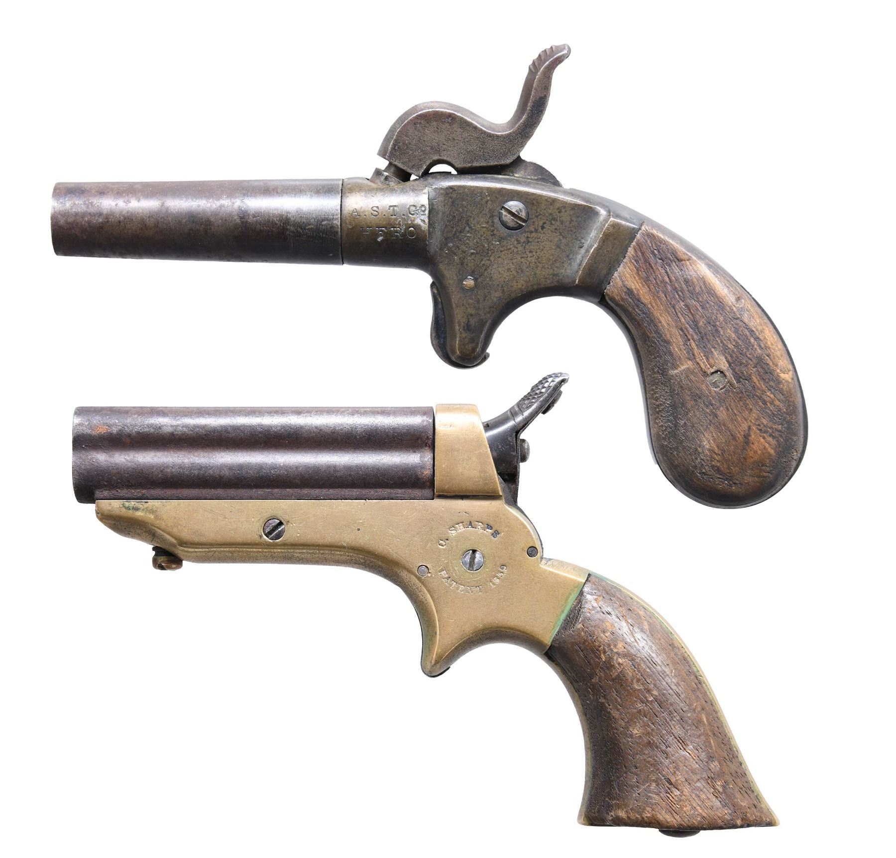 1) AMERICAN STANDARD TOOL CO. PERCUSSION PISTOL. Cal. 34. NSN. Bbl. 2". Percussion derringer style pistol made by Manhattan Firearms. Left side of frame marked "A.S.T. CO./HERO". Smooth hardwood grips that maybe later replaced. CONDITION: grips display a loose fit with some chips, dings, flaking & handling wear. Metal is mostly a dull gray patina with scattered dings & oxidation. Hammer & trigger are functional when hand cycled. Oxidized bore. (01-26351/MJC). 2) SHARPS 4-BBL. PEPPERBOX DERRINGER PISTOL. Cal. 22 RF. S# 10010. Bbl. 2 1/2". Four-barrel pepperbox derringer pistol, mfg. by C. Sharps & Co. Brass frame. Hardwood grips. CONDITION: grips show notable flaking, chips, dings & handling wear. Bottom of grip frame has old metal repair across it. Brass is a dull yellow patina with scattered oxidation & flaking. Bbls. are a dull gray patina with oxidation & pitting. Hammer & trigger are sluggish but appear function. Pitted bores. (01-26352/MJC). BOTH ANTIQUE. $300-600 FOR PAIR.