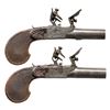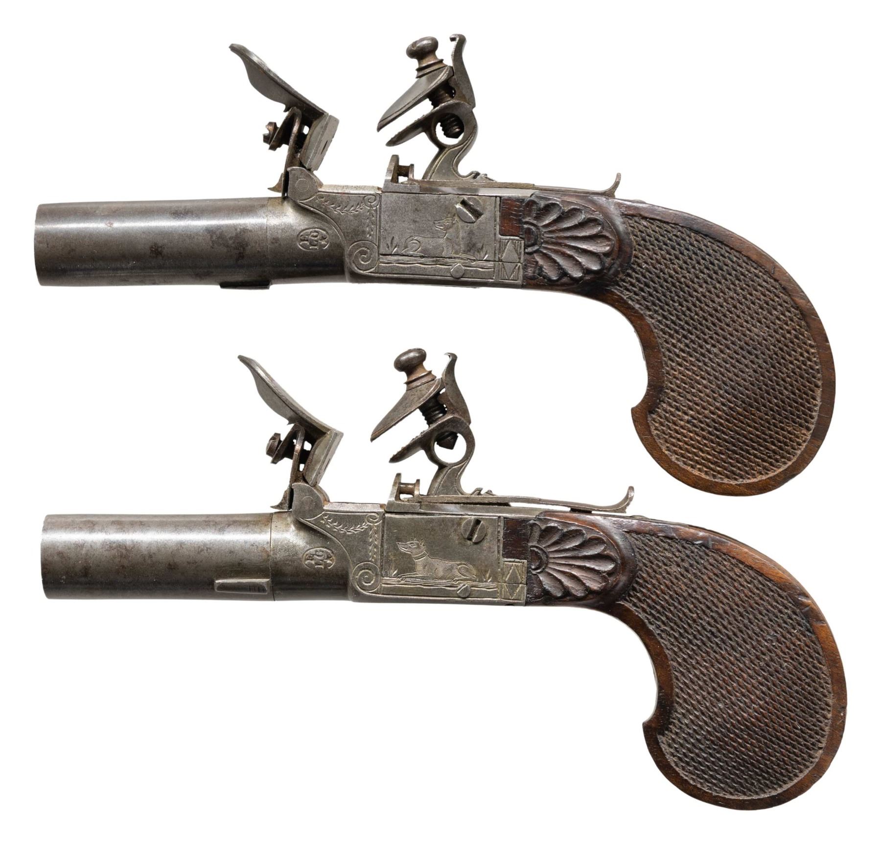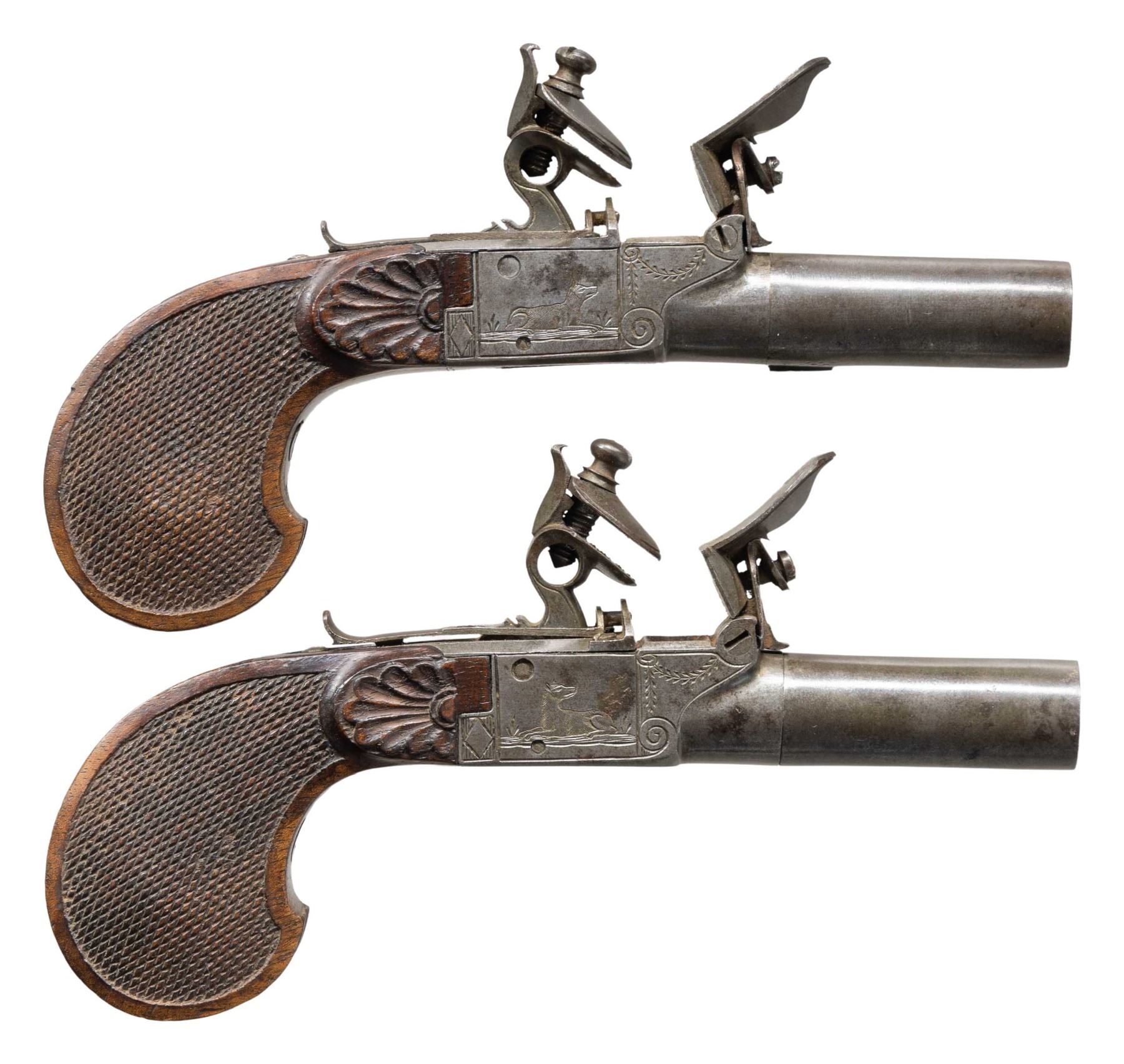 Cal. 52. NSN. Bbls. 1 3/4". Pair of screw barrel flintlock pistols produced by an unknown mfg. in Belgium. Sides of the frames feature decorative engraving with a dog engraved on either side. Left side of the frames are stamped with an encircled Belgian "E/ LG/ *" proof at the breech areas. Wood stocks feature checkered panels on the left and right sides, with a groove running down the backstraps and on the butts. Stock ears are relief carved with floral motifs. Triggers extend when hammers are cocked. CONDITION: metal components exhibit a dark mottled gray patina, with some scattered spots of dark surface oxidation. Bores show some scattered spots of pitting. Locks hold at half and full cock, and function appropriately when cycled by hand. Stocks show scattered marks from handling and storage, but otherwise remain sturdy and serviceable. PROVENANCE: Estate Collection of Nicholas Apergis. (01-27508/MLW). BOTH ANTIQUE. $500-800.