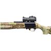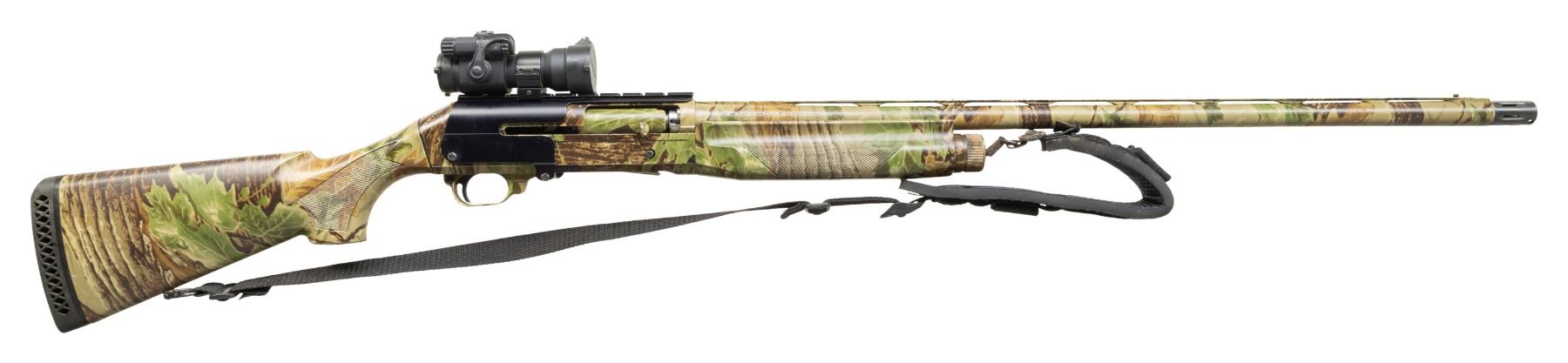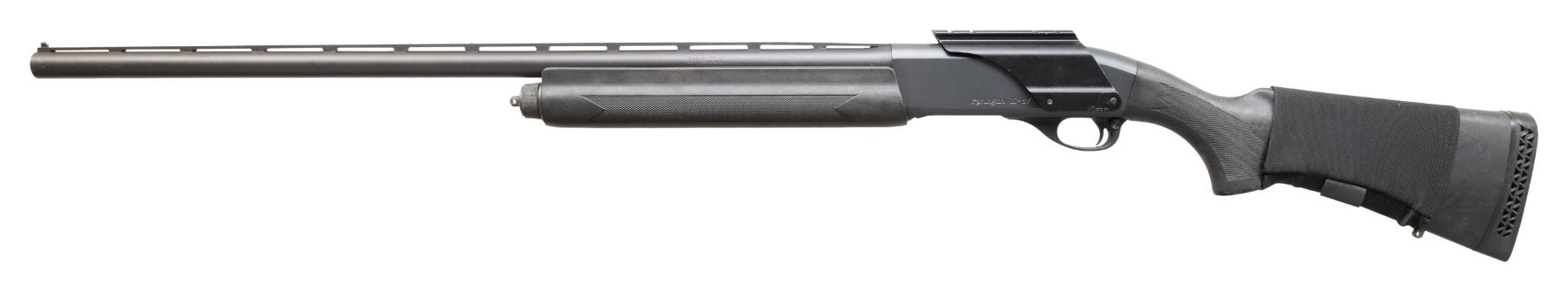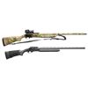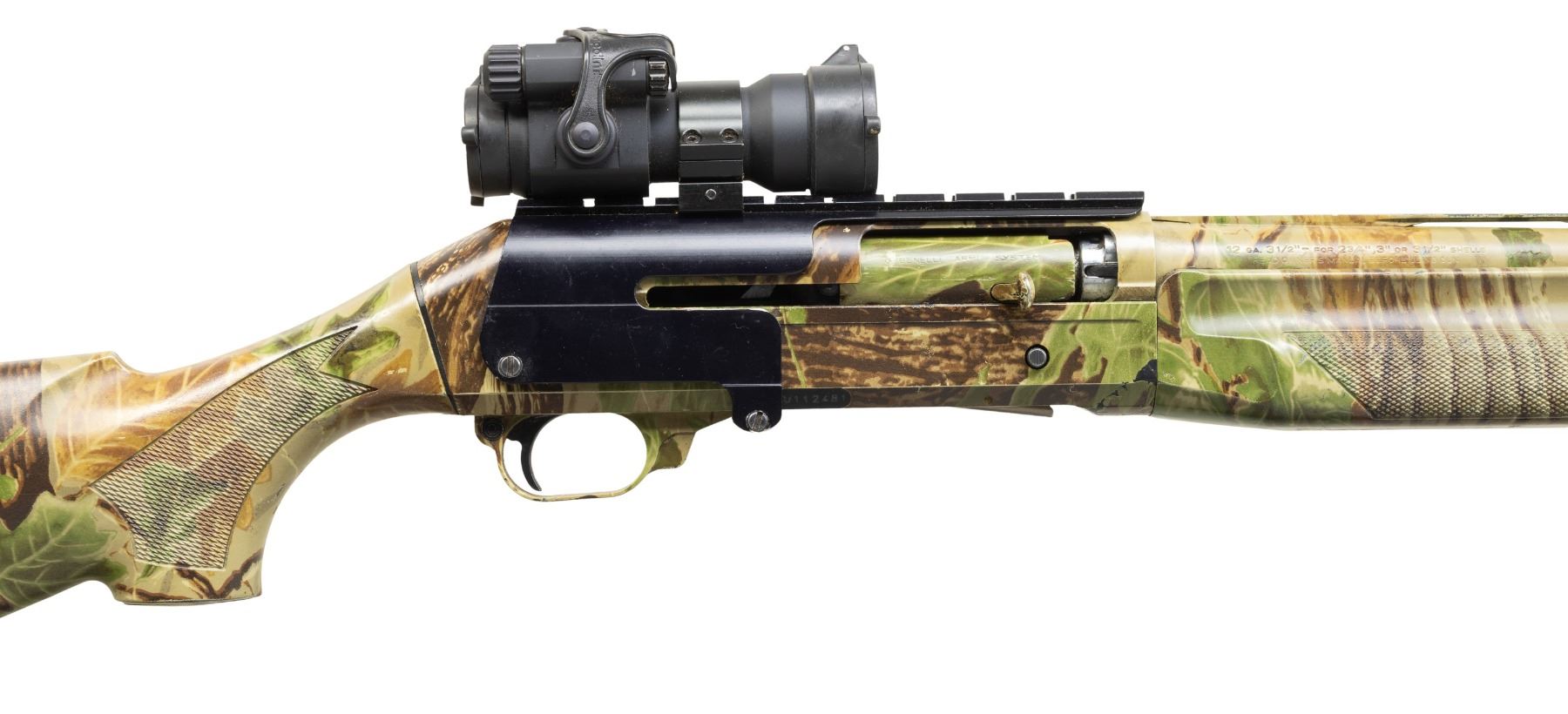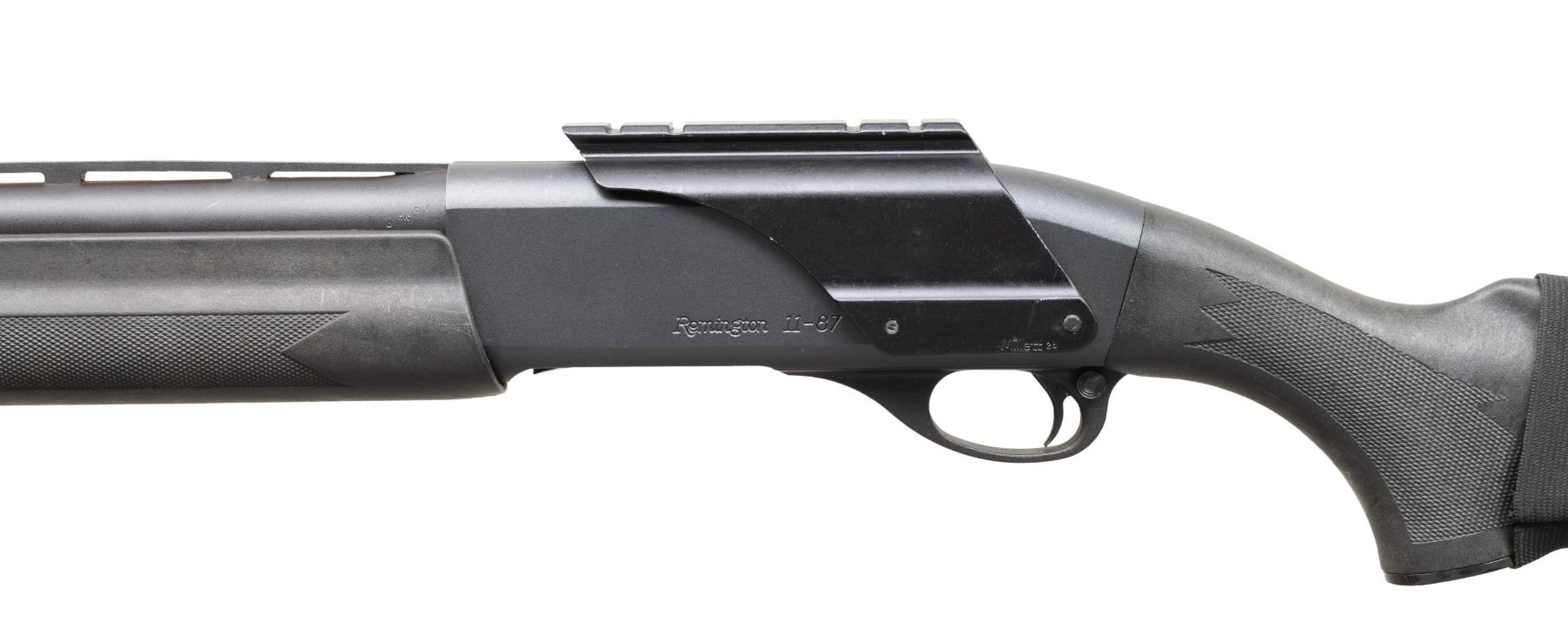 11-87 SPECIAL PURPOSE SEMI-AUTOMATIC SHOTGUNS. 1) BENELLI SUPER BLACK HAWK SEMI-AUTOMATIC SHOTGUN. Cal. 12 GA, 2 3/4", 3", & 3 1/2". S# U112481. Bbl. 27 3/4". Super Black Eagle semi-automatic shotgun mfg. in Italy by Benelli in 2012. Bbl. and receiver exhibit standard factory markings denoting the model and cal. designations, Italian proofs, as well as Benelli's mfg. information. Metal components, as well as the checkered finger grooved synthetic forearm and pistol grip stock exhibit a Realtree camouflage finish. Buttstock is fitted with a Benelli ventilated black rubber recoil pad. Bbl. features a grooved matte V/R with a threaded choke / flash hider marked "MD-1005", red fiber optic front sight, and aluminum mid bead. Receiver is fitted with a B-Square picatinny saddle mount, featuring an Aimpoint ML2 reflex sight. CONDITION: shotgun retains the majority of its factory Realtree camouflage finish, exhibiting spots and areas of flaking, with moderate oxidation present on the underside of the bbl. and choke. Mirror bore. Proper manual mechanics. Reflex battery has died, but otherwise retains a clear optic. (25-4779/MLW). 2) REMINGTON MODEL 11-87 SPECIAL PURPOSE SEMI-AUTOMATIC SHOTGUN. Cal. 12 GA, 2 3/4" & 3". S# PC337469. Bbl. 27 3/4". Model 11-87 Special Purpose semi-automatic shotgun mfg. by Remington. Standard factory markings denoting the model and cal. designations, as well as Remington's mfg. information. Metal components exhibit a matte blue finish overall. Checkered black synthetic forearm and pistol grip stock with Remington ventilated black rubber recoil pad. Bbl. features a V/R with a threaded Remington Modified choke, as well as a white synthetic front and aluminum mid bead. Receiver is fitted with a Millet picatinny saddle mount. Buttstock is fitted with an Uncle Mike's black elastic 5-rd. bandolier. CONDITION: metal components retain the majority of their original blue finish, exhibiting scattered spots and small patches of light to mild surface oxidation on the bbl. and mag. tube cap. Bright bore, exhibiting light pitting throughout. Proper manual mechanics. Synthetic furniture shows some superficial handling marks, but otherwise remains sound. (25-4784/MLW). BOTH MODERN. $600-900.