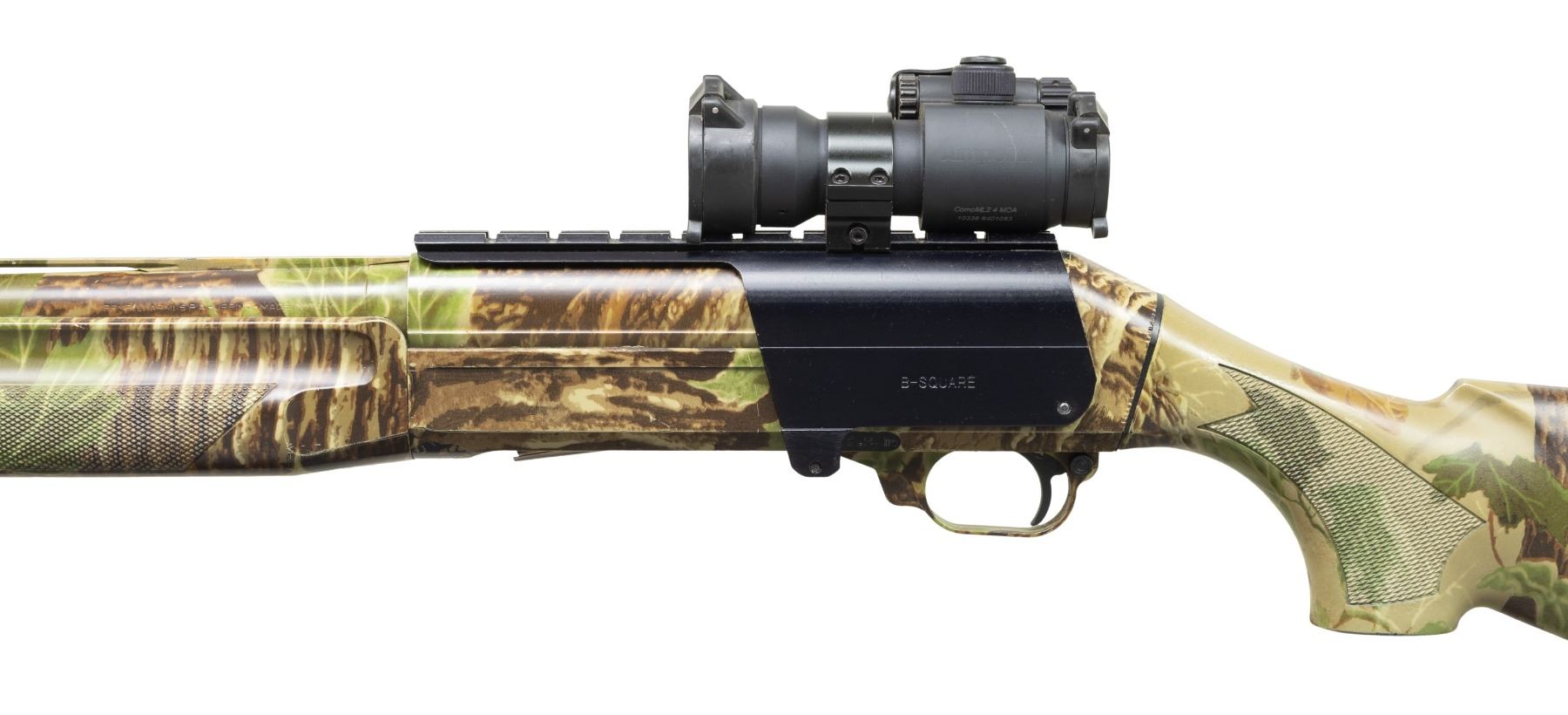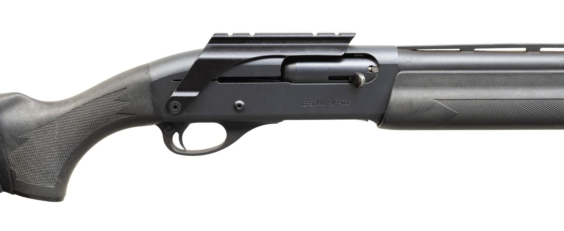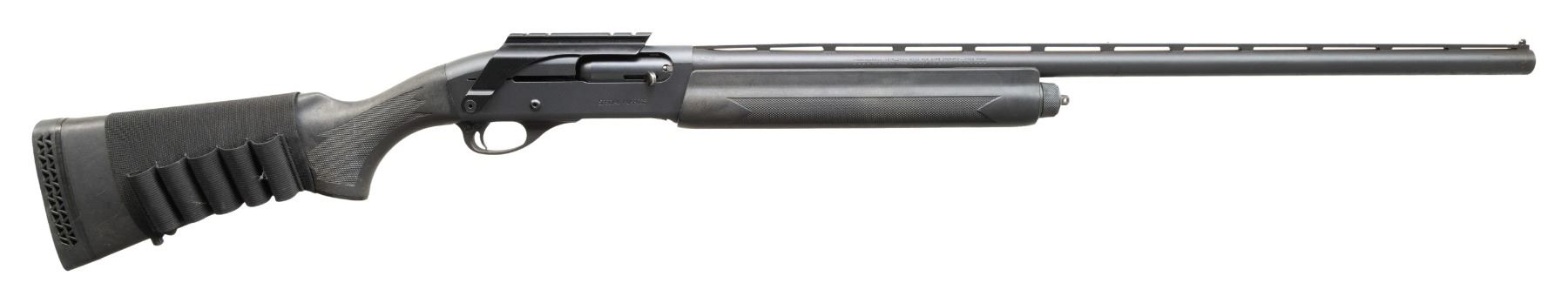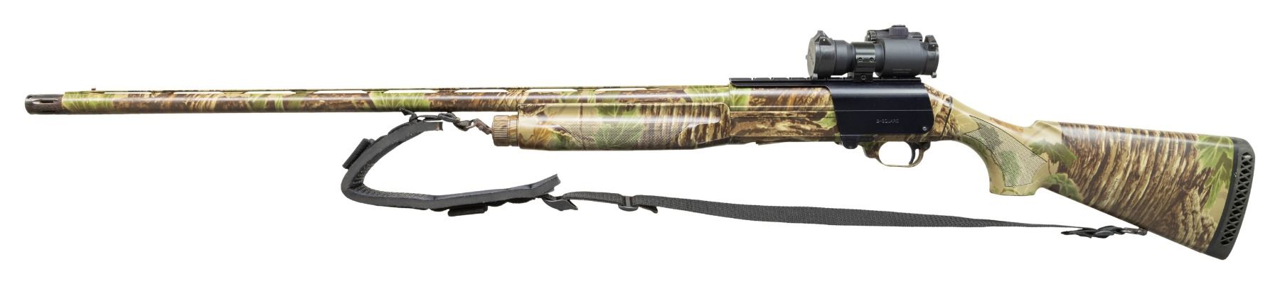 11-87 SPECIAL PURPOSE SEMI-AUTOMATIC SHOTGUNS. 1) BENELLI SUPER BLACK HAWK SEMI-AUTOMATIC SHOTGUN. Cal. 12 GA, 2 3/4", 3", & 3 1/2". S# U112481. Bbl. 27 3/4". Super Black Eagle semi-automatic shotgun mfg. in Italy by Benelli in 2012. Bbl. and receiver exhibit standard factory markings denoting the model and cal. designations, Italian proofs, as well as Benelli's mfg. information. Metal components, as well as the checkered finger grooved synthetic forearm and pistol grip stock exhibit a Realtree camouflage finish. Buttstock is fitted with a Benelli ventilated black rubber recoil pad. Bbl. features a grooved matte V/R with a threaded choke / flash hider marked "MD-1005", red fiber optic front sight, and aluminum mid bead. Receiver is fitted with a B-Square picatinny saddle mount, featuring an Aimpoint ML2 reflex sight. CONDITION: shotgun retains the majority of its factory Realtree camouflage finish, exhibiting spots and areas of flaking, with moderate oxidation present on the underside of the bbl. and choke. Mirror bore. Proper manual mechanics. Reflex battery has died, but otherwise retains a clear optic. (25-4779/MLW). 2) REMINGTON MODEL 11-87 SPECIAL PURPOSE SEMI-AUTOMATIC SHOTGUN. Cal. 12 GA, 2 3/4" & 3". S# PC337469. Bbl. 27 3/4". Model 11-87 Special Purpose semi-automatic shotgun mfg. by Remington. Standard factory markings denoting the model and cal. designations, as well as Remington's mfg. information. Metal components exhibit a matte blue finish overall. Checkered black synthetic forearm and pistol grip stock with Remington ventilated black rubber recoil pad. Bbl. features a V/R with a threaded Remington Modified choke, as well as a white synthetic front and aluminum mid bead. Receiver is fitted with a Millet picatinny saddle mount. Buttstock is fitted with an Uncle Mike's black elastic 5-rd. bandolier. CONDITION: metal components retain the majority of their original blue finish, exhibiting scattered spots and small patches of light to mild surface oxidation on the bbl. and mag. tube cap. Bright bore, exhibiting light pitting throughout. Proper manual mechanics. Synthetic furniture shows some superficial handling marks, but otherwise remains sound. (25-4784/MLW). BOTH MODERN. $600-900.