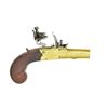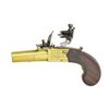 BOXLOCK POCKET PISTOLS WITH FOLDING TRIGGERS BY WILLIAM NICHOLSON. Cal. 53. NSN. The 1 3/8" round smooth bore bbls. have London proofs. Boxlock frames which are also brass, are stamped with London proofs on bottom. Steel cock has small reinforce and can be secured in half cocked position by a sliding safety at rear which also locks frizzen in closed position (when brought to full cock), the folding triggers are exposed. Actions are engraved with geometric borders surrounding "Nicholson" in oval on left sides and his Cornhill London address (1786-94) in flag flanked device on rights. Walnut flat sided bag grips have silver escutcheons at rears engraved "JH?". CONDITION: good. Brass with considerable cleaning has now turned gold. Steel parts are silver to gray patina. Stocks have most of an old oil finish. Mechanically good. One pistol has small chip missing on bottom of left side grip behind action. PROVENANCE: From the Collection of James B. Taylor. (01-20567/MGM). ANTIQUE. $800-1,200.