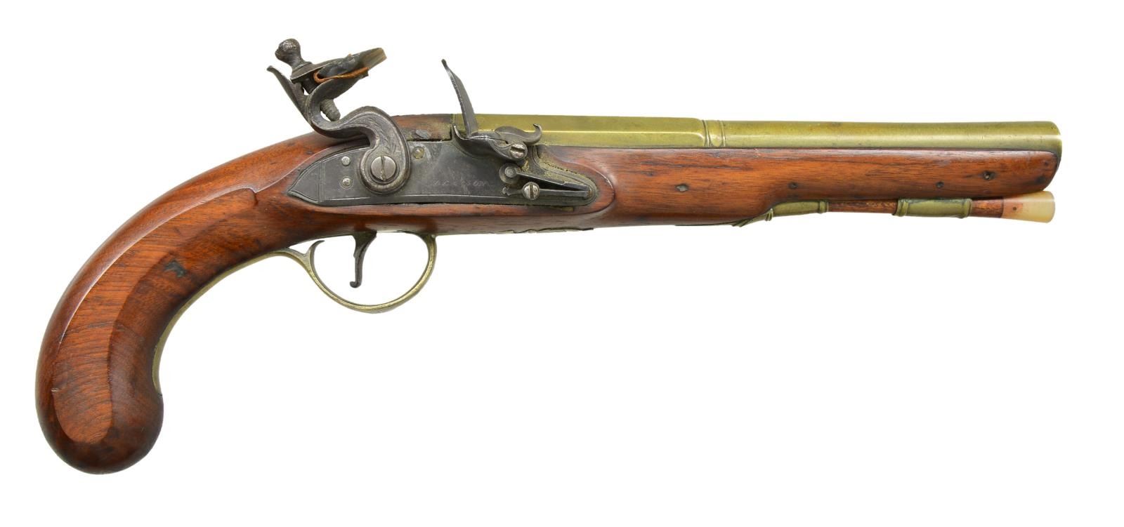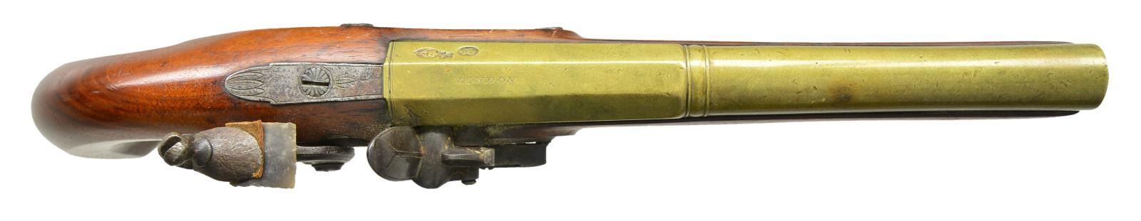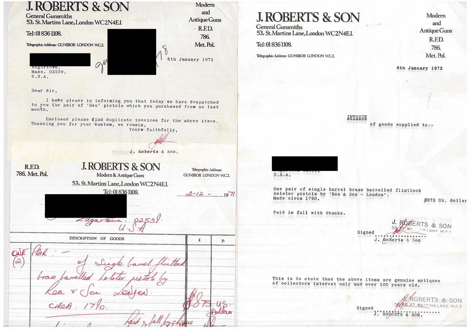 BY REA & SON. Cal. 60 (pr). NSN (pr). (CA 1800). John Rea of London is known to be working with his first son between 1801-1804. This good pair of pistols probably date from that time. They have 8" barrels without patent breeches that are octagonal at breech and transition to round through a wedding band to flared muzzles. Top left flats are stamped with London proofs and John Rea barrel makers mark "IR" under flourish. Top flats are engraved "LONDON". Barrel tangs have border and foliate engraving. Locks having chamfered flat plates with rebated tails are fitted with high breasted serpentine cocks, rounded pans, bridled frizzens and feather springs with rollers which have dog nose finials. Center of each lock is engraved "REA & SON". Mahogany stocks with flat faced bag grips extend to muzzles and are brass mounted. Mounts are lightly engraved. Trigger guards have stylized pineapple finials. Stocks are pinned to barrels and walnut ramrods with tan horn tips mount through single beaded pipes and matching thimbles. UNATTACHED ACCESSORIES: 3 letters from J. Roberts & Son regarding purchase and export of these pistols in 1971. CONDITION: good. Barrels showing considerable old cleaning with softening of edges are now toned to dark gold. Locks show old cleaning and are now gray brown and have scattered pitting on cocks and frizzens. Stock show an old oil refinish with light subsequent marks. Bores are good. Lock of one pistol does not have half cock notch, otherwise mechanically good. (01-21795/MGM) (2). ANTIQUE. $2,000-3,000.