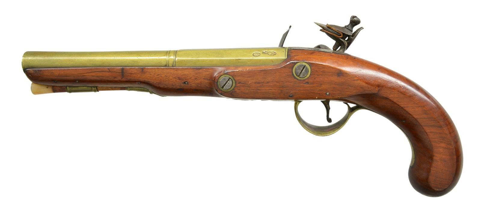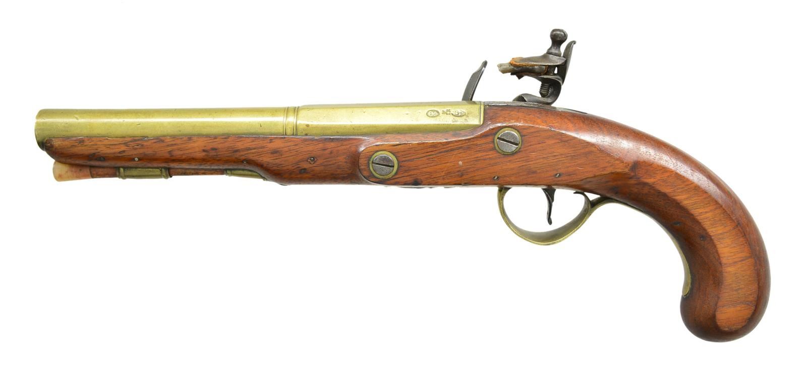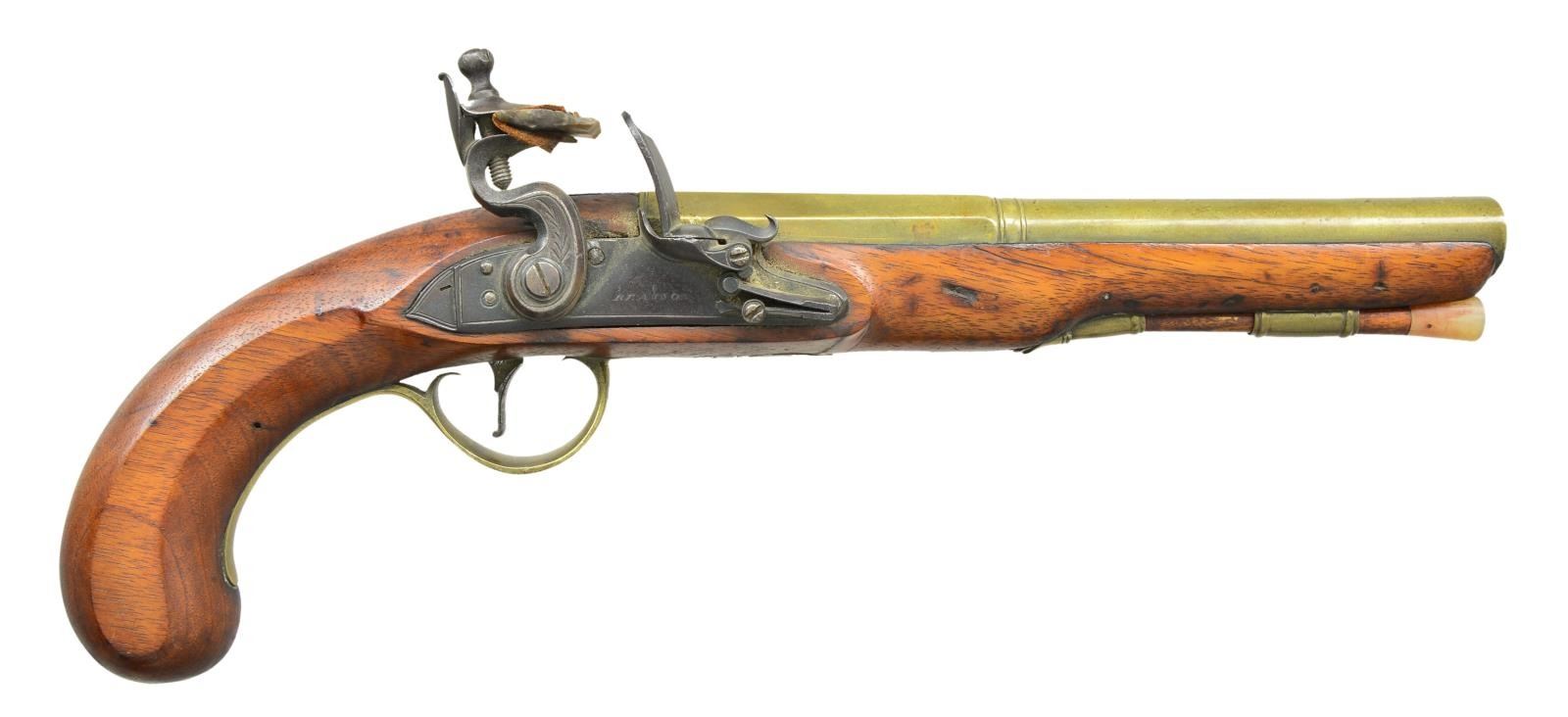 BY REA & SON. Cal. 60 (pr). NSN (pr). (CA 1800). John Rea of London is known to be working with his first son between 1801-1804. This good pair of pistols probably date from that time. They have 8" barrels without patent breeches that are octagonal at breech and transition to round through a wedding band to flared muzzles. Top left flats are stamped with London proofs and John Rea barrel makers mark "IR" under flourish. Top flats are engraved "LONDON". Barrel tangs have border and foliate engraving. Locks having chamfered flat plates with rebated tails are fitted with high breasted serpentine cocks, rounded pans, bridled frizzens and feather springs with rollers which have dog nose finials. Center of each lock is engraved "REA & SON". Mahogany stocks with flat faced bag grips extend to muzzles and are brass mounted. Mounts are lightly engraved. Trigger guards have stylized pineapple finials. Stocks are pinned to barrels and walnut ramrods with tan horn tips mount through single beaded pipes and matching thimbles. UNATTACHED ACCESSORIES: 3 letters from J. Roberts & Son regarding purchase and export of these pistols in 1971. CONDITION: good. Barrels showing considerable old cleaning with softening of edges are now toned to dark gold. Locks show old cleaning and are now gray brown and have scattered pitting on cocks and frizzens. Stock show an old oil refinish with light subsequent marks. Bores are good. Lock of one pistol does not have half cock notch, otherwise mechanically good. (01-21795/MGM) (2). ANTIQUE. $2,000-3,000.