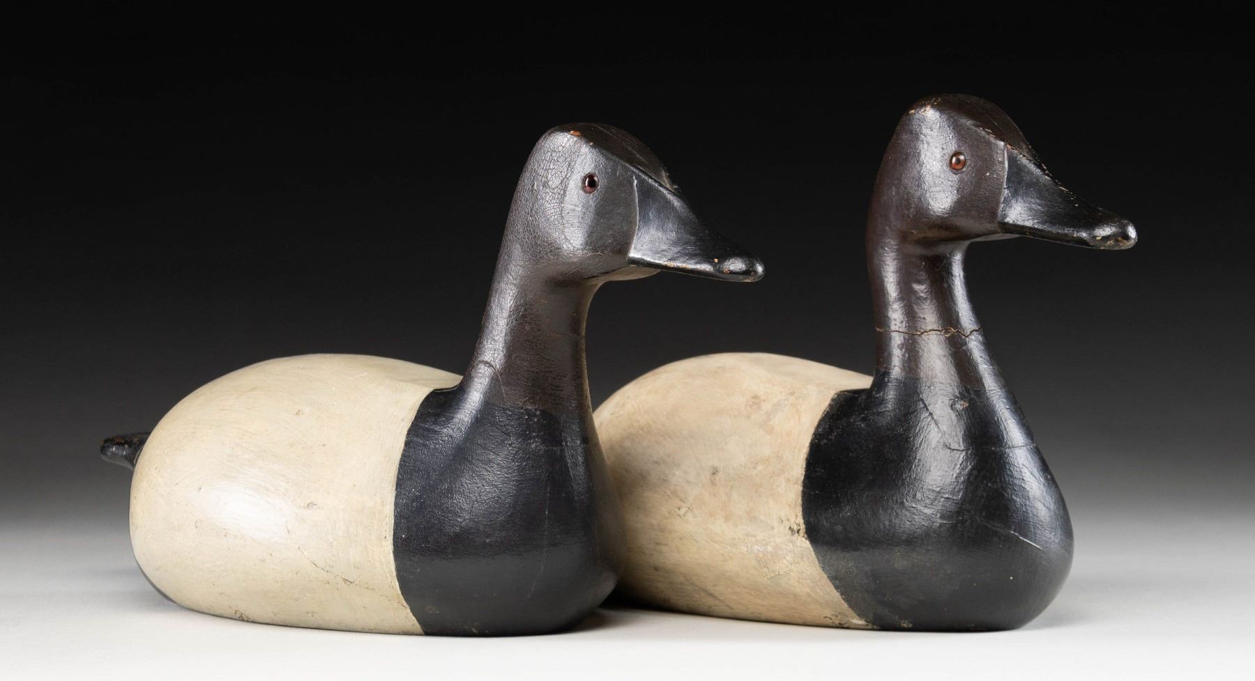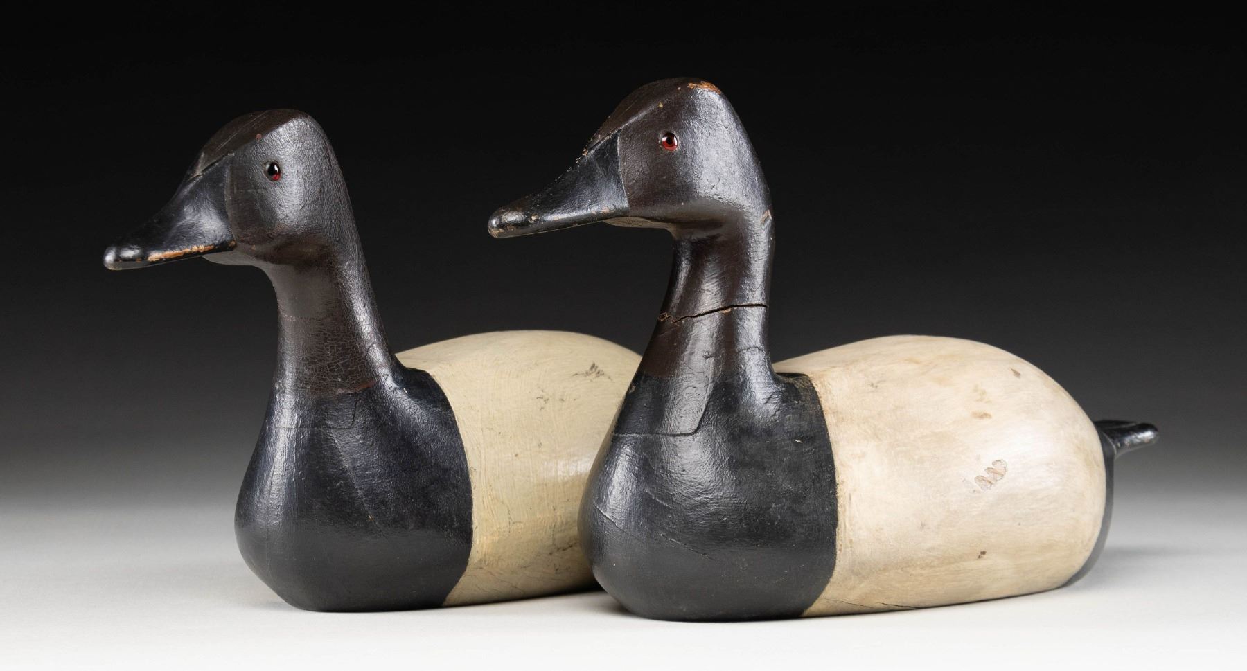 1) 15" & 17" solid bodied attractively carved with glass eyes. CONDITION: original paint with some chipping. 2) 15" bird has cracked and repaired neck. PROVENANCE: From the Private Collection of Berrien Moore III. (02-25872-2/MGM). $300-500.