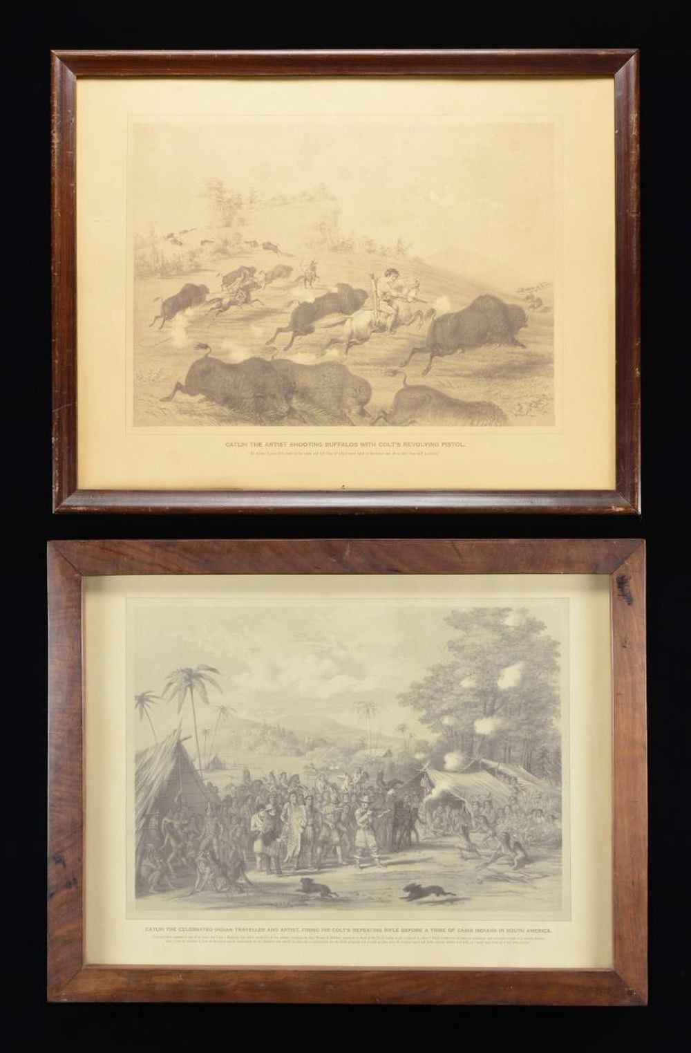 USING COLT REVOLVER & REVOLVING RIFLE. These prints, which are very rare today, are copies of original 1860 color lithographs. Date of these 20th-century offset lithographs is unknown. The images, in larger frames, measure about 21" x 16". George Catlin (1796–1872) traveled to the west to paint scenes and portraits of Native Americans. These two original paintings, made in the 1830s, feature Paterson colts. The guns have since been upgraded to dragoons and 1855 revolving rifles. CONDITION: one missing glass, with scratches; the other appearing in good overall condition. PROVENANCE: Martin Lane Historic & Western Americana Lifetime Collection. (02-21581/JS). $200-300.