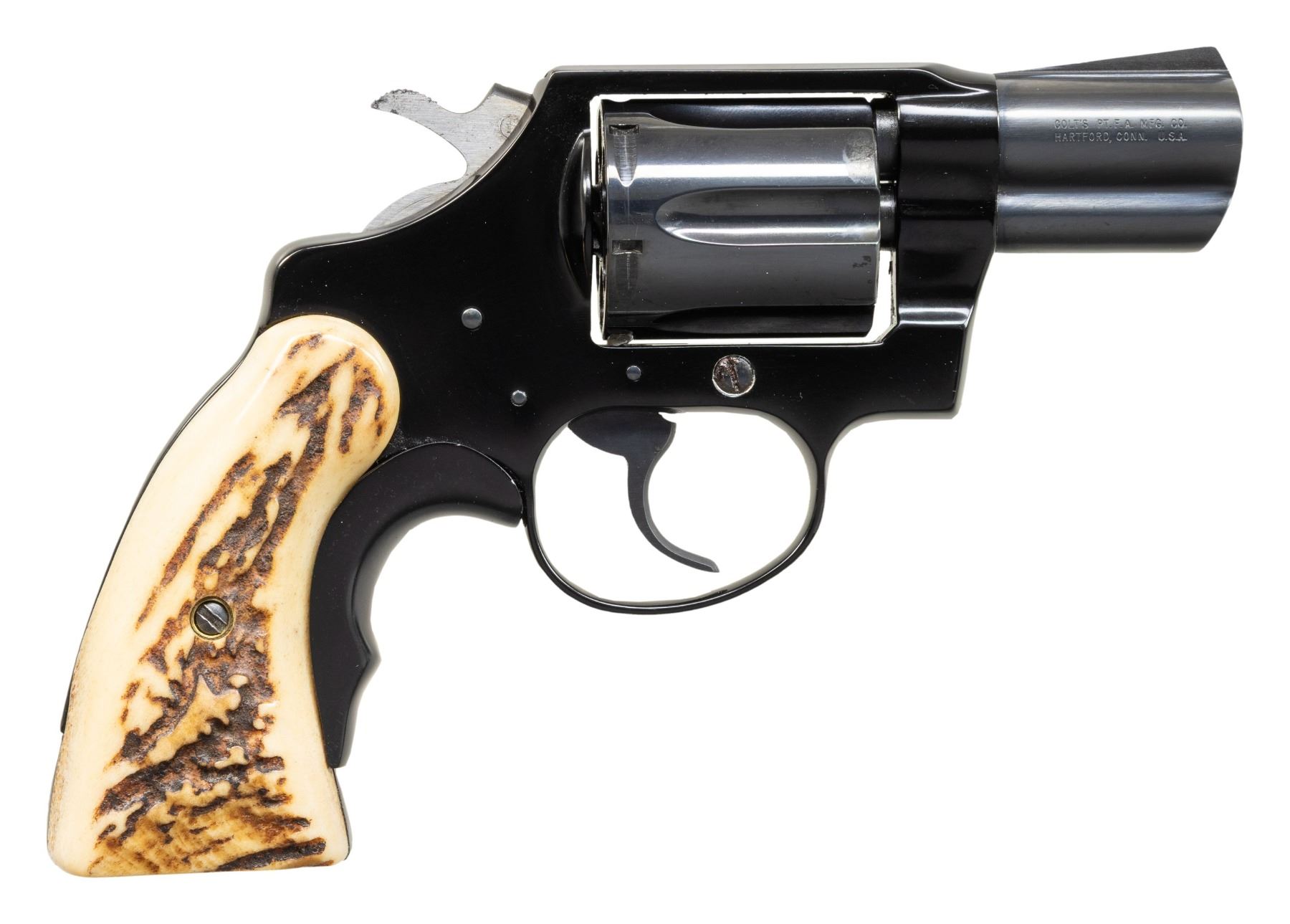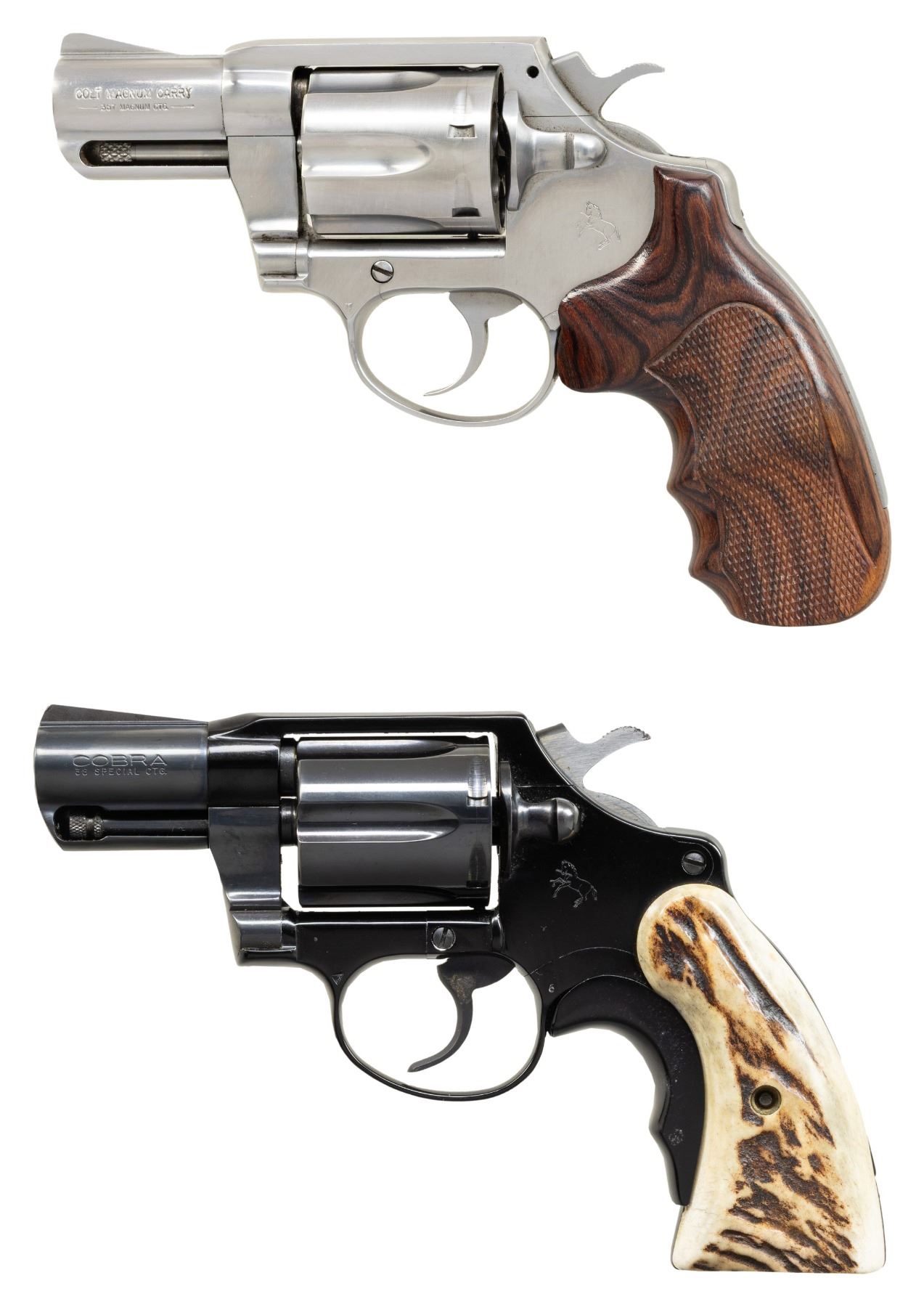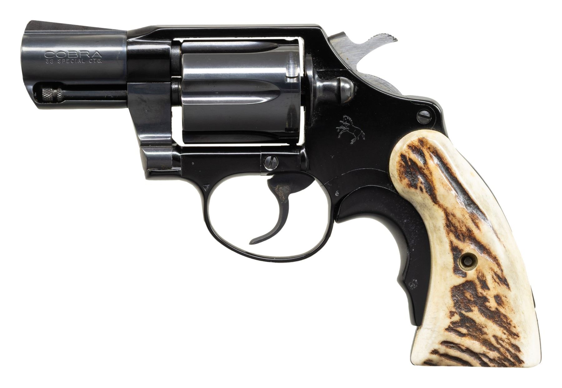 2) COLT COBRA DOUBLE ACTION REVOLVER. Cal. 38 Spcl. S# F70232. Bbl. 2 1/8". Cobra double action revolver mfg. by Colt in 1974. Left side of the bbl. is marked with the model and cal. designations, with Colt's 2-line address marked on the right. Left side of the frame is marked with the Rampant Colt logo. Alloy frame exhibits a black enamel type finish, with steel parts exhibiting a blue finish. Sides of hammer are polished in-the-white. Frame is mounted with 2-piece stag grips, with the front grip strap featuring a black aluminum grip extension. Standard fixed blade front sight and square frame notched rear sight. Matching numbers are present on the frame and cyl. crane. CONDITION: metal components retain the vast majority of their original factory finishes, exhibiting some scattered spots of mild oxidation on steel parts. Sides of hammer exhibit some scattered spots of age related discoloration. Mirror bore, retaining well defined rifling throughout. Proper manual mechanics, although the cyl. latch must be retracted for the cyl. to lock into place. Grips are very good overall. (25-4684/MLW). CURIO. $650-1,000.