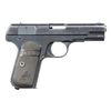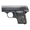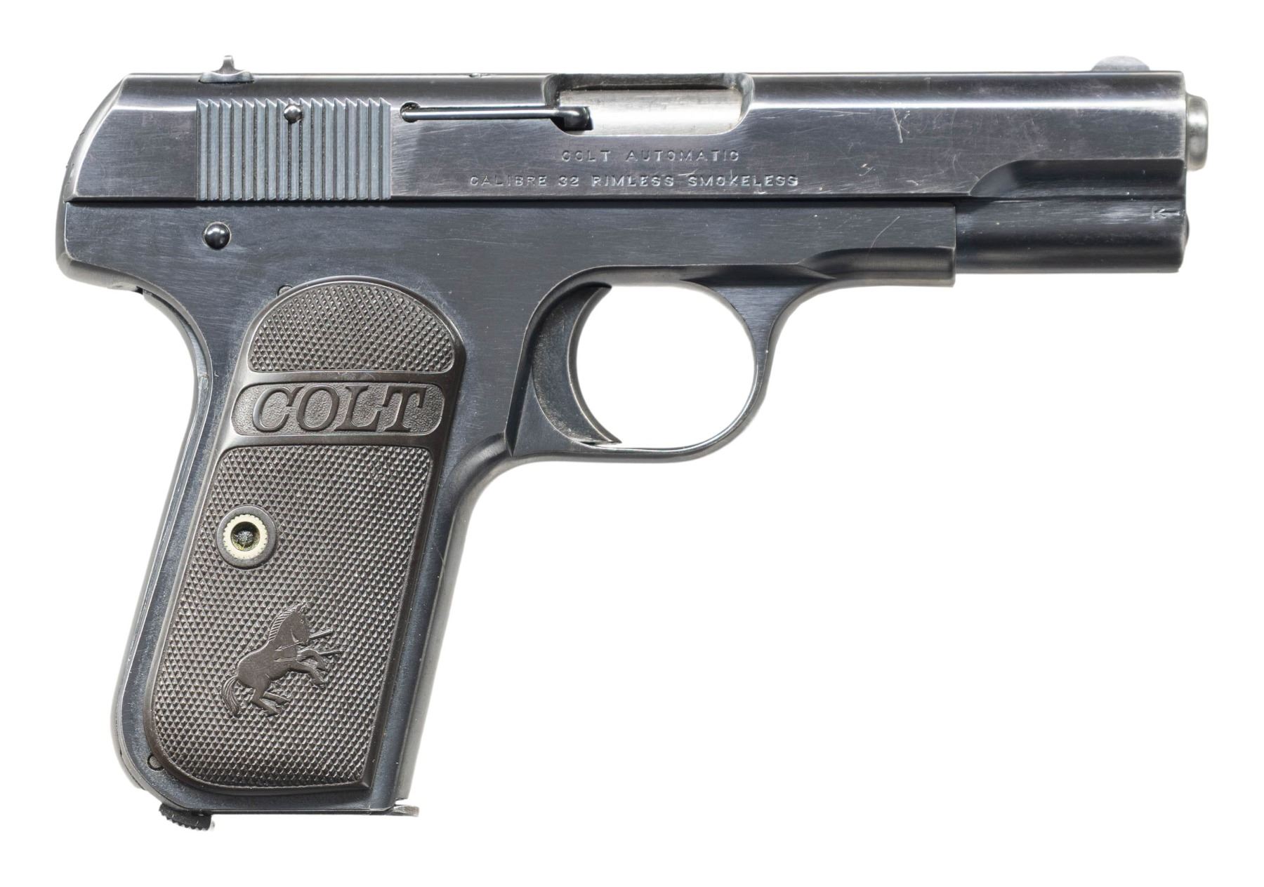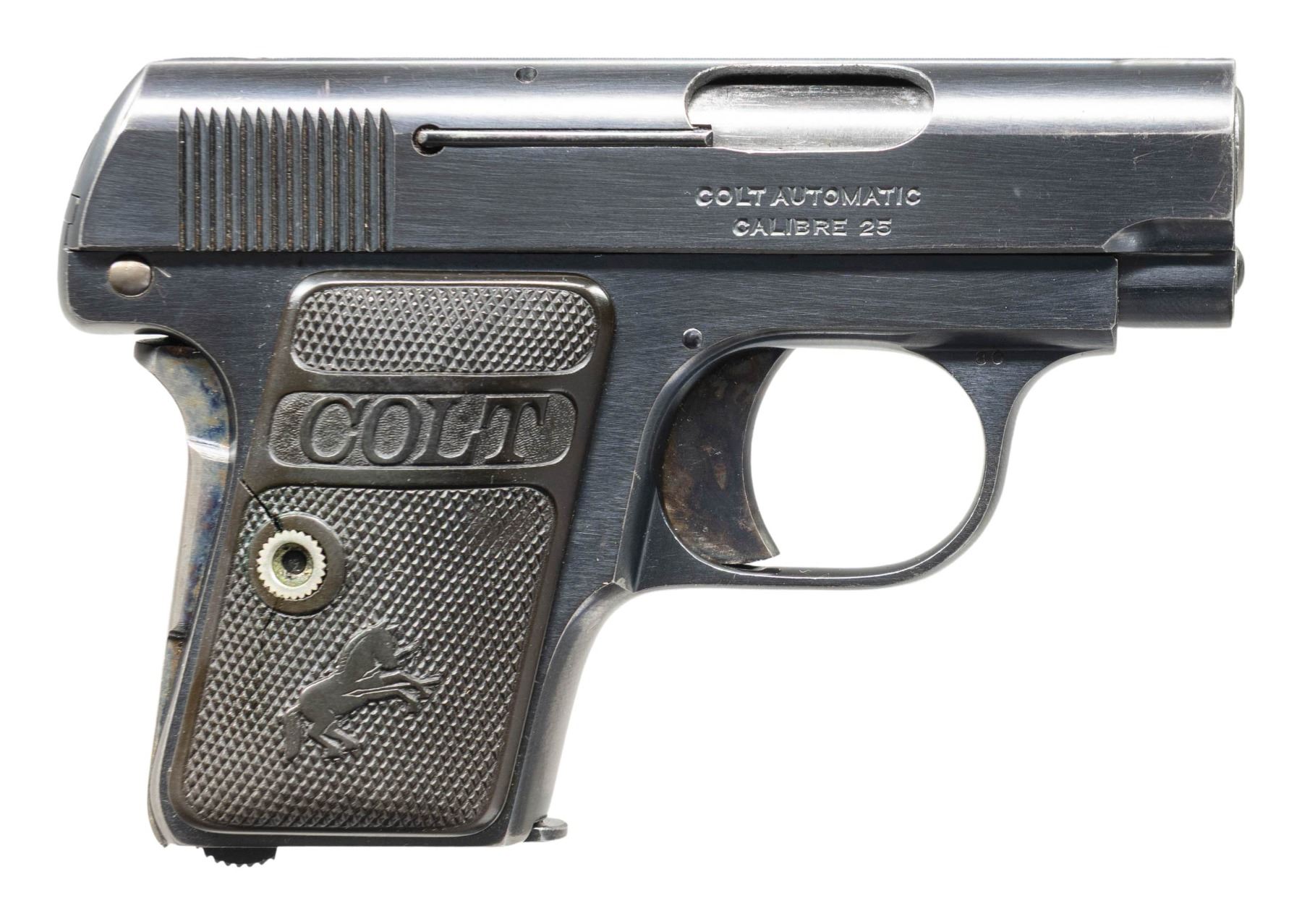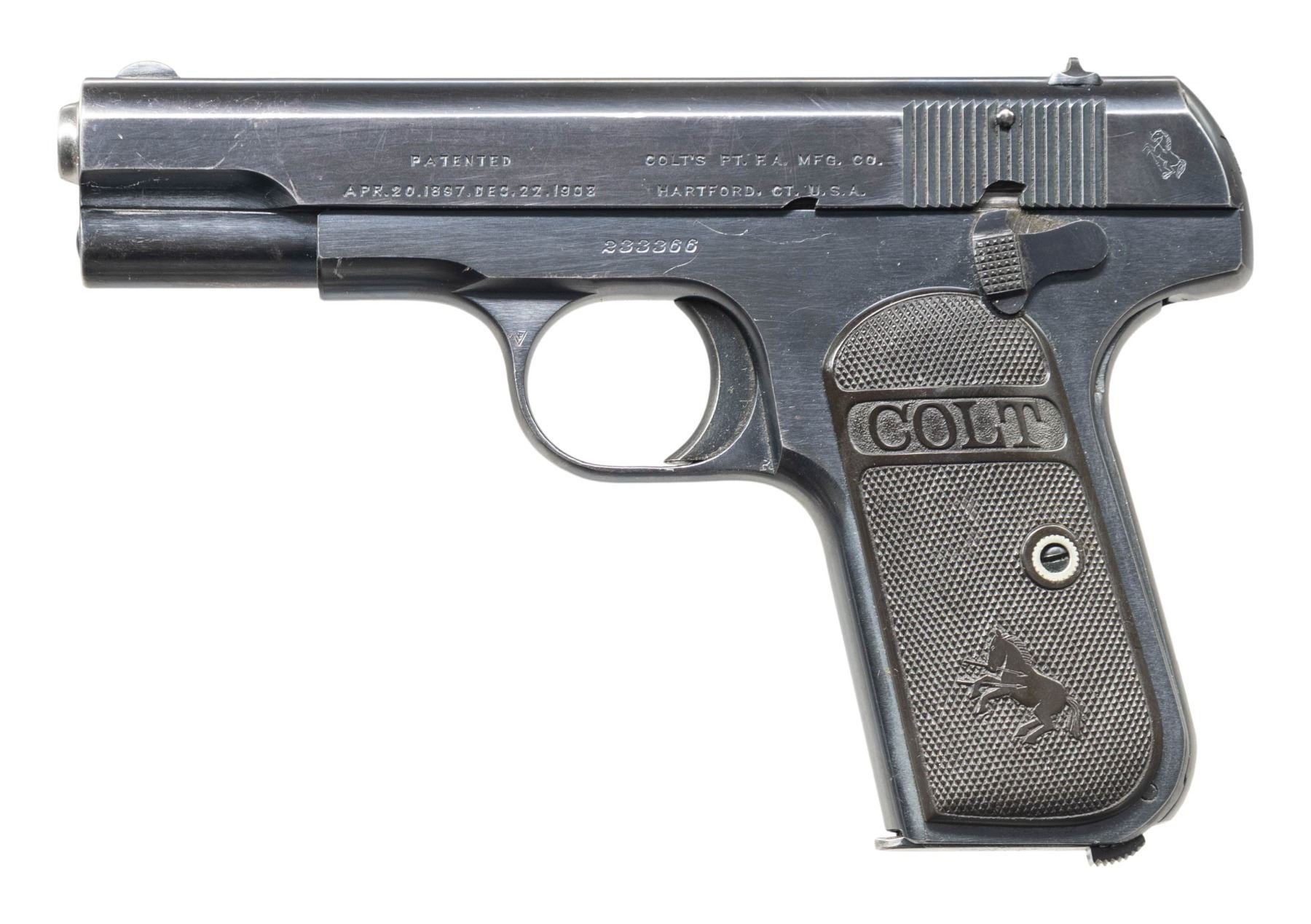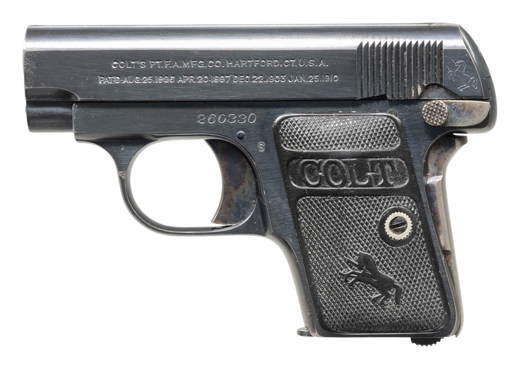 HAMMERLESS SEMI-AUTOMATIC PISTOLS. 1) COLT MODEL 1908 VEST POCKET SEMI-AUTOMATIC PISTOL. Cal. 25 ACP. S# 260330. Bbl. 2 1/8". Model 1908 Vest Pocket semi-automatic pistol mfg. by Colt in 1920. Left side of the slide is marked with Colt's 2-line mfg. and patent information, followed by the Rampant Colt logo, with "COLT AUTOMATIC/ CALIBRE 25" marked on the right. Metal components exhibit a blue finish overall, save for on the trigger, safety lever, and grip safety, which exhibit a case colored finish. Bbl. is polished in-the-white. Frame is mounted with 2-piece Colt checkered brown hard rubber grips. Slide features a grooved concave rib, featuring an integrally machined diminutive blade front sight and square notch rear sight. Slide matches the frame via the full S# on the interior. MAGS: 1 dual-tone 6-rd. CONDITION: metal components retain the vast majority of their original factory blue finish, exhibiting some light edge wear, with a few superficial marks from handling and storage. Case colored parts retain good amounts of their original finish, save for on the rear of the grip safety, which has mostly faded to a gray patina. Bright bore, exhibiting consistent light pitting, while retaining well defined rifling throughout. Grips show light smoothing and scattered superficial handling marks overall, with the right panel exhibiting 2 cracks that stem from the screw slot. (25-4651/MLW). 2) COLT MODEL 1903 HAMMERLESS SEMI-AUTOMATIC PISTOL. Cal. 32 Rimless. S# 233366. Bbl. 3 3/4". Model 1903 Hammerless semi-automatic pistol mfg. by Colt in 1917. The left side of the slide is marked with Colt's patent information, followed by Colt's mfg. information and the Rampant Colt logo, with "COLT AUTOMATIC/ CALIBRE 32 RIMLESS SMOKELESS" marked on the right. Metal components exhibit a blue finish overall, save for on the chamber and muzzle areas of the bbl., which are polished in-the-white. Frame is mounted with 2-piece Colt checkered brown hard rubber grips. Standard fixed half-moon blade front sight and dovetailed U-notch rear sight. MAGS: 1 dual-tone 8-rd. mag. CONDITION: metal components retain the majority of their original factory blue finish, exhibiting light to mild edge wear, with scattered scratches and light superficial handling marks present overall. Bright bore, exhibiting consistent light to mild pitting, while retaining strong rifling throughout. Proper manual mechanics. Grips show some light to mild smoothing, as well as some superficial marks from handling and storage, but otherwise remain sound. (25-4694/MLW). BOTH CURIO. $800-1,200.