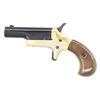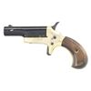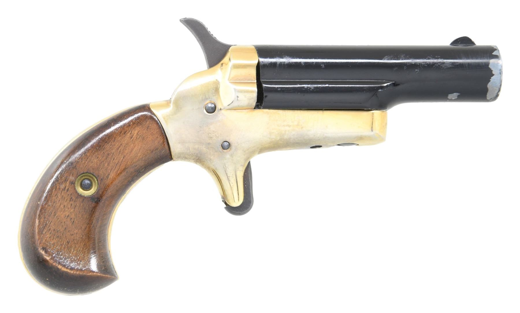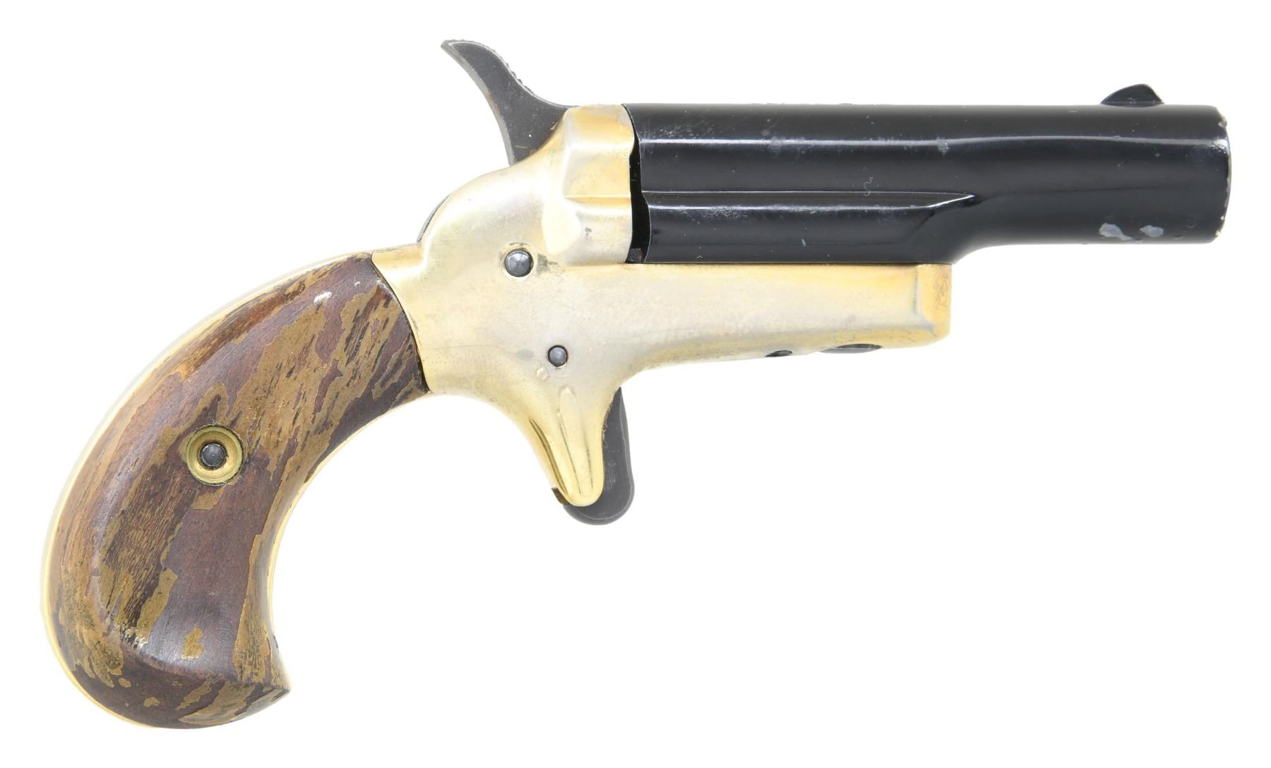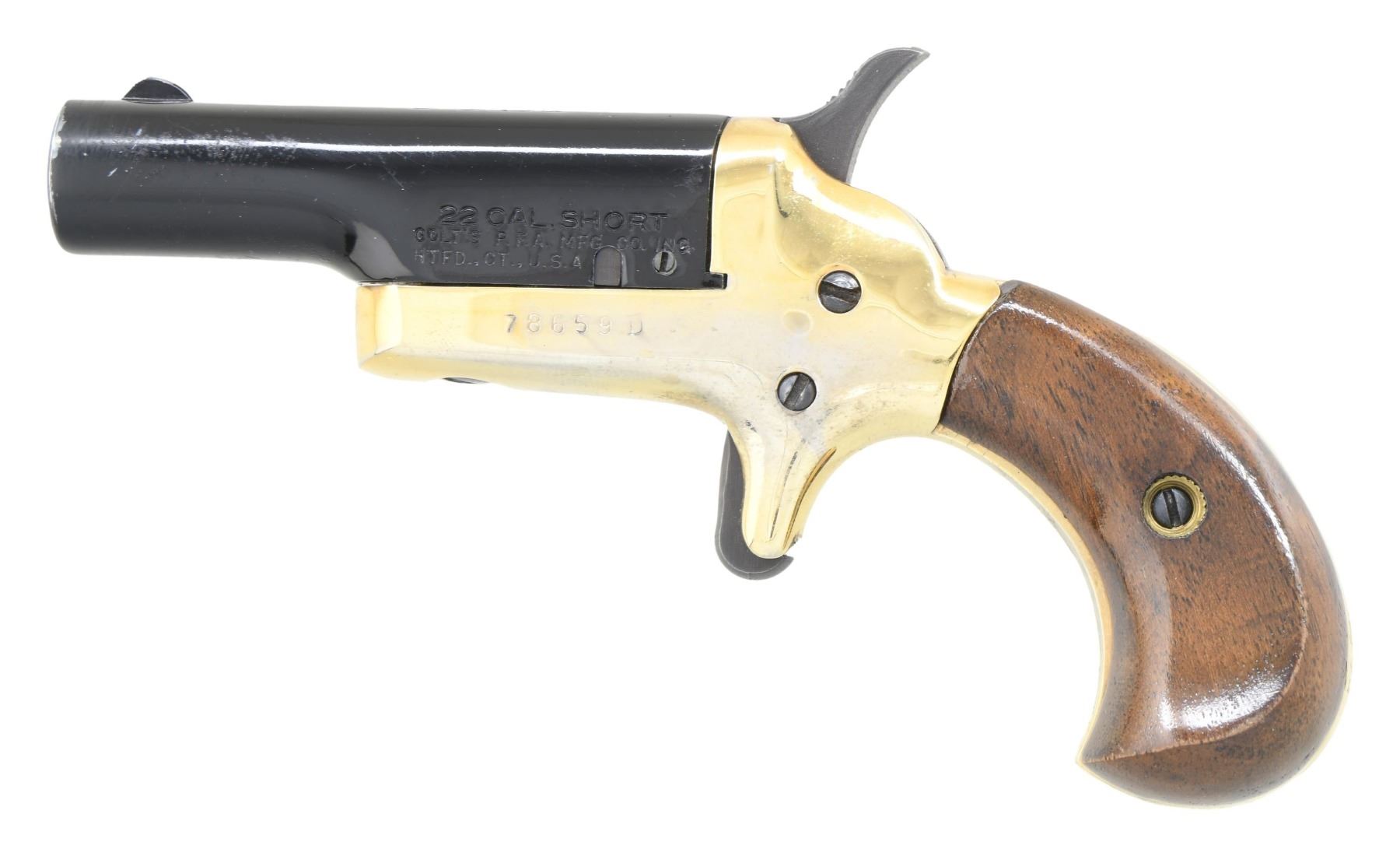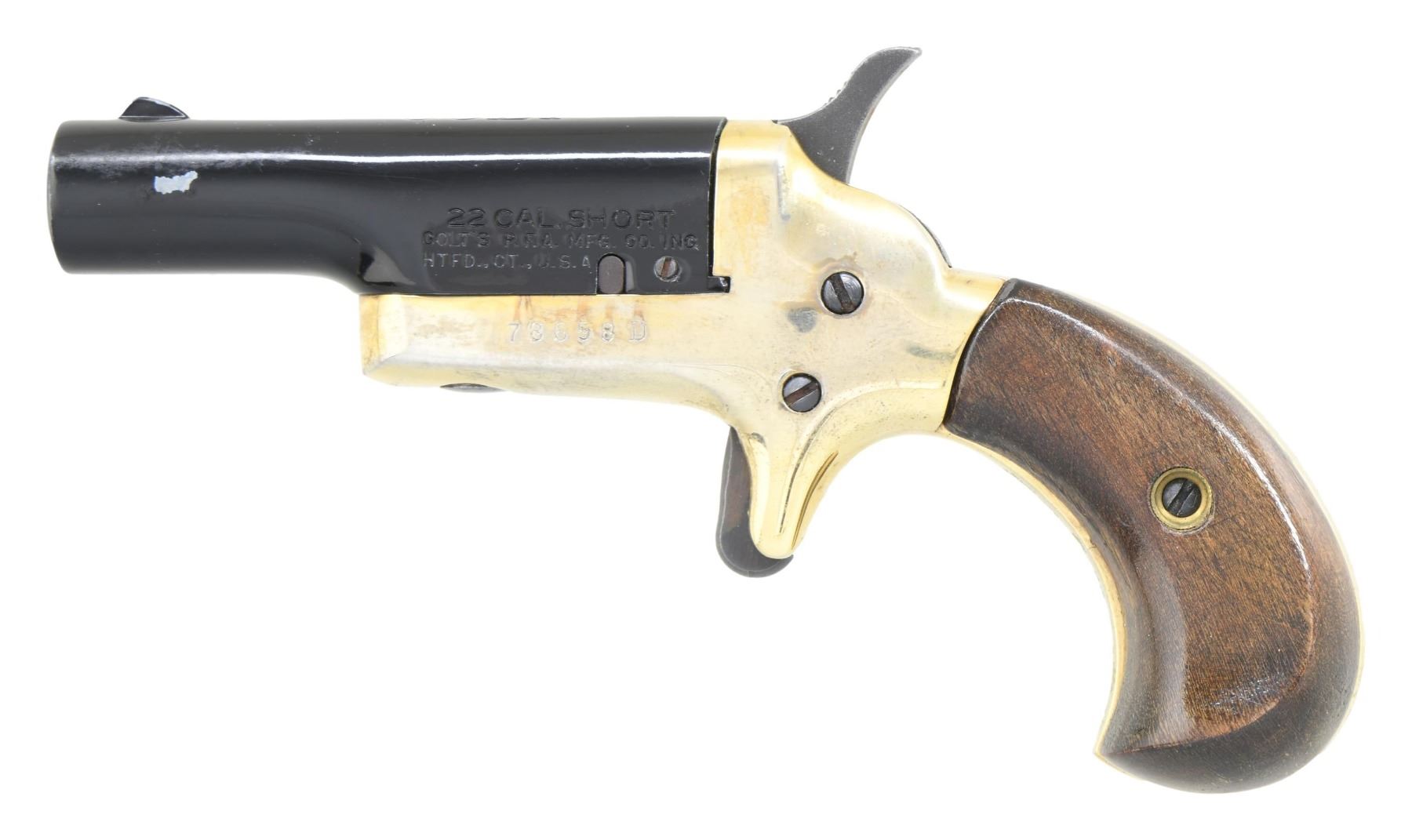 PISTOLS IN DISPLAY CASE. 1) COLT FOURTH MODEL DERRINGER. Cal. 22 S. S# 78658D. Bbl. 2 1/2". Fourth Model Derringer single shot pistol mfg. by Colt. Left side of the bbl. is marked with the cal. designation above Colt's mfg. information, with "-COLT-" marked over the top. Brass frame, with black enamel finished alloy bbl. Frame is mounted with 2-piece smooth wood birds head grips. CONDITION: good, with the frame exhibiting some areas of patina. Bbl. exhibits a few scattered spots of bubbling and flaking. Mirror bore, exhibiting strong rifling throughout. Grips are very good overall. (25-1636/MLW). 2) COLT FOURTH MODEL DERRINGER. Cal. 22 S. S# 78659D. Bbl. 2 1/2". Fourth Model Derringer single shot pistol mfg. by Colt. Left side of the bbl. is marked with the cal. designation above Colt's mfg. information, with "-COLT-" marked across the top. Brass frame, with black enamel finished alloy bbl. Frame is mounted with 2-piece smooth wood birds head grips. UNATTACHED ACCESSORIES: wood Colt display case. CONDITION: good, with the frame exhibiting some scattered spots of patina. Bbl. exhibits some scattered spots of bubbling and flaking. Mirror bore, exhibiting strong rifling throughout. Grips are very good overall. Case shows scattered marks from handling and storage, but otherwise remains sturdy and serviceable. (25-1637/MLW). BOTH CURIO. $400-600.