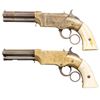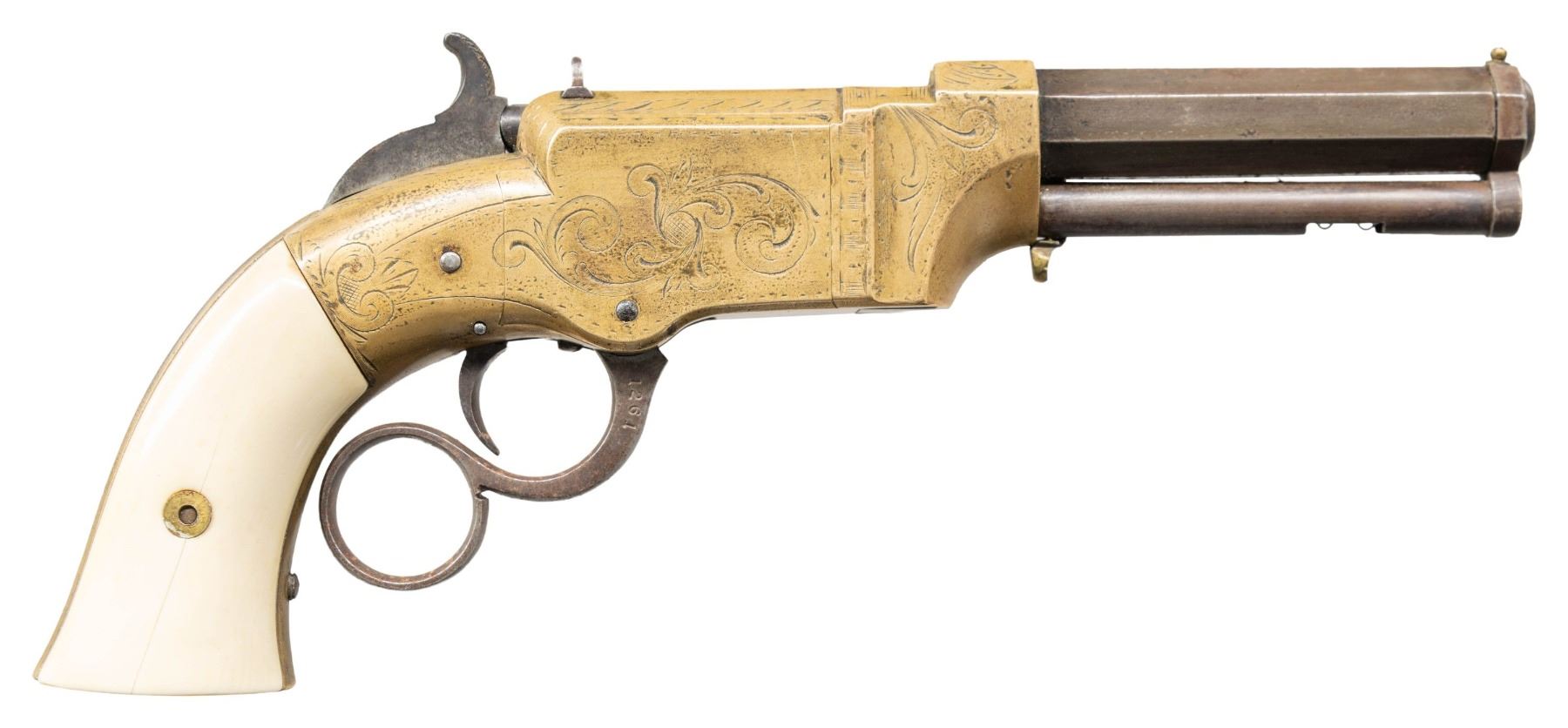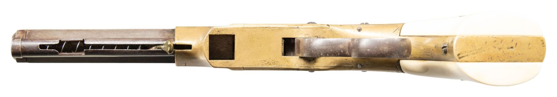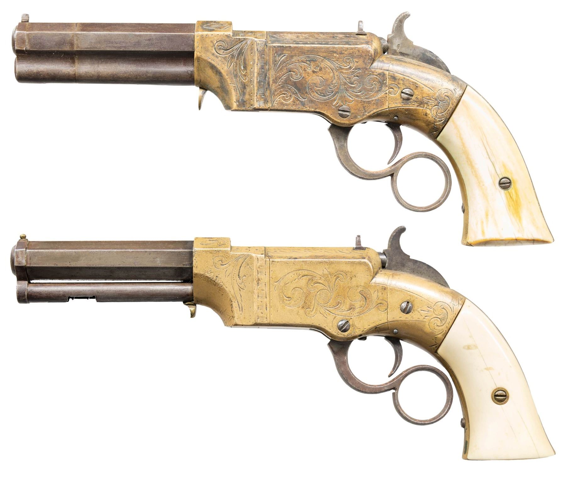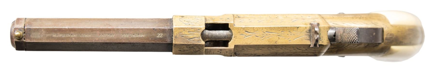 VOLCANIC LEVER ACTION PISTOLS. Cal. 31. S# 1261/1966. Originally manufactured between 1857-1860 after the breakup of Volcanic Arms Company by the newly formed New Haven Arms Company, continuing making same design for the self-contained "rocket ball" cartridges. Standard configuration 3.5" octagonal barrel, integral 6-shot spring loaded magazines, S# 1261 magazine has been modified to be loaded on bottom instead of standard from face. Both stamped "NEW HAVEN CONN" PATENT FEB 14 1854" in one line on top flat, fixed notch rear sight, pinched post front sight, brass frame, ivory grips. CONDITION: good to very good overall as customized after manufacture with engraving & ivory grips. Mechanics fine, good rifled bores. (01-26628, 01-26639/JS). ANTIQUE. $4,000-6,000.