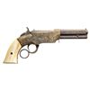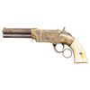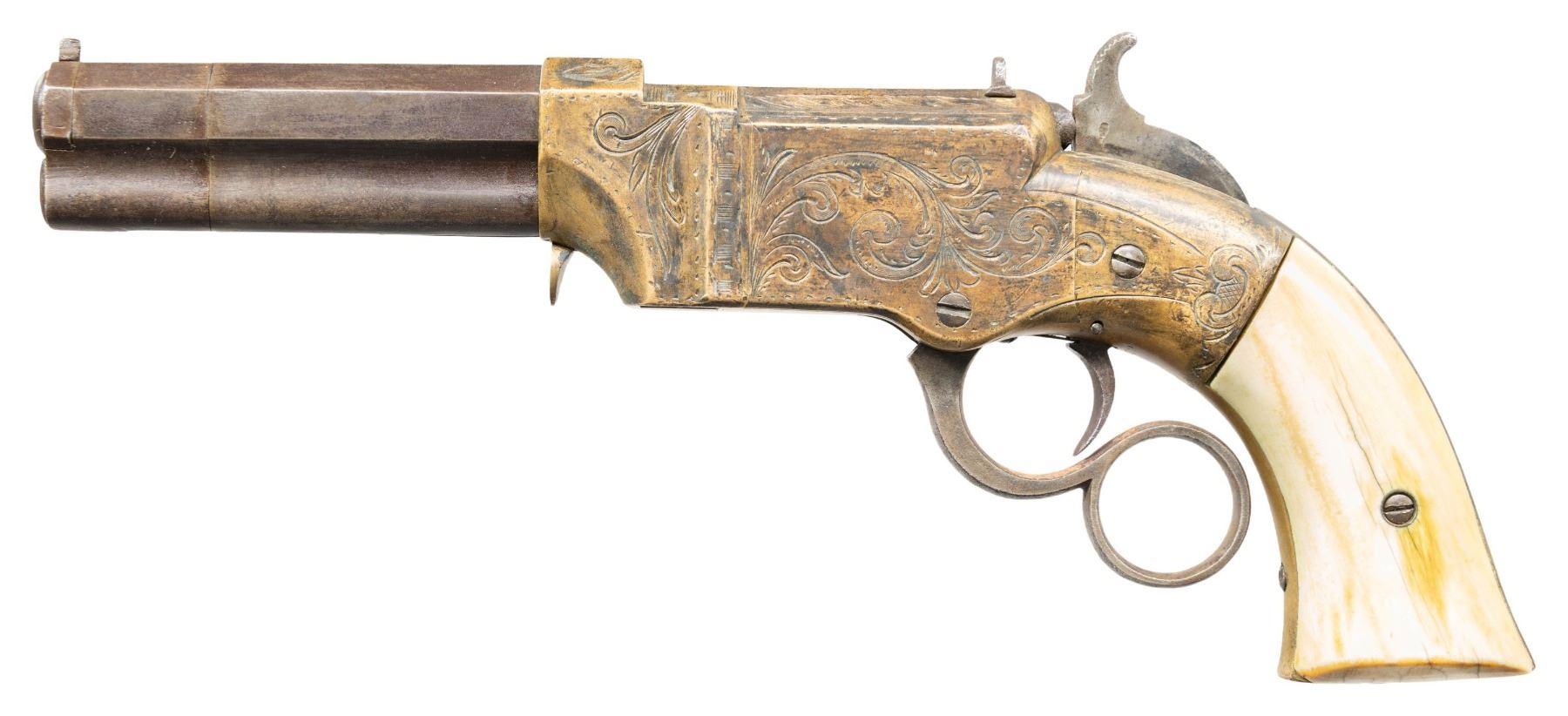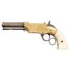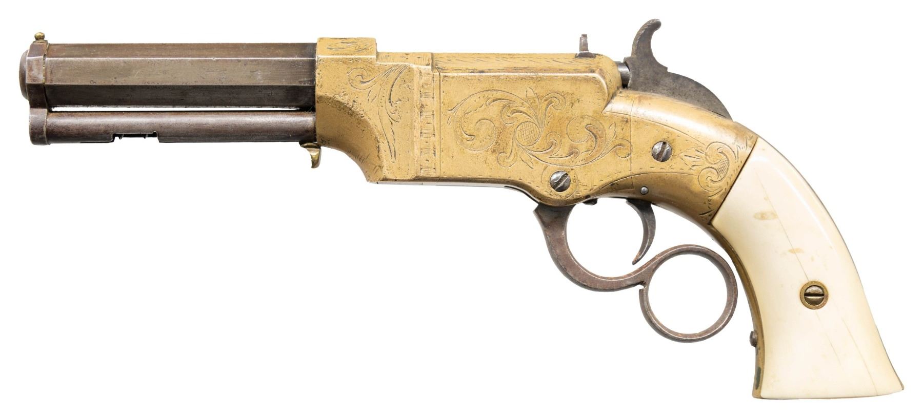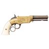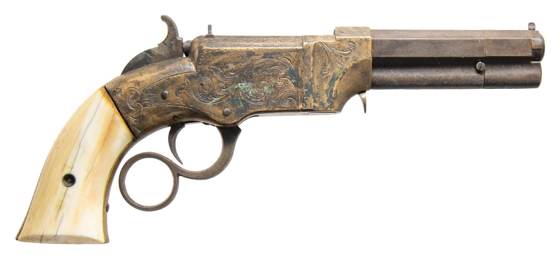 VOLCANIC LEVER ACTION PISTOLS. Cal. 31. S# 1261/1966. Originally manufactured between 1857-1860 after the breakup of Volcanic Arms Company by the newly formed New Haven Arms Company, continuing making same design for the self-contained "rocket ball" cartridges. Standard configuration 3.5" octagonal barrel, integral 6-shot spring loaded magazines, S# 1261 magazine has been modified to be loaded on bottom instead of standard from face. Both stamped "NEW HAVEN CONN" PATENT FEB 14 1854" in one line on top flat, fixed notch rear sight, pinched post front sight, brass frame, ivory grips. CONDITION: good to very good overall as customized after manufacture with engraving & ivory grips. Mechanics fine, good rifled bores. (01-26628, 01-26639/JS). ANTIQUE. $4,000-6,000.