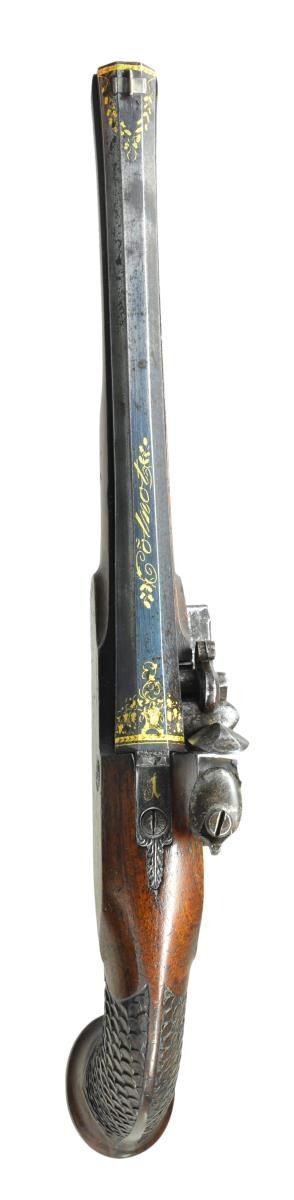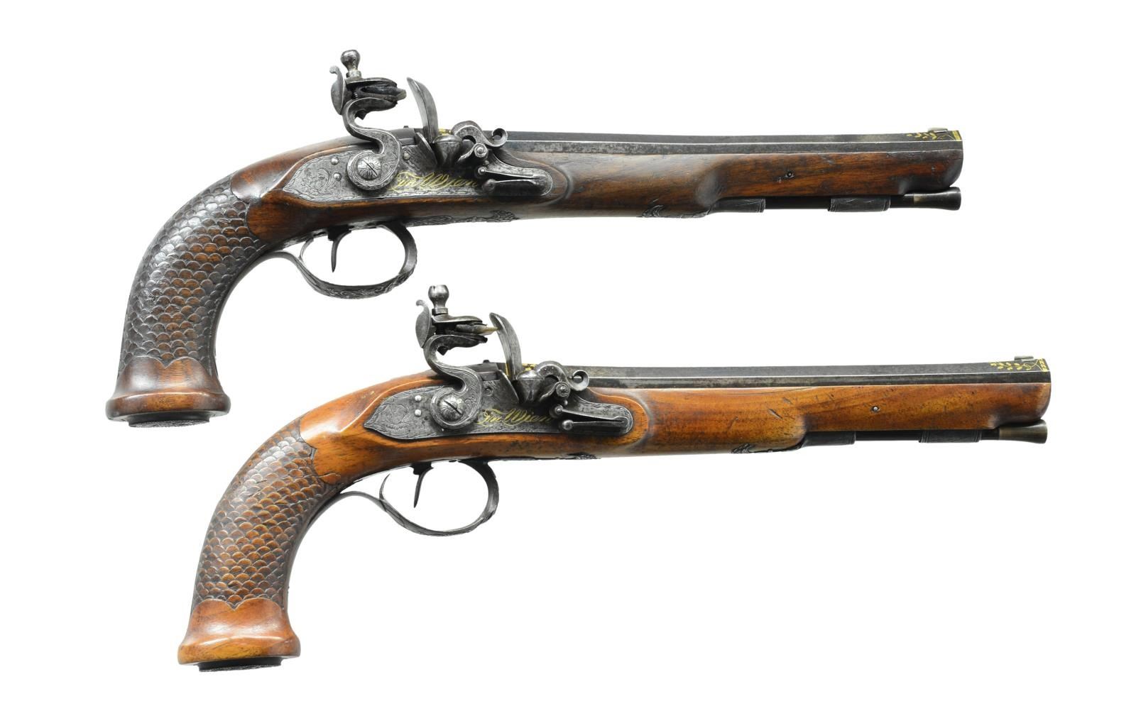 OFFICER PISTOLS BY COLNOT. Cal. 48. NSN. Bbl. 9 1/4" swamped oct., have flares to muzzles & do not have patent breeches. Touch holes are gold lined. Bbls. decorated w/ gold inlaid thin scroll w/ floral highlights at breeches & muzzles. Top flats are inlaid “COLNOT” in script. Locks w/ flat plates feature serpentine cocks, waterproof gold lined pans, bridled frizzens & roller feather springs w/ out finials. Locks & hammers are feather bordered engraved & have sprays of armorial engravings on tails & some scrolls on cocks. Areas under pans are inlaid “IN WIEN”. Triggers are set. Plain walnut stocks extend to muzzles are pinned to bbls. & have fish scale carved flared grips. Iron furniture is relief engraved w/ acanthus, scroll & baskets of flowers as finials to trigger guards & thimbles. Ebony ramrods w/ horn tips mount through beaded single pipes & matching thimbles. Phillip Colnot worked in Wein (Vienna) from 1800-1816 during the wars with Napoleon. CONDITION: bbls. retain about 30% bright blue w/ some scattered freckling & show evidence of cleaning. Locks are cleaned to gray brown. Stocks retain most of their original finish w/ a number of light marks. One pistol has repaired crack through grip. Furniture w/ perhaps half its blue is turning brown at grips. Rifled bores are very good to fine. (01-19866/MGM). ANTIQUE. $5,000-7,000.