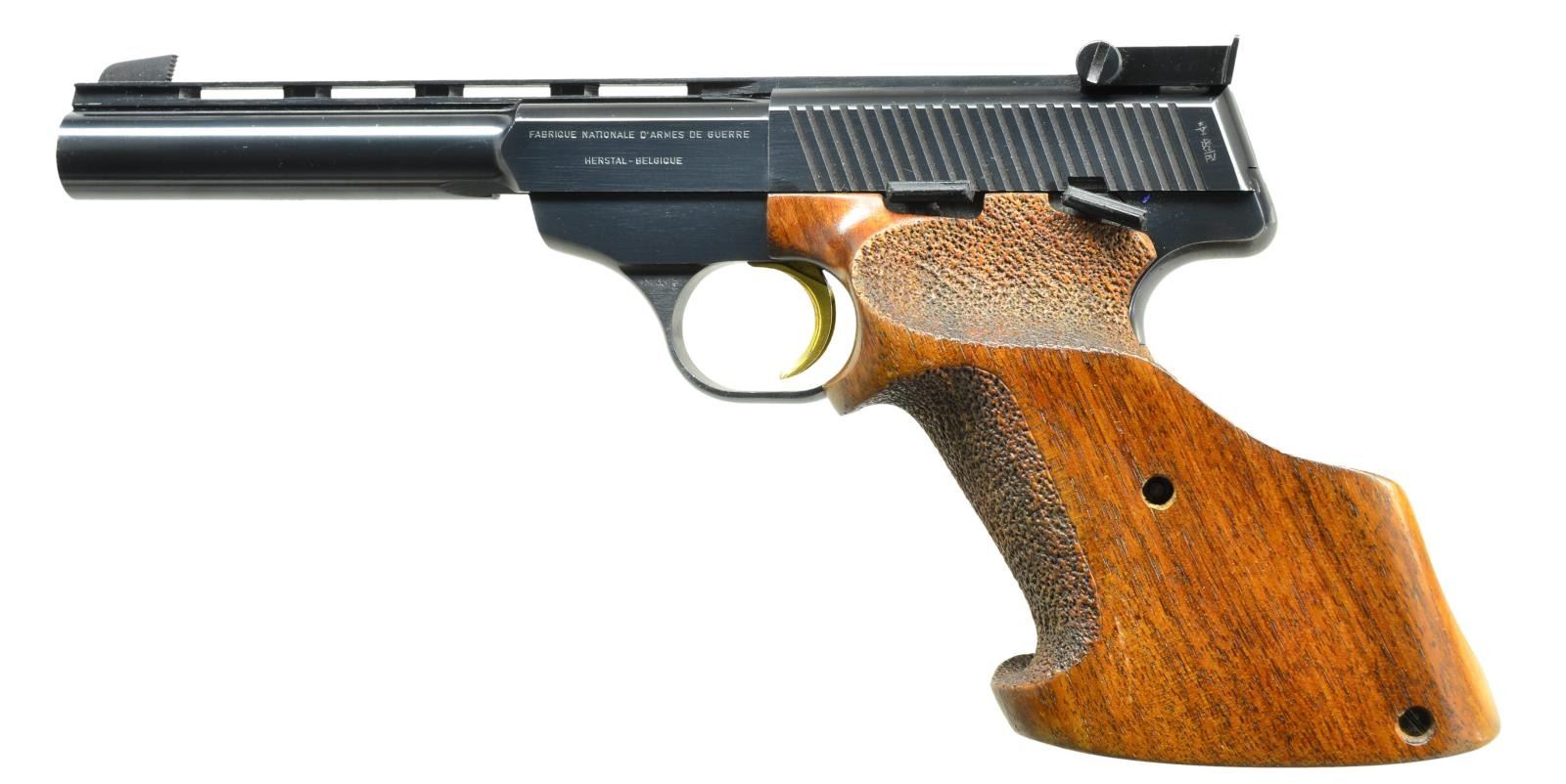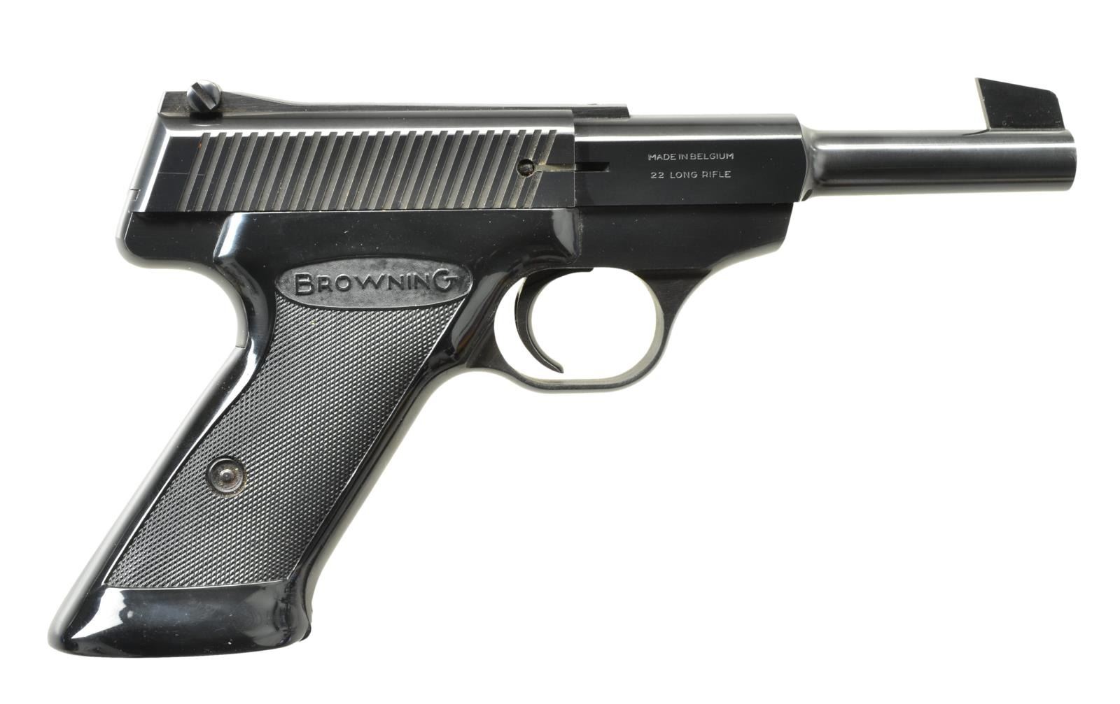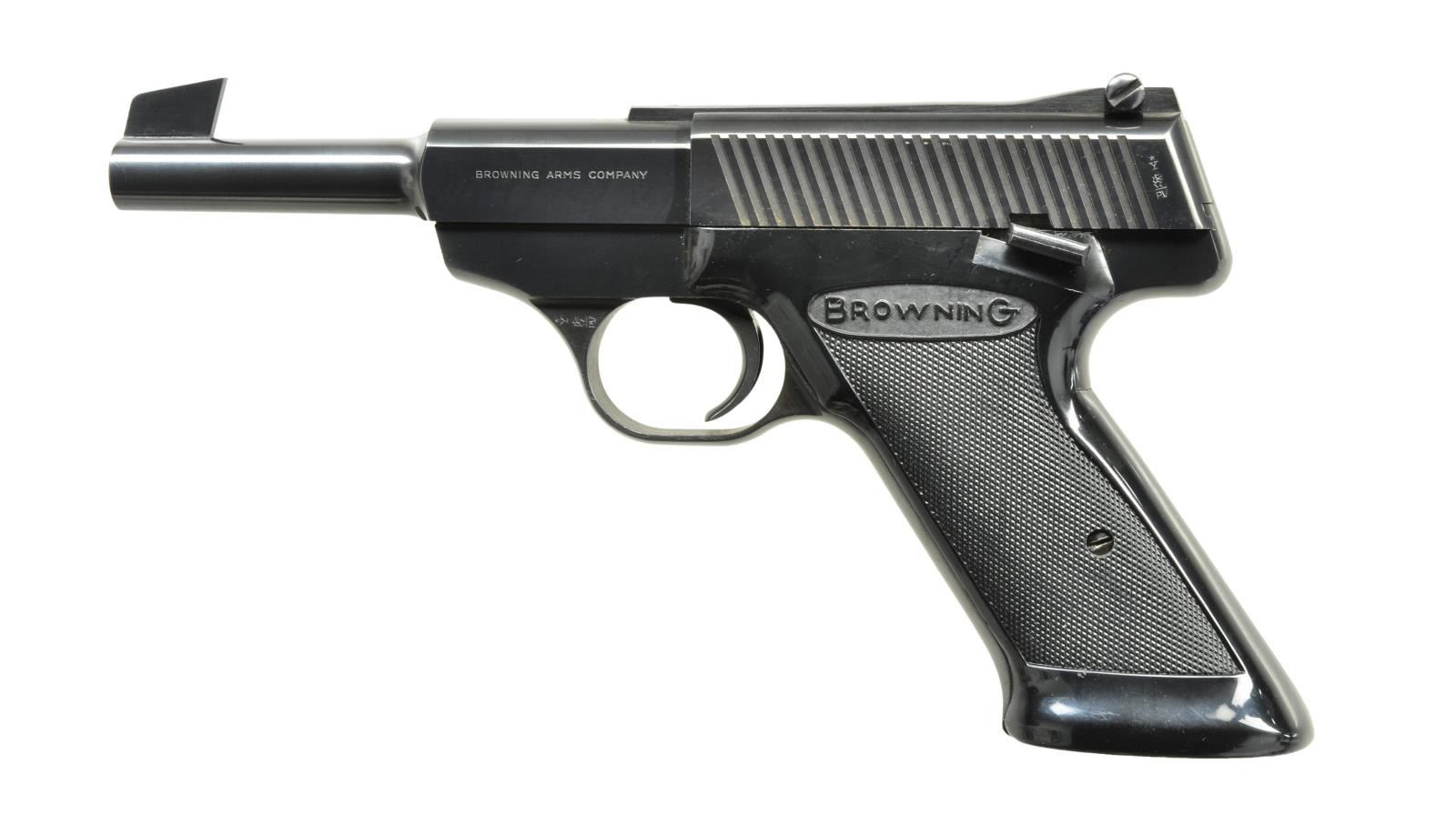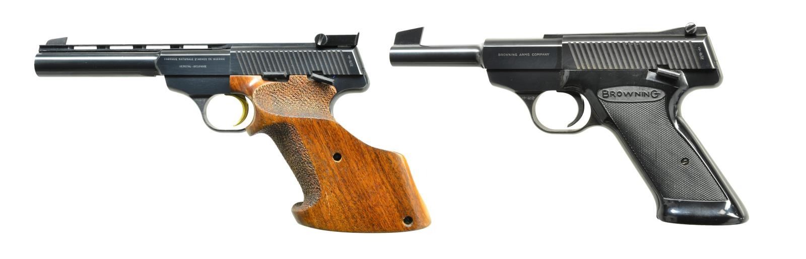 2) Cal. 22 LR. S# 91371P7. Bbl. 4 1/2". Blued steel frame & bbl. Target blade front sight & adj. rear sight. Black plastic grips w/ Browning insignia. Left side safety & bottom mag. release. Fully serrated slide. These guns were mfg. from 1961-1974 by FN, this particular example being mfg. in 1967. MAGS: 1-10 rd. UNATTACHED ACCESSORIES: period correct Nomad owner’s manual & a Browning gun rug. CONDITION: all outward appearances illustrate little use & exemplary care Bluing is complete & consistent on all exposed metal surfaces aside from a light thinning on the receiver rails below the slide from mechanical intervention. Shiny bore w/ strong rifling. Fire control mechanism appears to function correctly when cycled by hand. (21-3828/JZ). BOTH CURIO. $1,200-1,700.