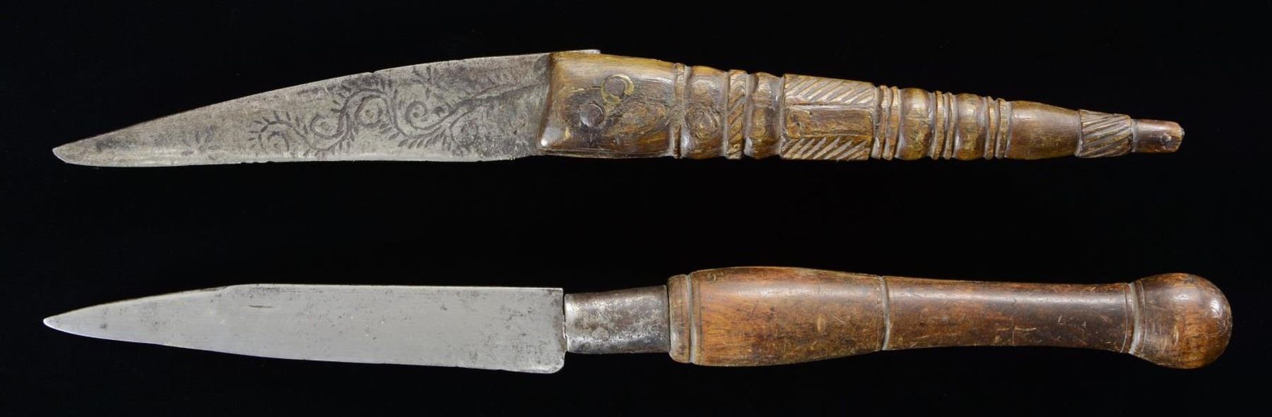 One of the two knives is pictured and described on page 197 in "The Fur Trade" by author Milton von Damm: "two folding knives, both of which pivot on a single pin that also attaches the blade to their handles. One handle is round wood with three groves and a slit along the handle to house the blade's edge. This knife is ten inches long when opened and has a four and one half inch blade. The blade is very loose and the knife is a type that suggests a mid eighteenth century origin. The second knife has a primitive carved horn handle that could be either colonial Spanish or French. The blade also contains a hand made vine pattern. This knife is nice and one half inches long with a four and one quarter inch blade." CONDITION: good to very good overall. PROVENANCE: Don Euing, 1989; Lifelong Collection of author Milton von Damm. (02-22236/JS). $200-300.