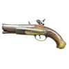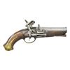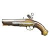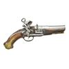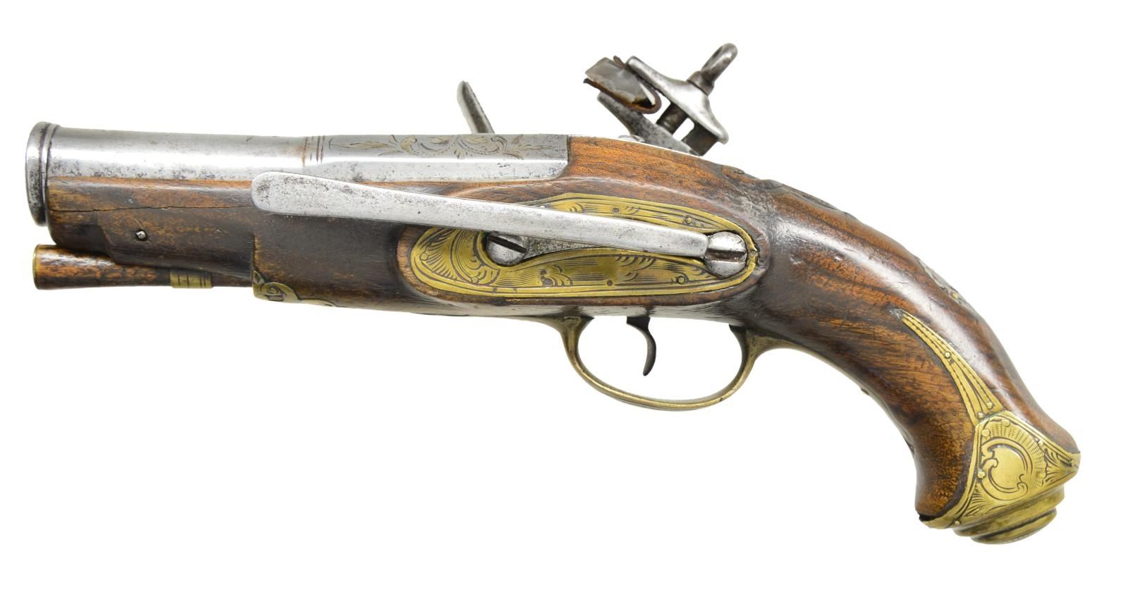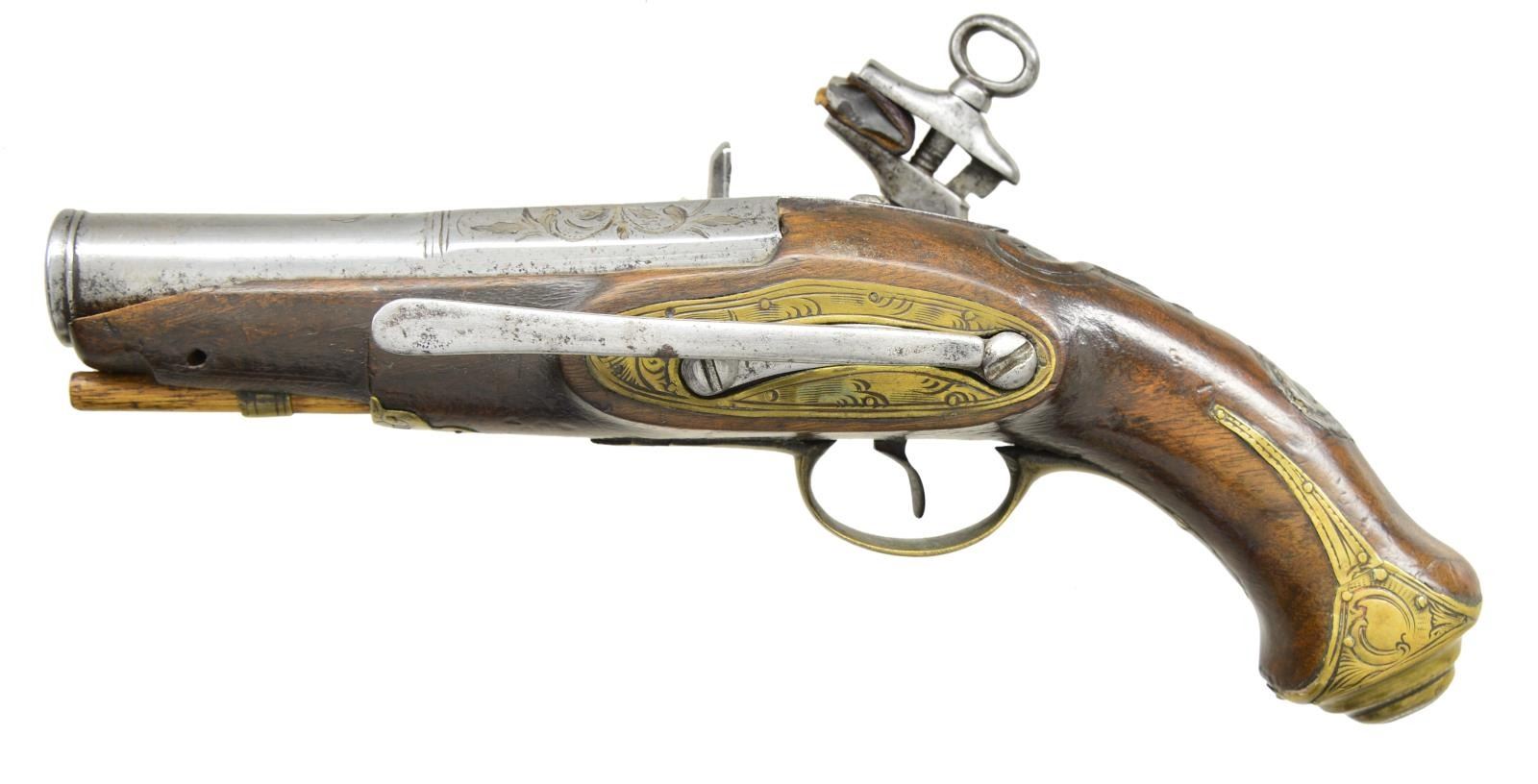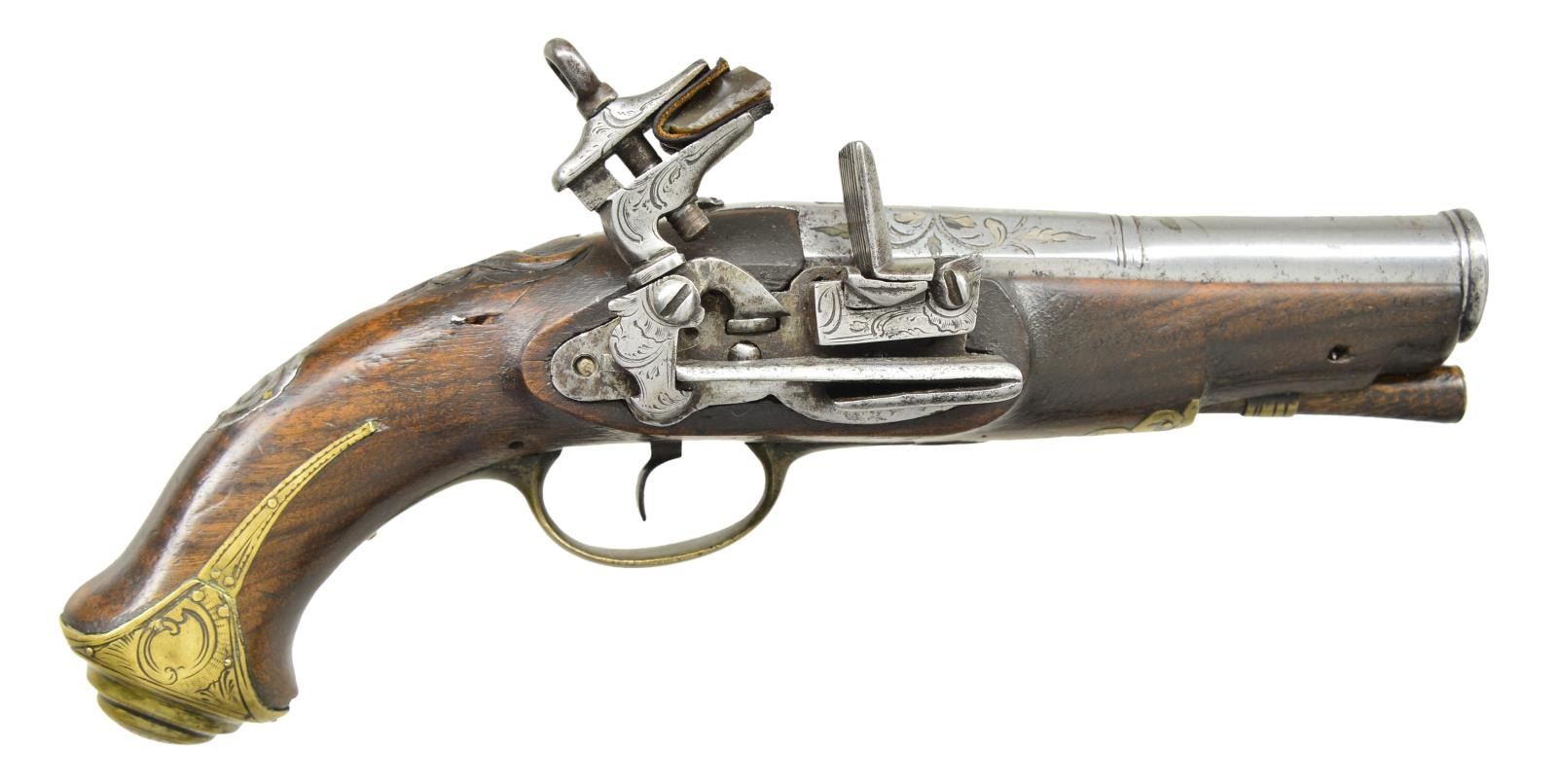 Cal. 14 bore (approx. 70 cal). 10” Overall, 3 1/4'' silver inlaid & engraved 2 stage cannon bbl. w/ indiscernible makers cartouche. Stepped brass butt cap engraved en suite to other brass mountings. European walnut stock w/ relief moulding rear of tang, pewter engraved thumb plate, 4” belt hooks. A rare pair of miquelets in matching original unrestored condition. CONDITION: good overall, metal is heavily worn, engraving still discernible, stocks sound, one ramrod is replacement w/out brass tip, one trigger guard tail cracked at tail, mechanically sound & clean smooth bores. (01-22259(2)/JS). ANTIQUE. $2,000-3,000.