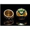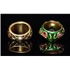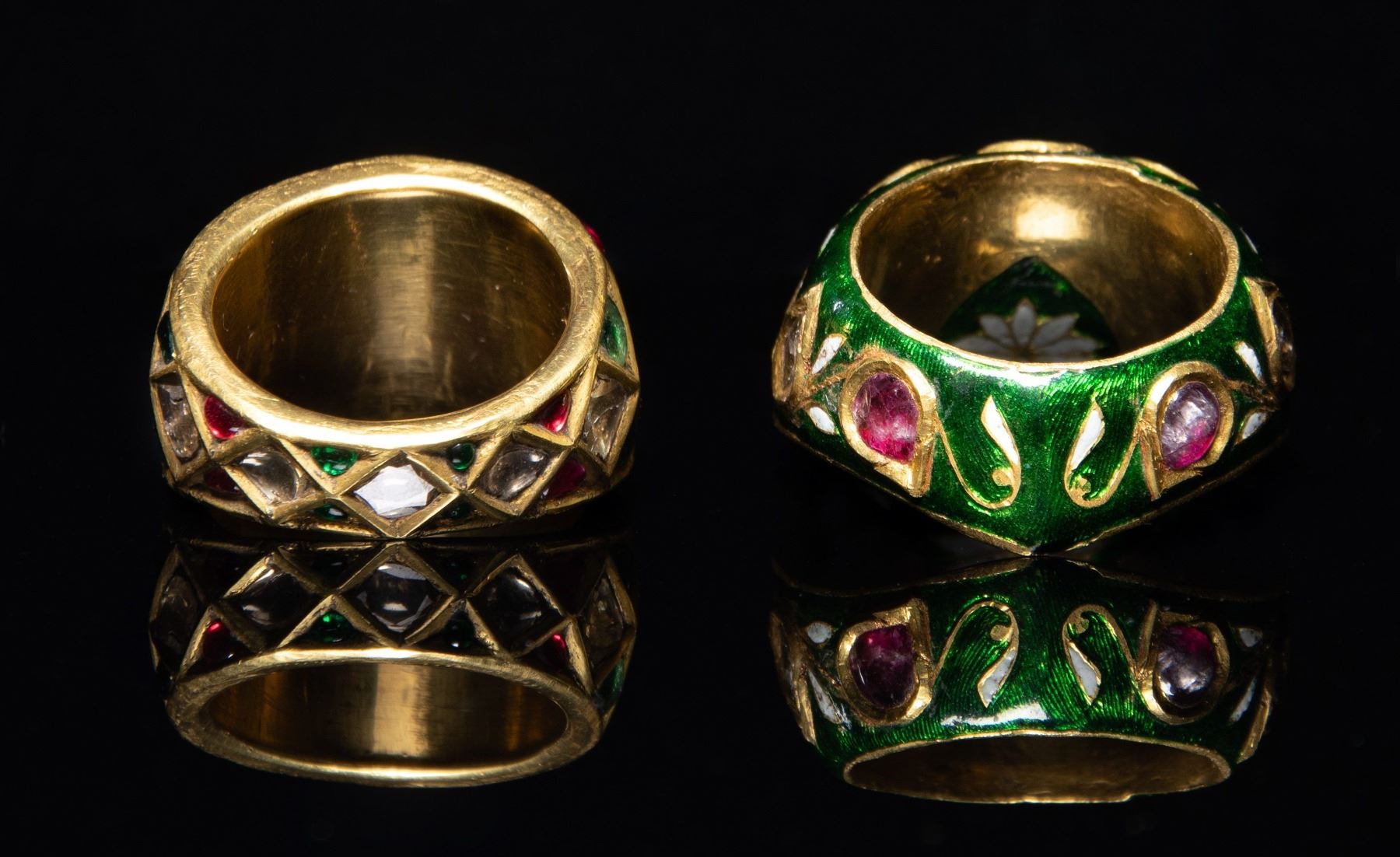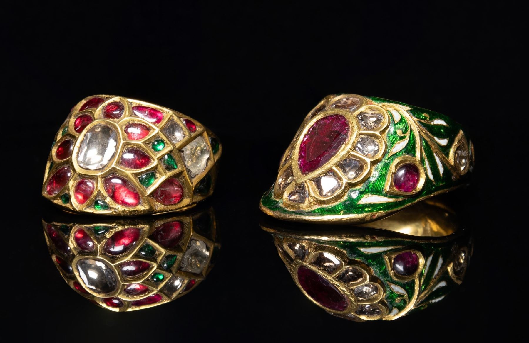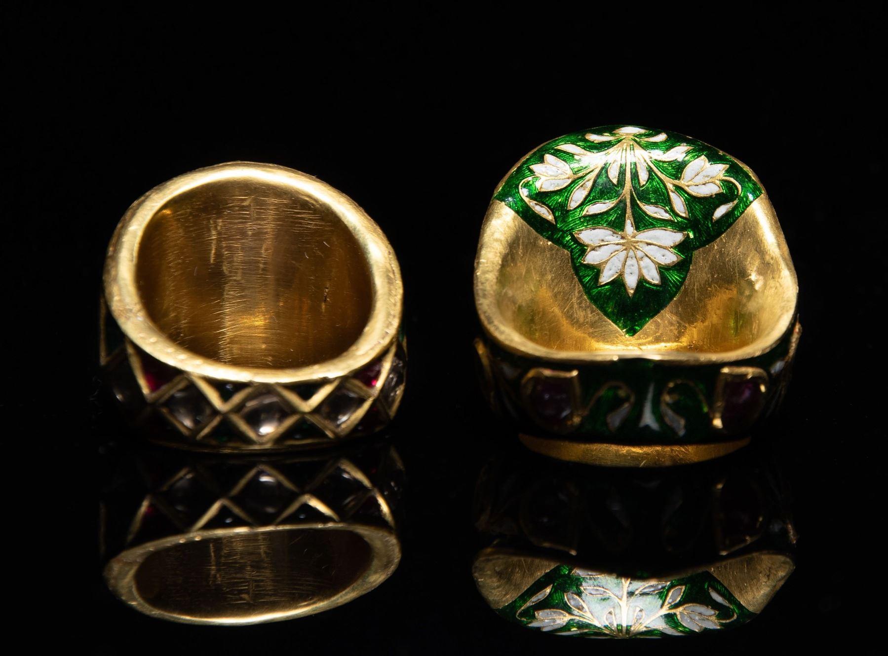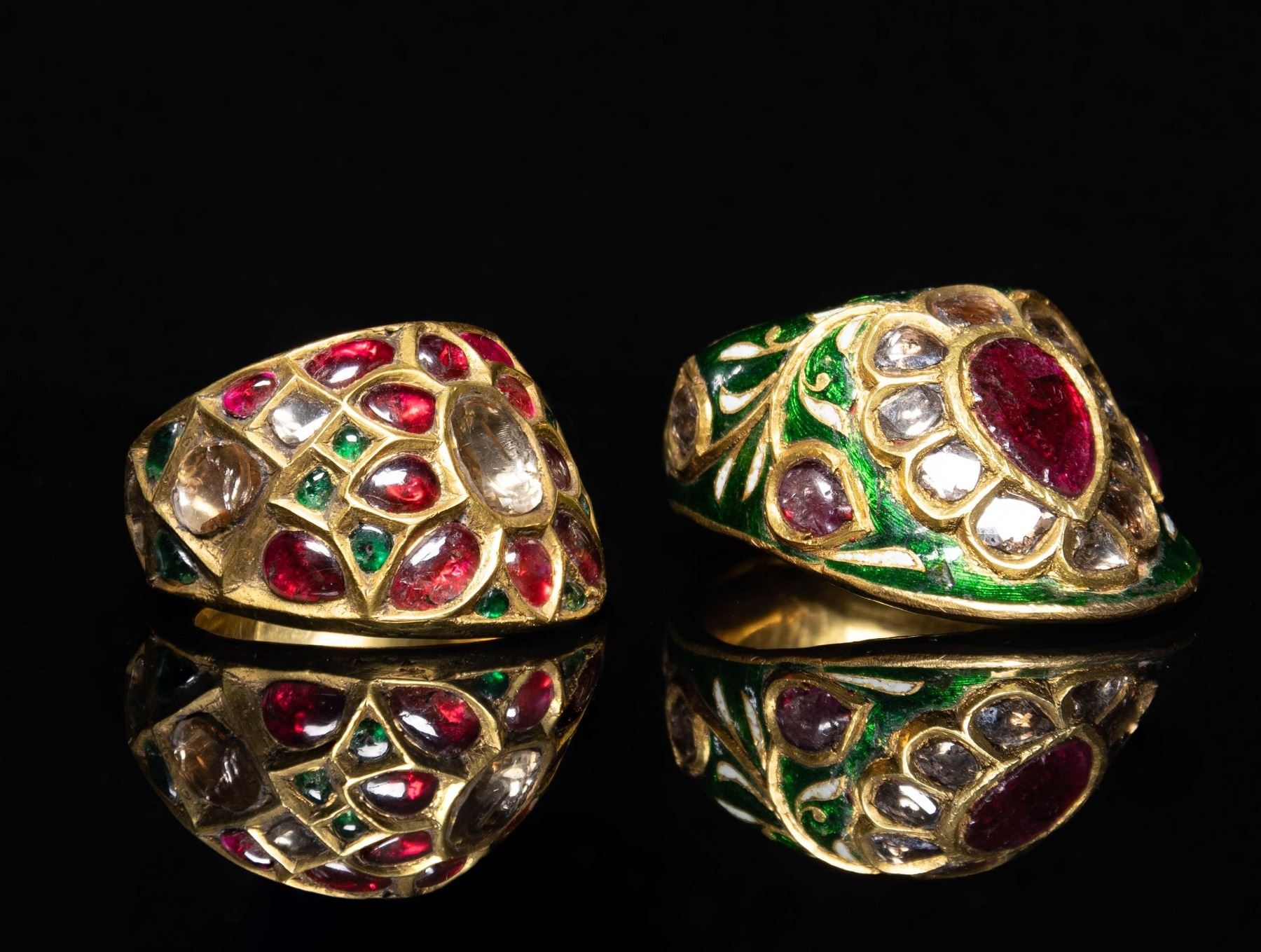 DIAMOND, RUBY, & EMERALD ARCHER'S RINGS. Archers' rings were worn on thumb, with asymmetrical construction to allow archers to release arrows with precision protecting inside of the thumb. Ornate jeweled & enameled examples were made as gifts for ceremonial purposes conveying rank and social status. The 2 rings weigh a total of 46 grams, and each has 10 diamonds which are "polki" or mine cut which was the original way raw diamonds were mounted in Indian Mughal jewelry for several hundred years. The largest diamond measures 8.5x6mm, the smallest are 3mm, the center ruby in one ring is 12x8mm. The diamonds were all tested with diamond tester and guaranteed to be diamonds, rubies and emeralds not tested but historically Indian/Mughal jewelry used combinations of these 3 stones. UNATTACHED ACCESSORIES: collection notes. CONDITION: both are very good to fine. PROVENANCE: Estate Collection of Dr. Curtis S. Morse. (02-25284/JS). NON-GUN. $4,000-8,000.