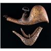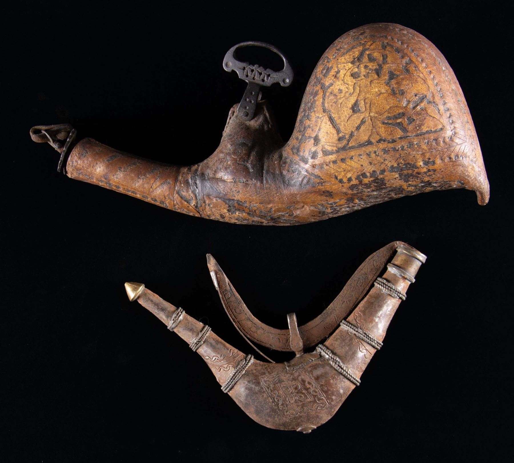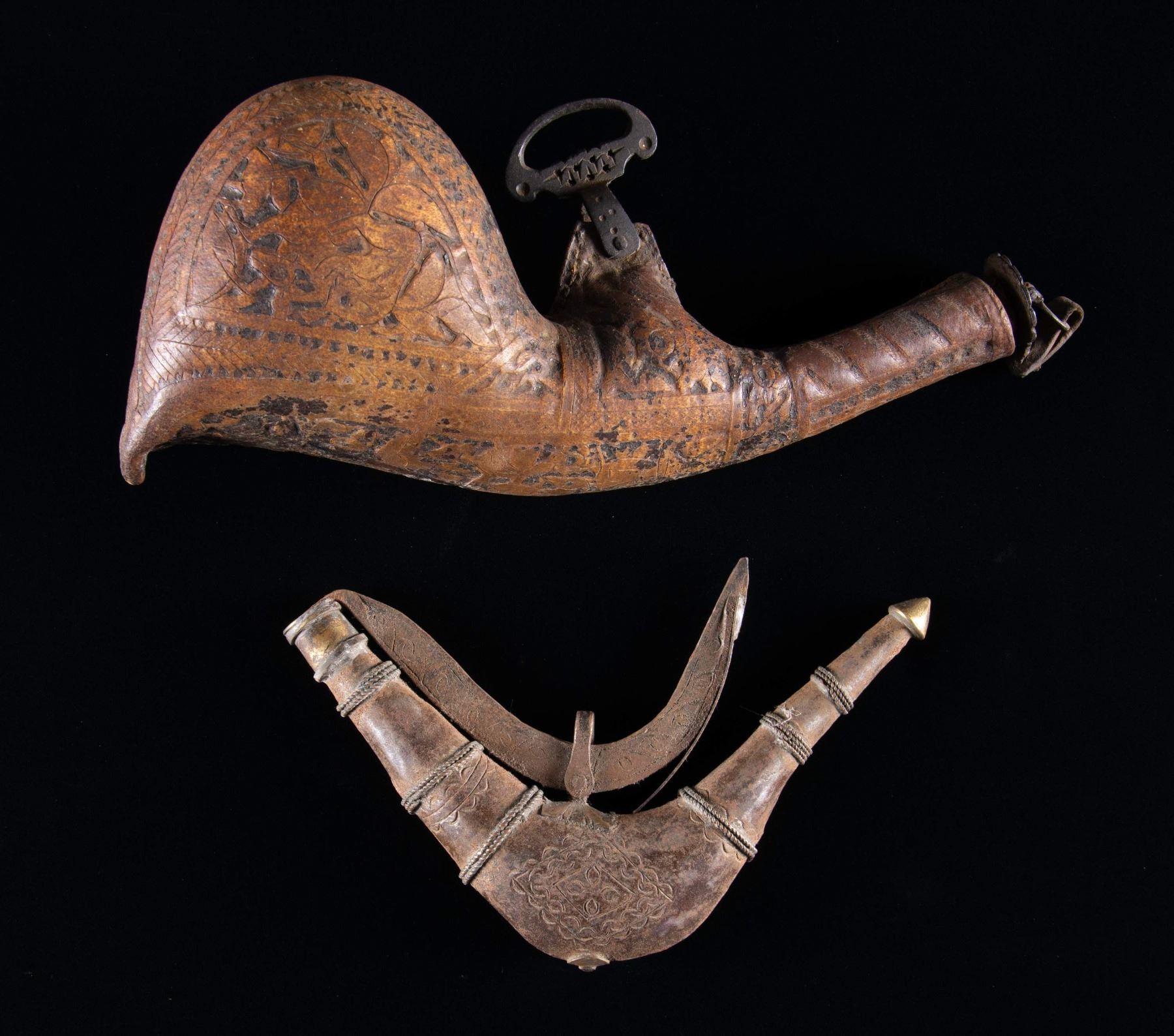 Large 12" embossed heavy leather with sculpted wrought iron sling swivel, pierced iron plug cap, Stone's Glossary describes these as Persian circa 1800. Other flask is braised iron with twisted copper wire & engraved decoration, spring loaded lever operates spout. CONDITION: good overall, iron patina, scuffed dry leather, both complete and functional. PROVENANCE: Estate Collection of Dr. Curtis S. Morse. (02-25283-4/JS). NON-GUN. $400-600.
