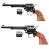 ACTION REVOLVERS WITH CASES & MATCHING FACTORY BOXES. 1) Cal. 22 LR. S# J18500. Bbl. 6 1/2". Rough Rider single action revolver mfg. by Heritage Manufacturing. Left side of bbl. is marked "HERITAGE ROUGH RIDER 22 LR". Left side of frame is marked with Heritage's mfg. information. Frame and trigger guard exhibit a black oxide finish, with the cyl., bbl., and ejector rod housing exhibiting a blue finish. Frame is mounted with 2-piece checkered wood grips. Blade front sight, with frame notched rear sight. UNATTACHED ACCESSORIES: matching factory box containing a wood and glass display case, as well as a .22 Magnum cyl. CONDITION: near new, with metal components retaining virtually all of their original factory finishes overall. Mirror bore, exhibiting well defined rifling throughout. Grips are excellent overall. Case and box are very good overall. (24-4687/MLW). 2) Cal. 22 LR. S# J18511. Bbl. 6 1/2". Rough Rider single action revolver mfg. by Heritage Manufacturing. Left side of bbl. is marked "HERITAGE ROUGH RIDER 22 LR". Left side of frame is marked with Heritage's mfg. information. Frame and trigger guard exhibit a black oxide finish, with the cyl., bbl., and ejector rod housing exhibiting a blue finish. Frame is mounted with 2-piece checkered wood grips. Blade front sight, with frame notched rear sight. UNATTACHED ACCESSORIES: matching factory box containing a wood and glass display case, as well as a .22 Magnum cyl. CONDITION: near new, with metal components retaining virtually all of their original factory finishes overall. Mirror bore, exhibiting well defined rifling throughout. Grips are excellent overall. Box is very good overall. Glass lid on display case has broken, but case otherwise remains sturdy and serviceable. PROVENANCE: The Estate Collection of Charles Wagner. (24-4688/MLW). BOTH MODERN. $300-400.