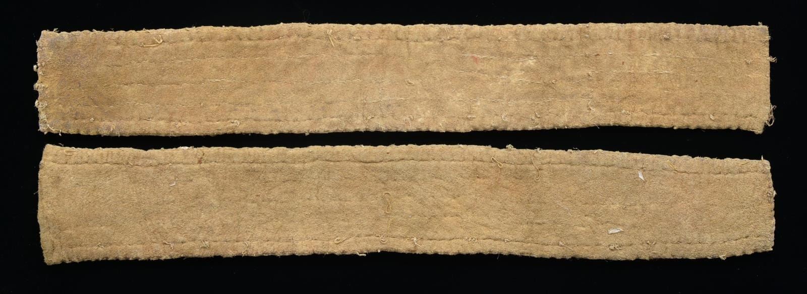 STRIPS. Each 18” x 2.5”, sinew sewn, white ground w/ red & black bands, small red triangles. CONDITION: very good overall, small loss of beads. (02-14570/JS). $4,000-5,000.