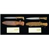 KNIVES WITH SHEATHS. Here is a pair of rarely encountered “New Caledonia” fighting knives, larger grips & blades, but same manufacturing characteristics: 1) 13" overall, 8" blade, 1.1" wide. 2.5" guard hand-engraved “Noumea” and “New Caledonia”. L-shaped stag grip attached with 2 iron pins. Very good overall with accompanying Brown leather sheath. Unattached accessory: hand-drawn card by Roger Ballard 2) 13" overall, 8.25" blade, 1.3" wide, unmarked 2.5" thick brass ovoid cross guard, slightly curved tapered out stag grip fits and nicely. Accompanied by buck stitched brown leather holster. Very good overall. Unattached accessory: hand-drawn card by Roger Ballard. PROVENANCE: Roger Ballard collection. (02-15165/JS). $600-900.