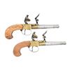 Cal. 32. NSN. Cannonade 3 1/4" barrels. Brass flintlock actions. Hardwood bag type grips. CONDITION: bright barrels shows spots of patina. Brass shows scratches & patina. Very good wood finish with handling marks. Good smoothbores. (01-25260/MD). ANTIQUE. $200-400.