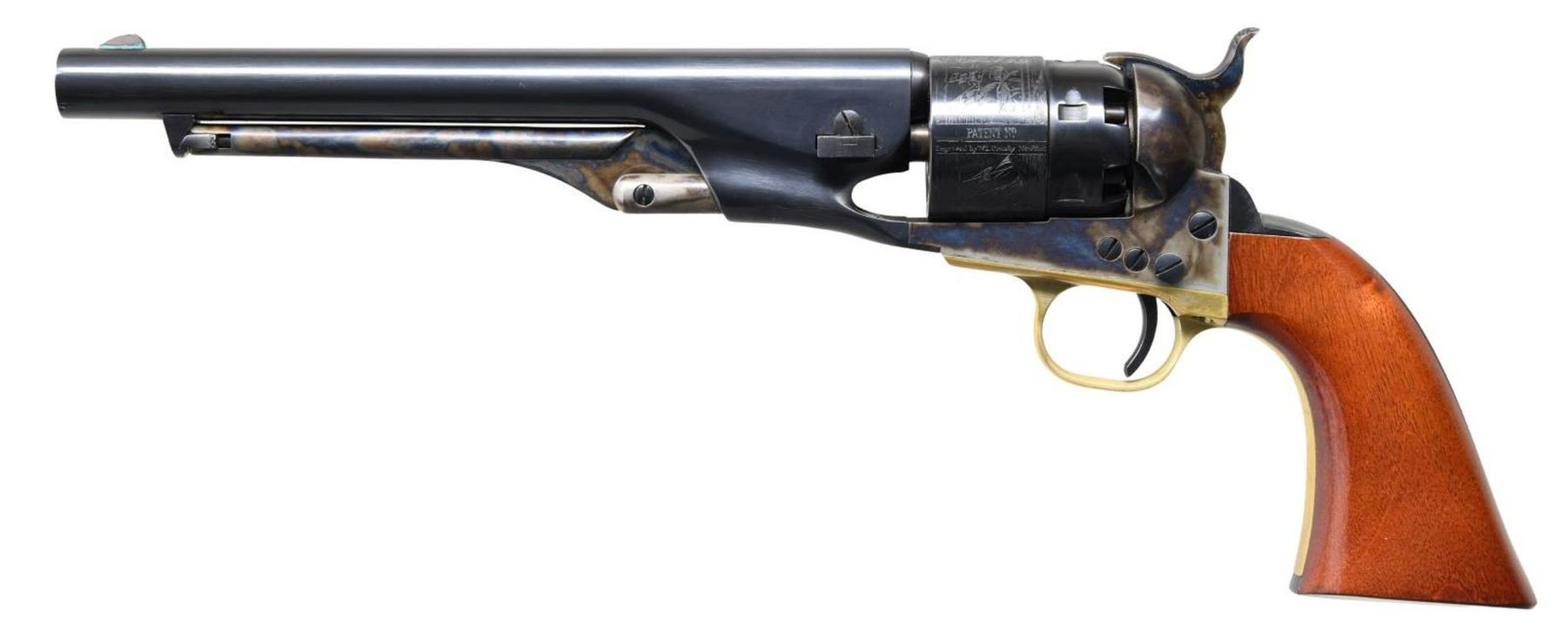Both. Cal. 44. S# A82708 & A82743. Bbls. both 8". Round blade front sights. Pair of Uberti 1860 Army cap & ball revolvers. Blued bbls. and cyls. with engraved naval scenes. Case-colored loading levers, frames, and hammers. Brass trigger guards. Walnut grips. UNATTACHED ACCESSORIES: display case with key. CONDITION: all aspects rate very good or better with some light handling and usage wear. (01-24911/MJC). BOTH ANTIQUE. $350-550 for lot.