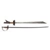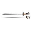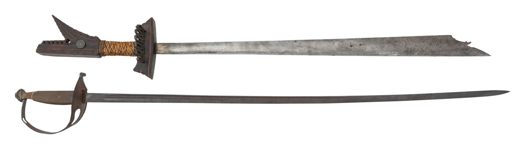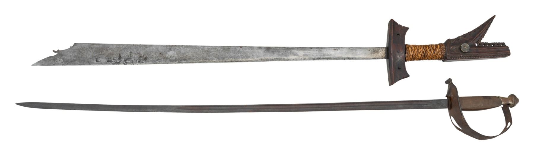 1) Large 19th century Mindanao Moro Kampilan Sword, 38" overall, beautiful carved hardwood handle inset with 2 silver 10-centavo coins, crack repair to handle, otherwise very good, very sharp bright blade. 2) Italian model 1929 NCO sword, guard unattached at pommel, dark pitted blade, Indiscernible makers mark. (02-24362, 02-24363/JS). BOTH NON-GUN. $200-400.