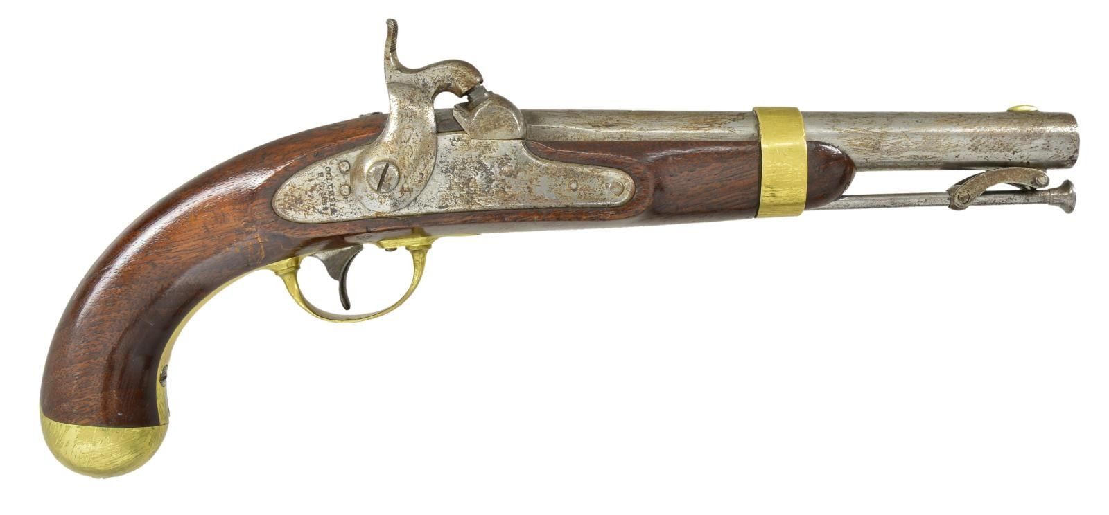 SHOT PISTOL. Cal. .54. NSN. Norm Flayderman warns readers in his price guides that fakes of this pistol have been made since the 1950s using Aston and Johnson parts. That is not the case here. William Glaze markings on barrel are poor copies but the Palmetto Armory lockplate is original but in poor condition. The stock is from a US gun with cartouches punched out. CONDITION: good overall, mechanics fine, clear smooth bore. (01-21473/JS). ANTIQUE. $800-1,200.