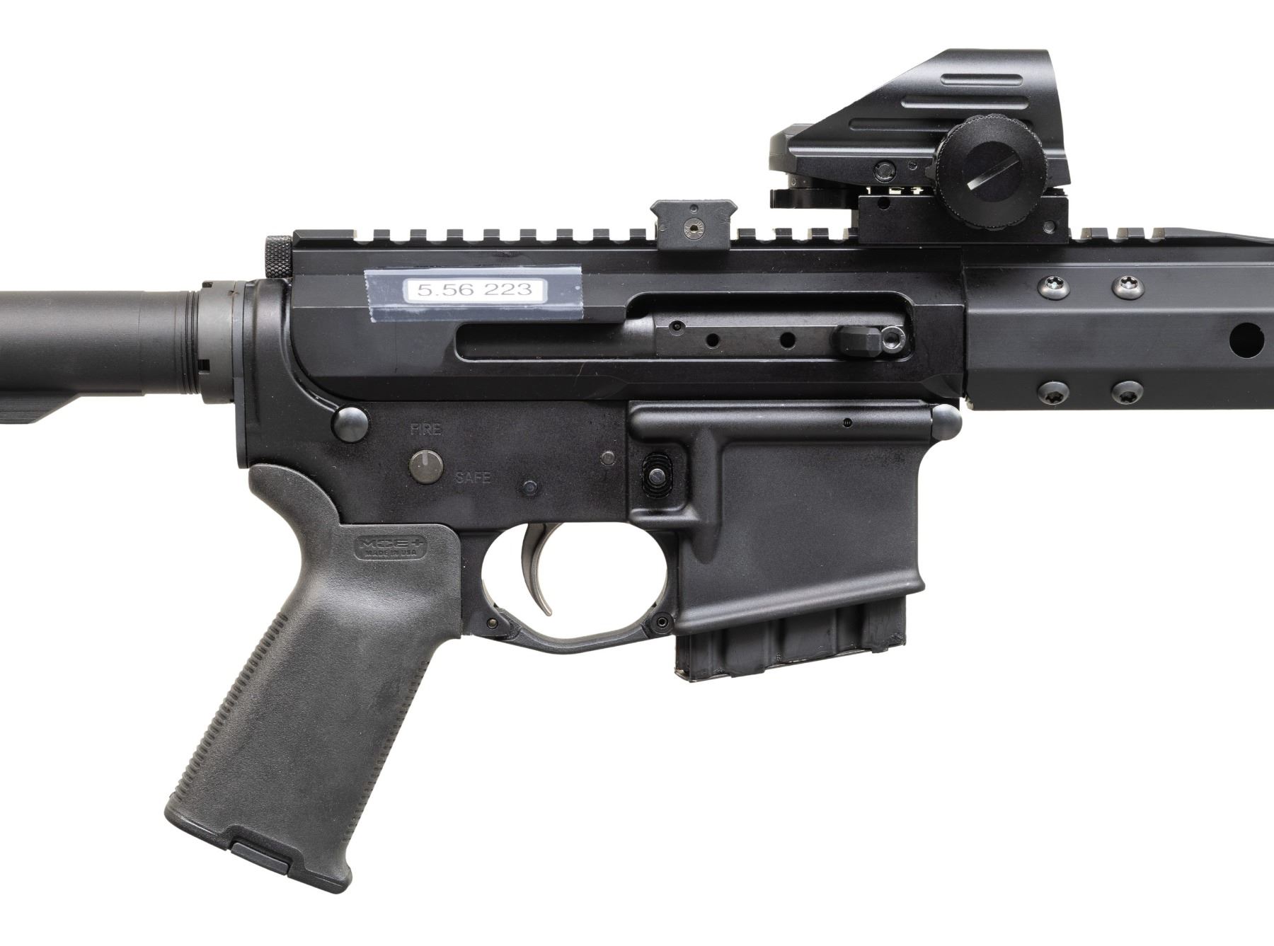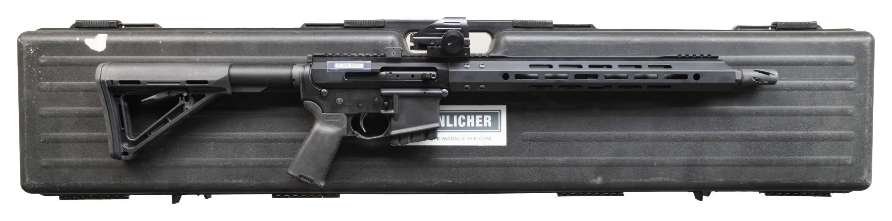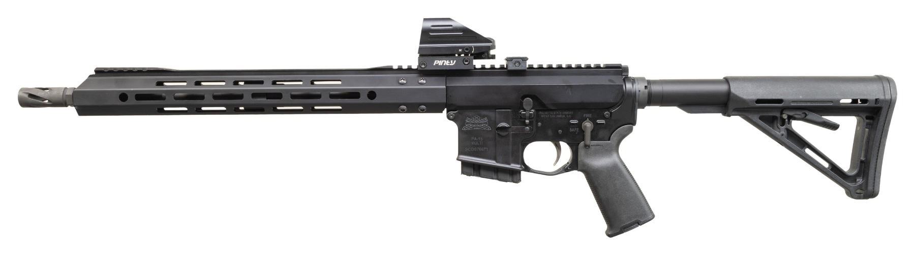 RECEIVER. Cal. 5.56 NATO. S# SCD076671. Bbl. 16". 1:8 barrel terminated w/ spiral flash hider. 15" free floating handguard. Flat top, right-side charging upper receiver. Piney electronic sight. 6 position buffer tube w/ Magpul MOE collapsible shoulder stock. MAGS: 2 -10 rd. UNATTACHED ACCESSORIES: Black plastic transport case, brass catcher. CONDITION: All aspects indicate very little use. Sight appears to function as intended. Bright bore w/ strong rifling. Fire control mechanism appears to function correctly when cycled by hand. (25-6105/JZ). MODERN. $500-700.