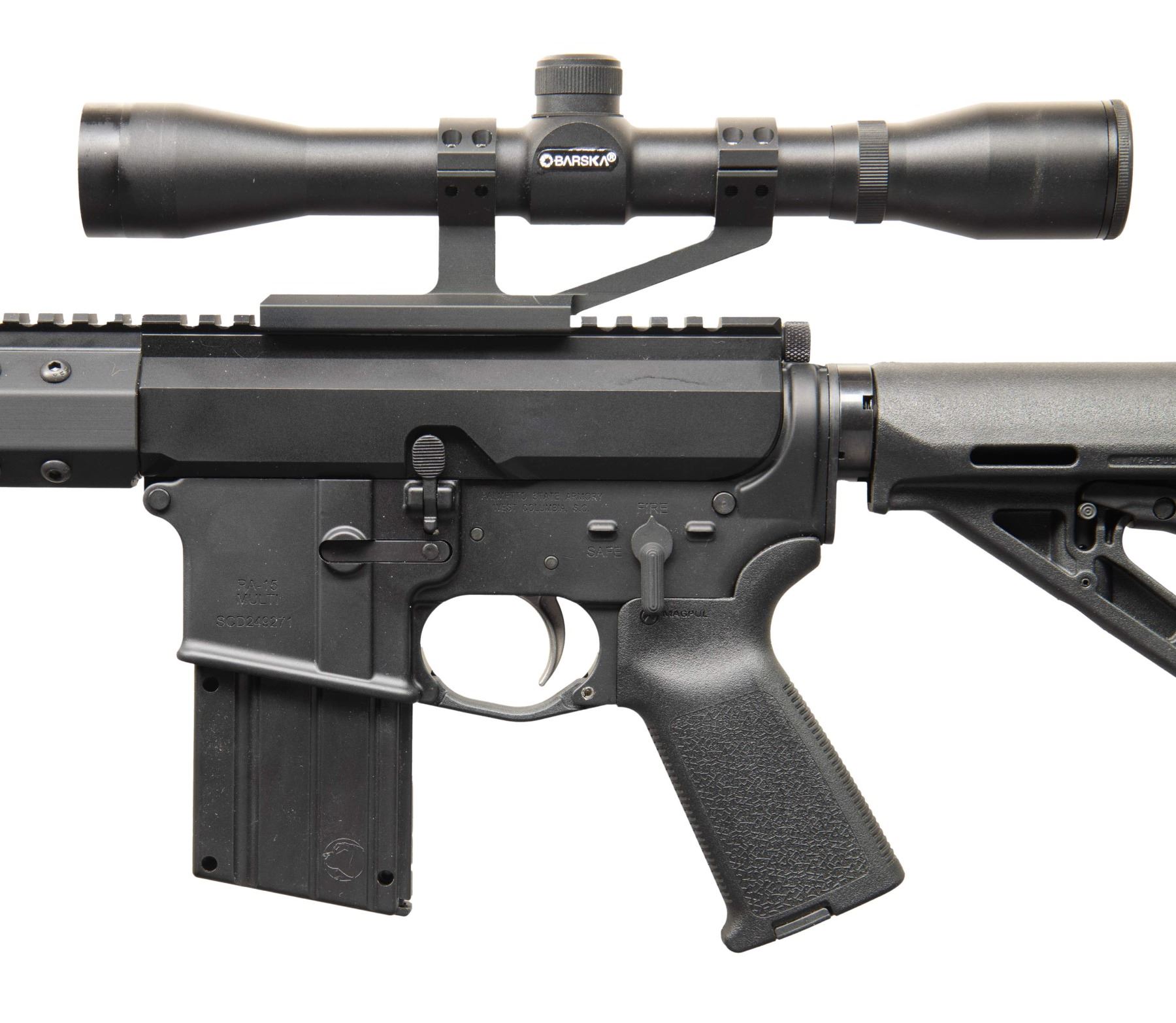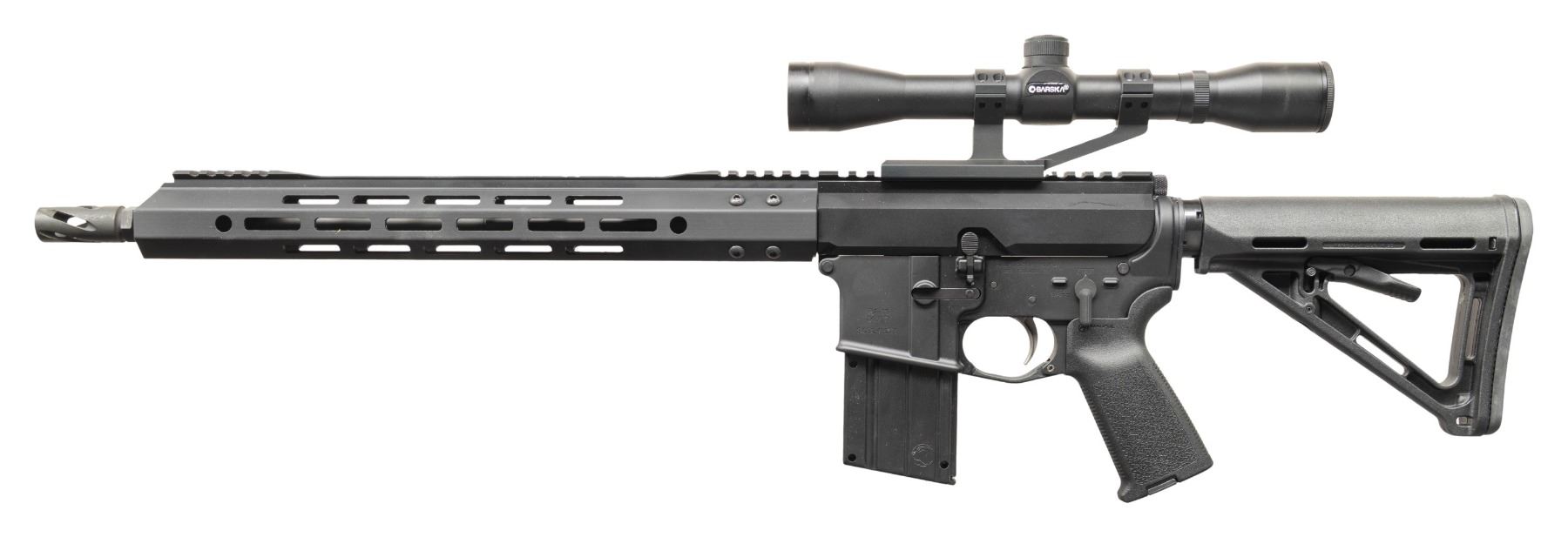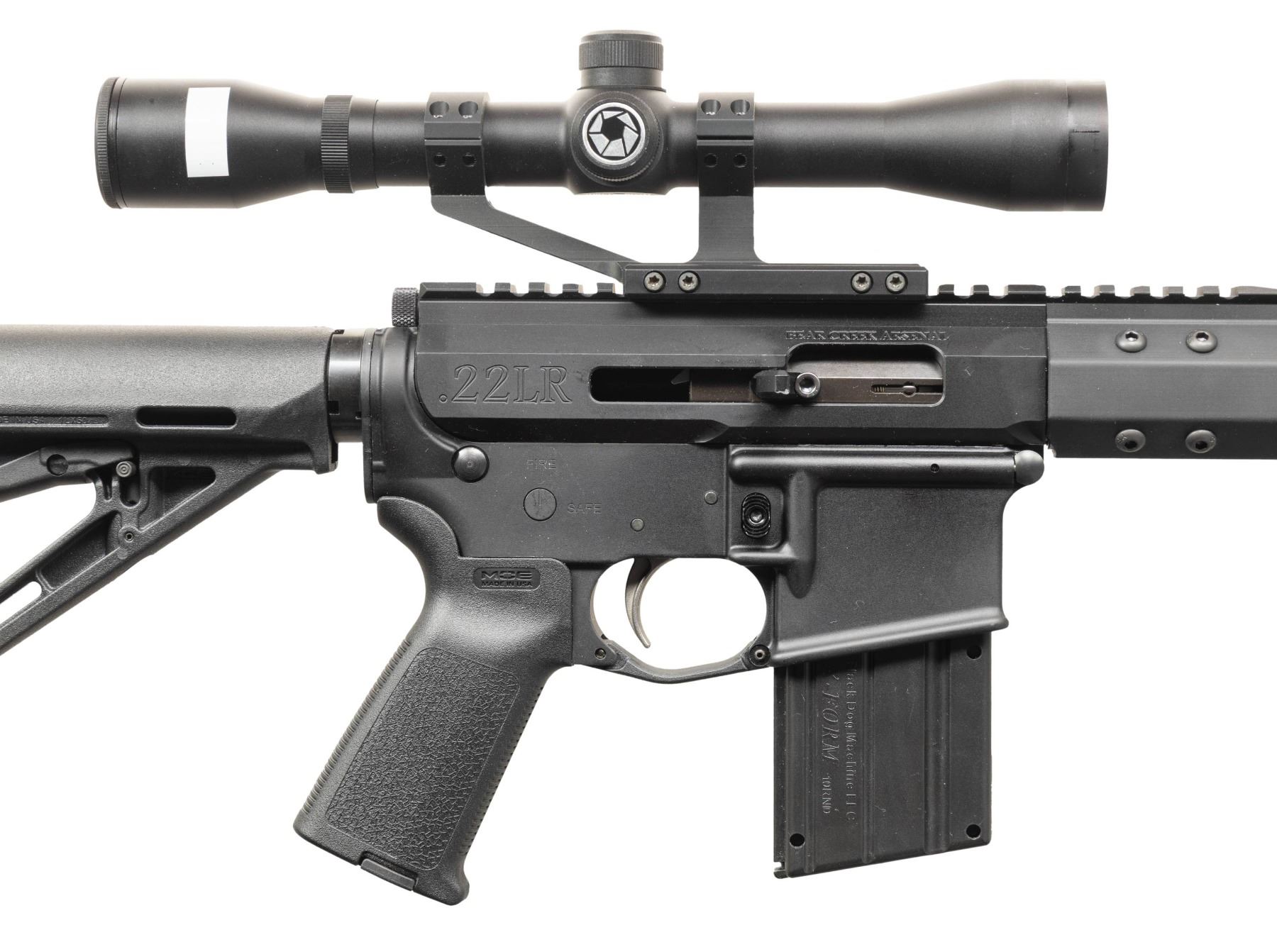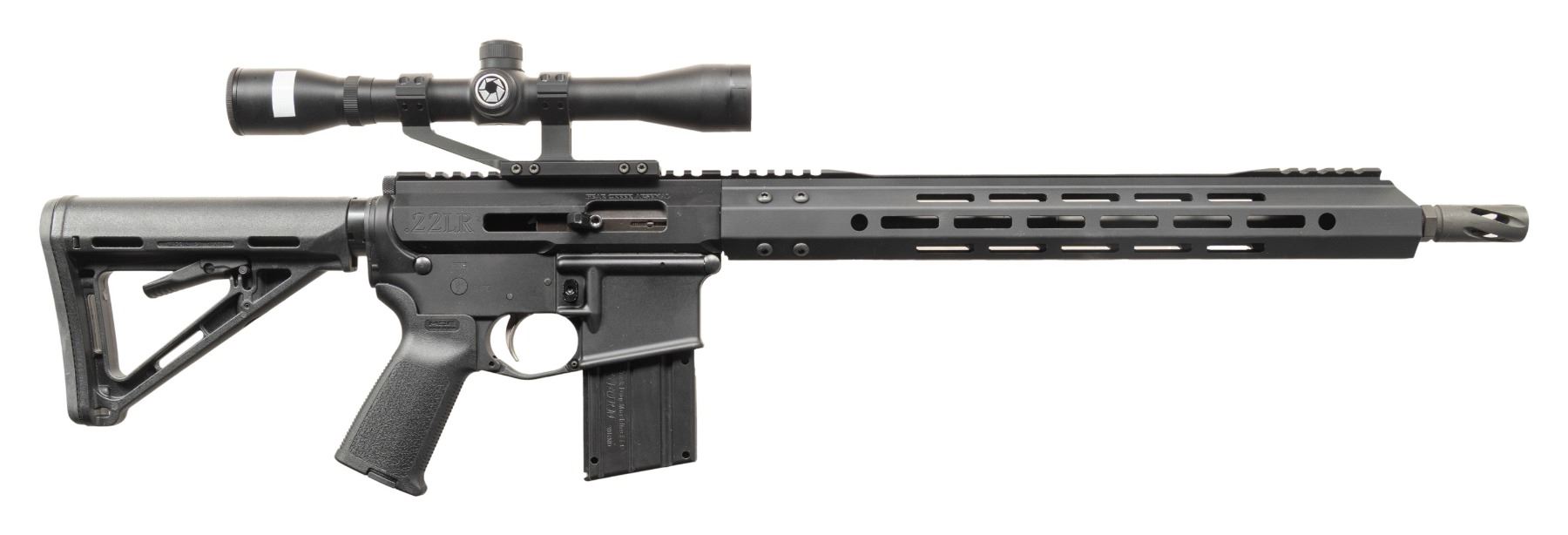 SIDE CHARGING UPPER RECEIVER. Cal..22LR. S# SCD249271. Bbl. 16". Barrel terminated w/ spiral flash hider. 15" free floating handguard. Flat top, right-side charging Bear Creek upper receiver. Currently sporting Barska scope w/ duplex reticle. 6 position buffer tube w/ Magpul MOE collapsible shoulder stock. MAGS: 1 plastic 9 rd. CONDITION: All aspects indicate very little prior use. Finish complete & consistent. Bright bore w/ strong rifling. Fire control mechanism appears to function correctly when cycled by hand. (25-6104/JZ). MODERN. $400-700.